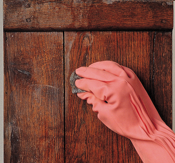 1. Fukt en dott av stålull nr. 0 med møbelrensen.