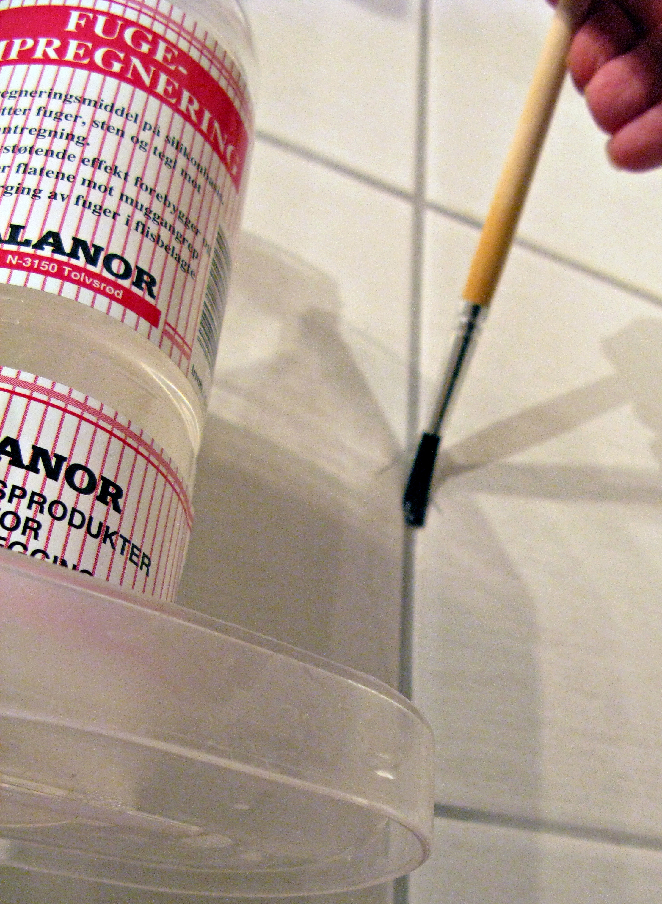 1. Påfør fugeimpregneringen rikelig. Impregneringen selges i pumpeflasker for enkel påføring, men metoden fører til at en del impregnering vil komme på flisene. Der gjør den ingen nytte, men heller ingen skade. Ved bruk av pensel kan vi styre påføringen til kun fugen og få en mer gjerrig påføring.
