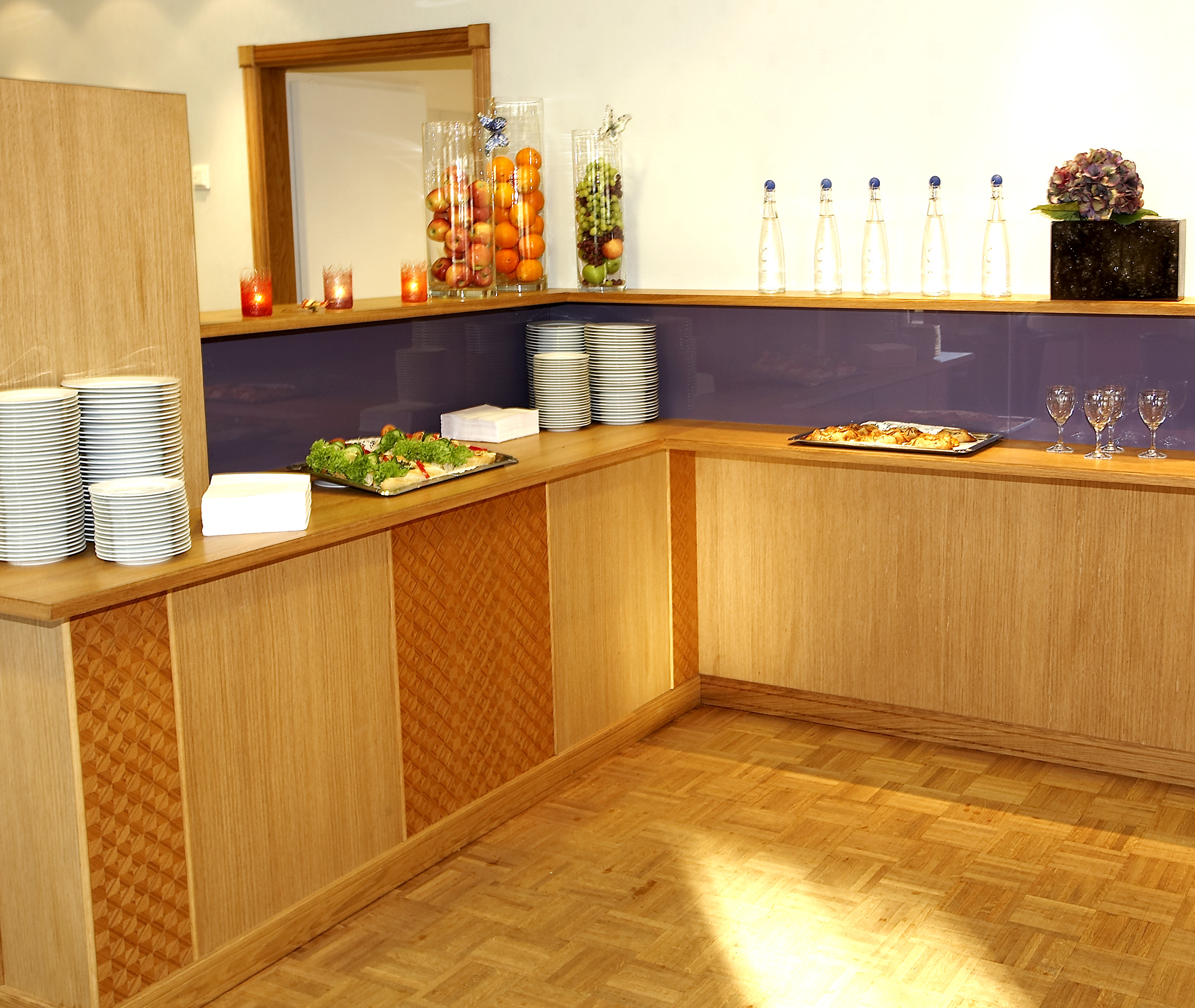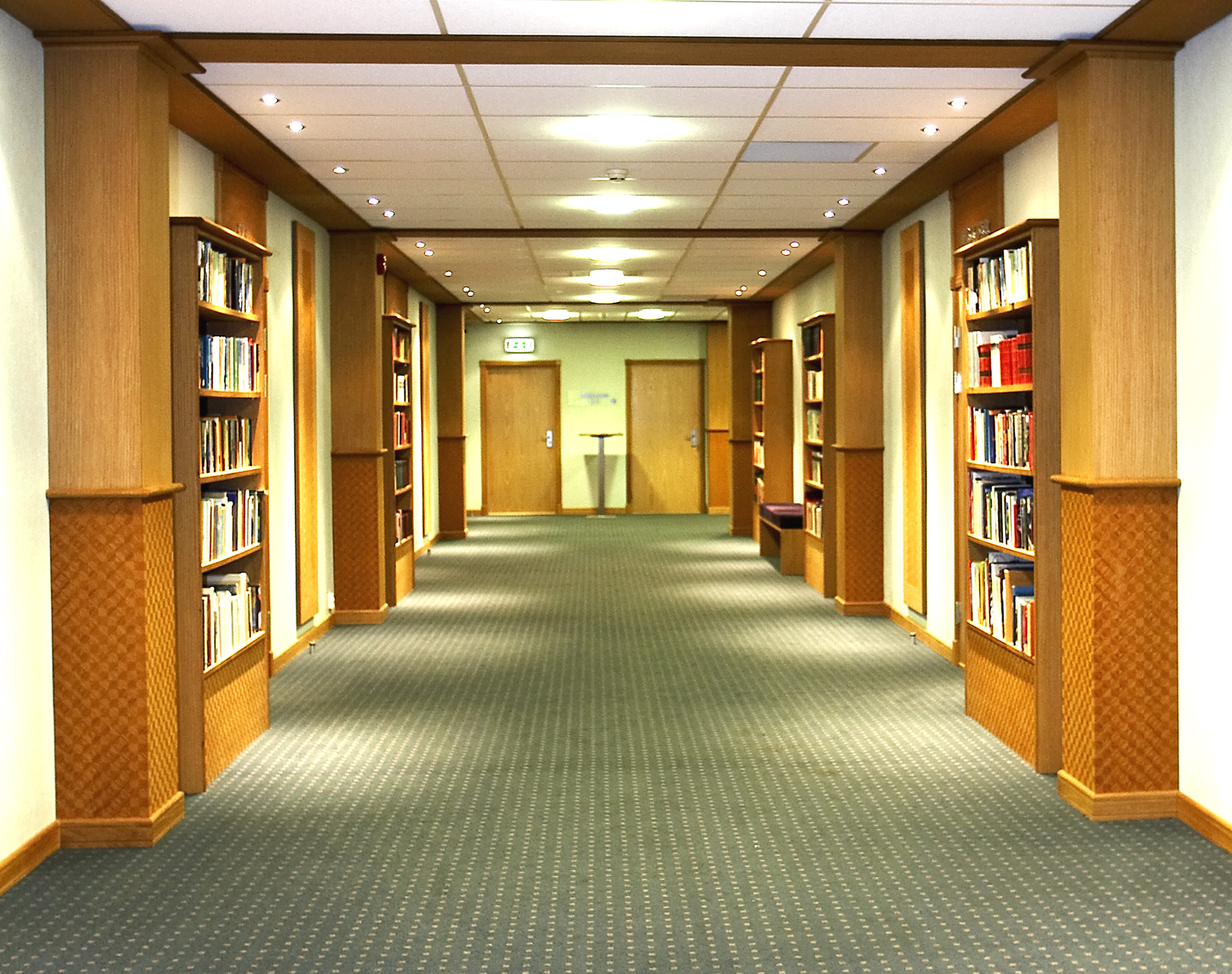 I korridorer og serveringsområdet er søyler, bokhyller og disker kledd med finér - i både rutet og glatt utgave. Finéren leveres i ark og monteres på underlaget.