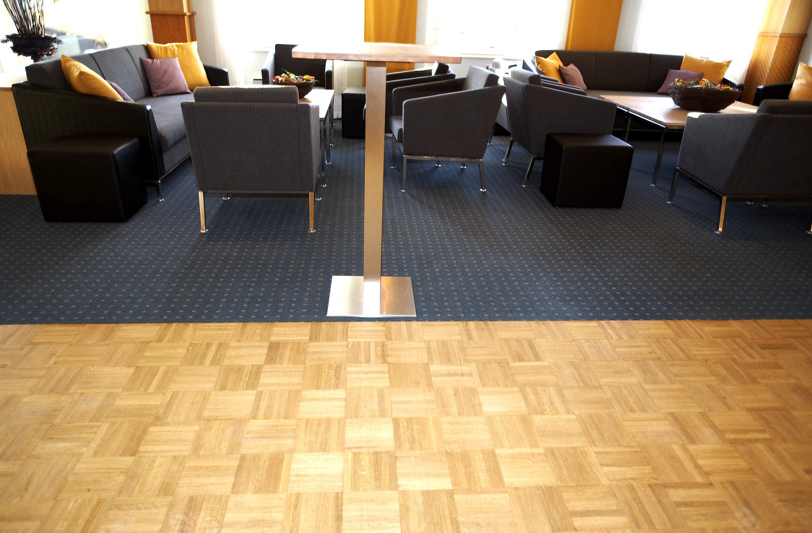 Den samme kombinasjonen av mosaikkparkett og teppe er brukt i auditoriet. I møterommene er det lagt tradisjonell stavparkett.