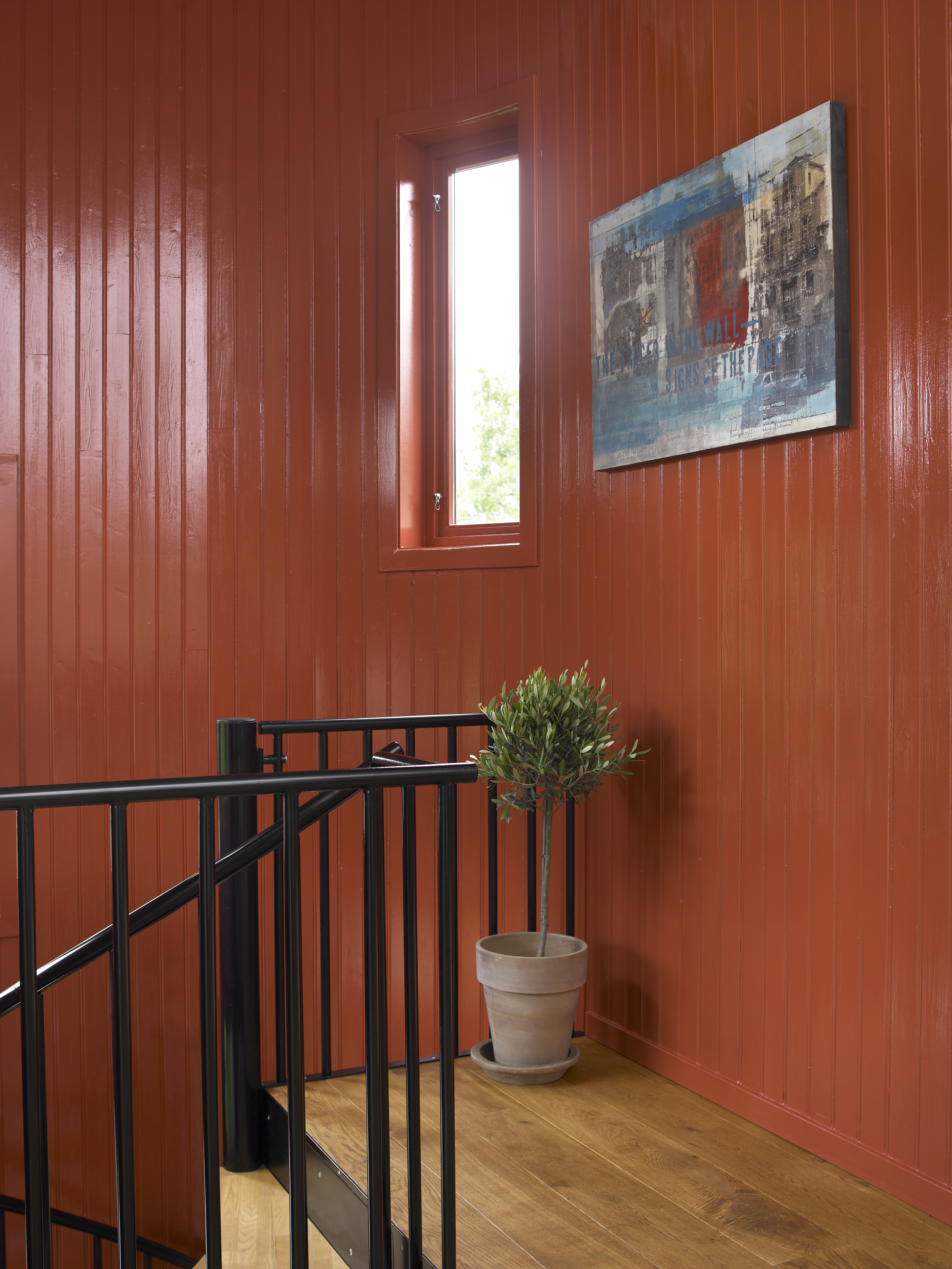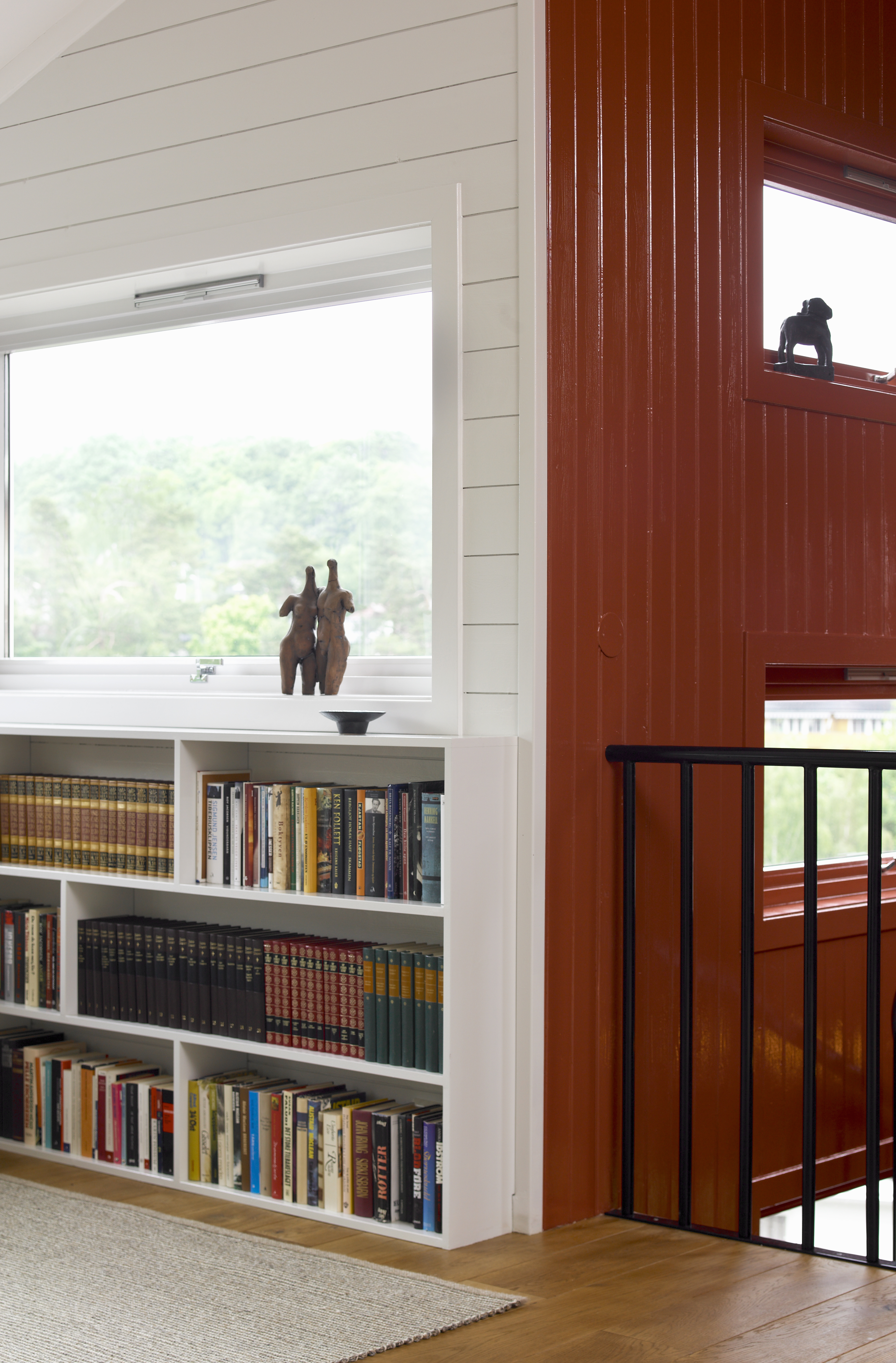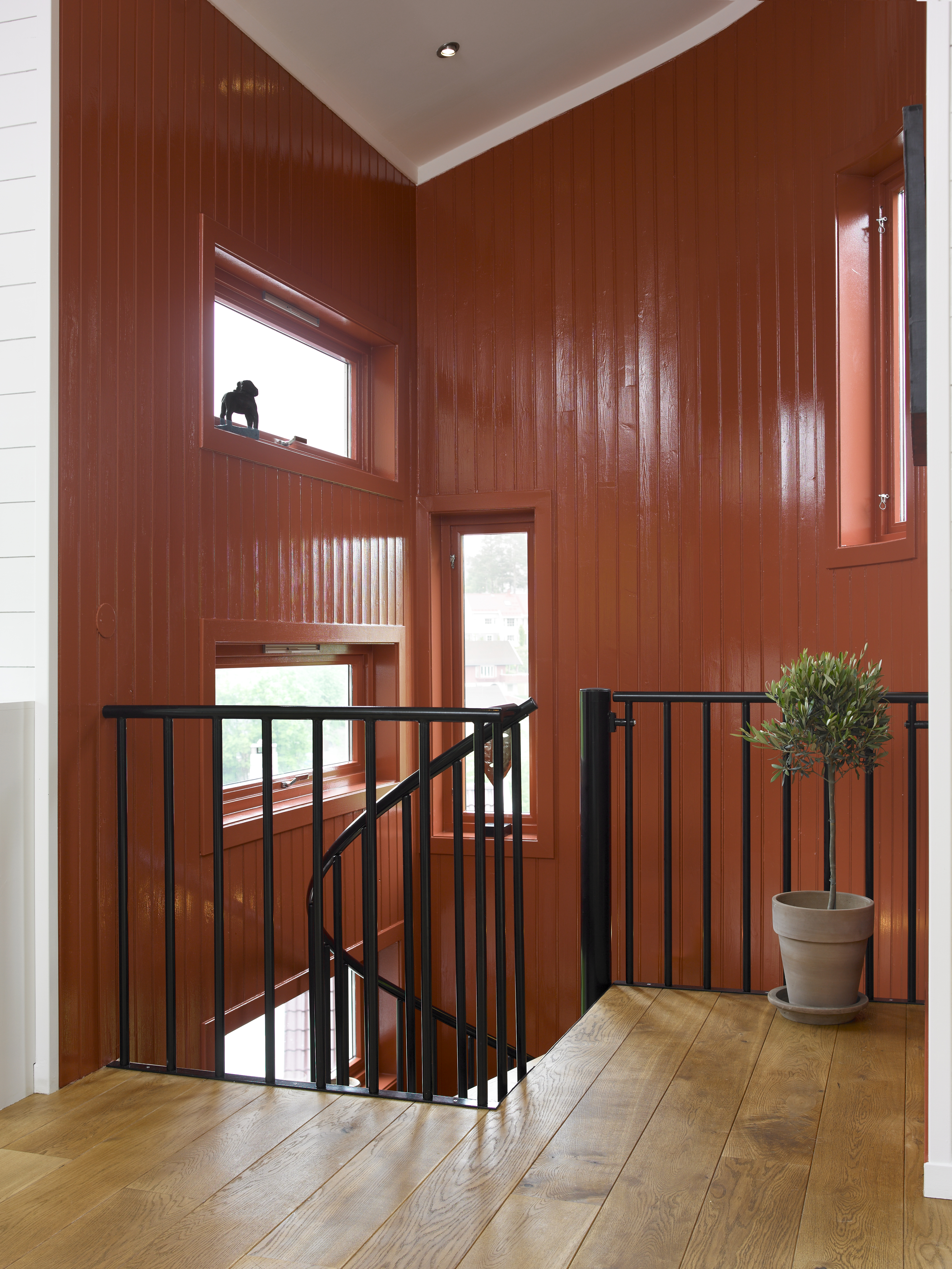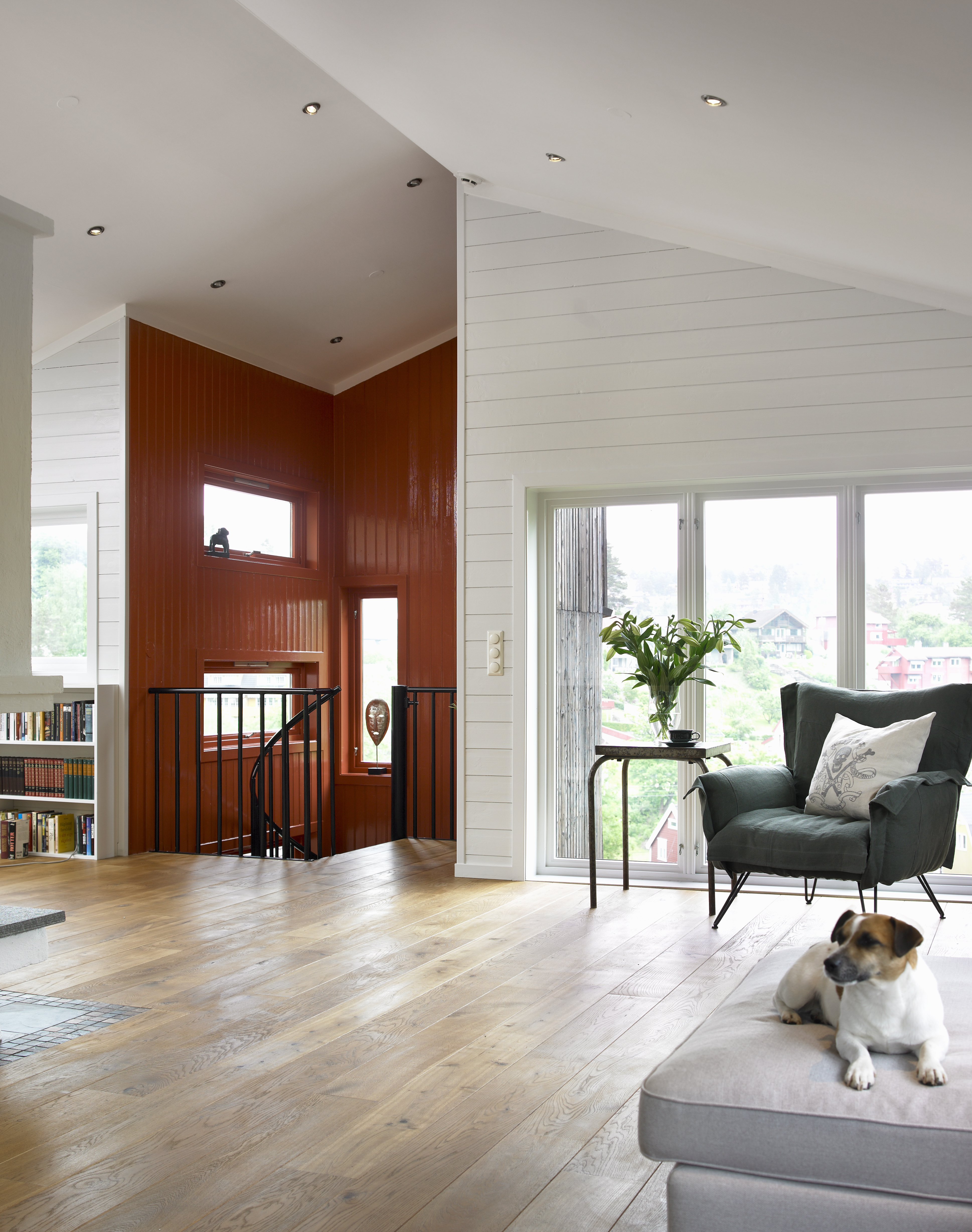 – I dette store rommet skjer det mye, i form av asymmetriske takvinkler og vinduer som slipper inn mye lys, samt at det ikke finnes en hel veggflate. Familien ønsket ikke gardiner, så her måtte det skapes lunhet og sammenheng på andre måter. Vinduer, gulvlister og de fleste veggene er derfor holdt i samme, lyse farge. Med rødoransje trappegang, en mørk, gråmalt vegg og en annen med lekkert tapet er det ingen fare for kjedsomhet her, sier Ellen.
