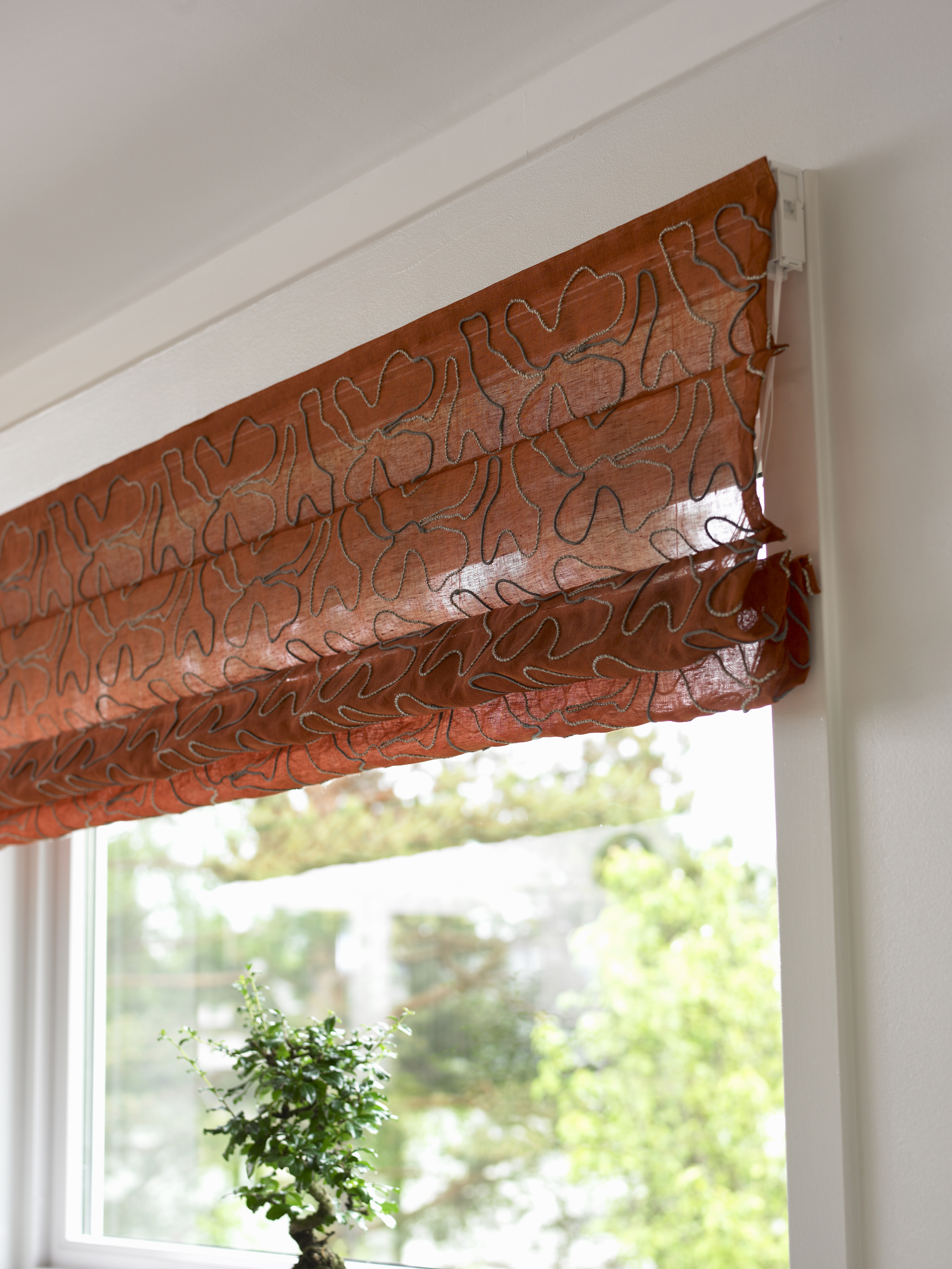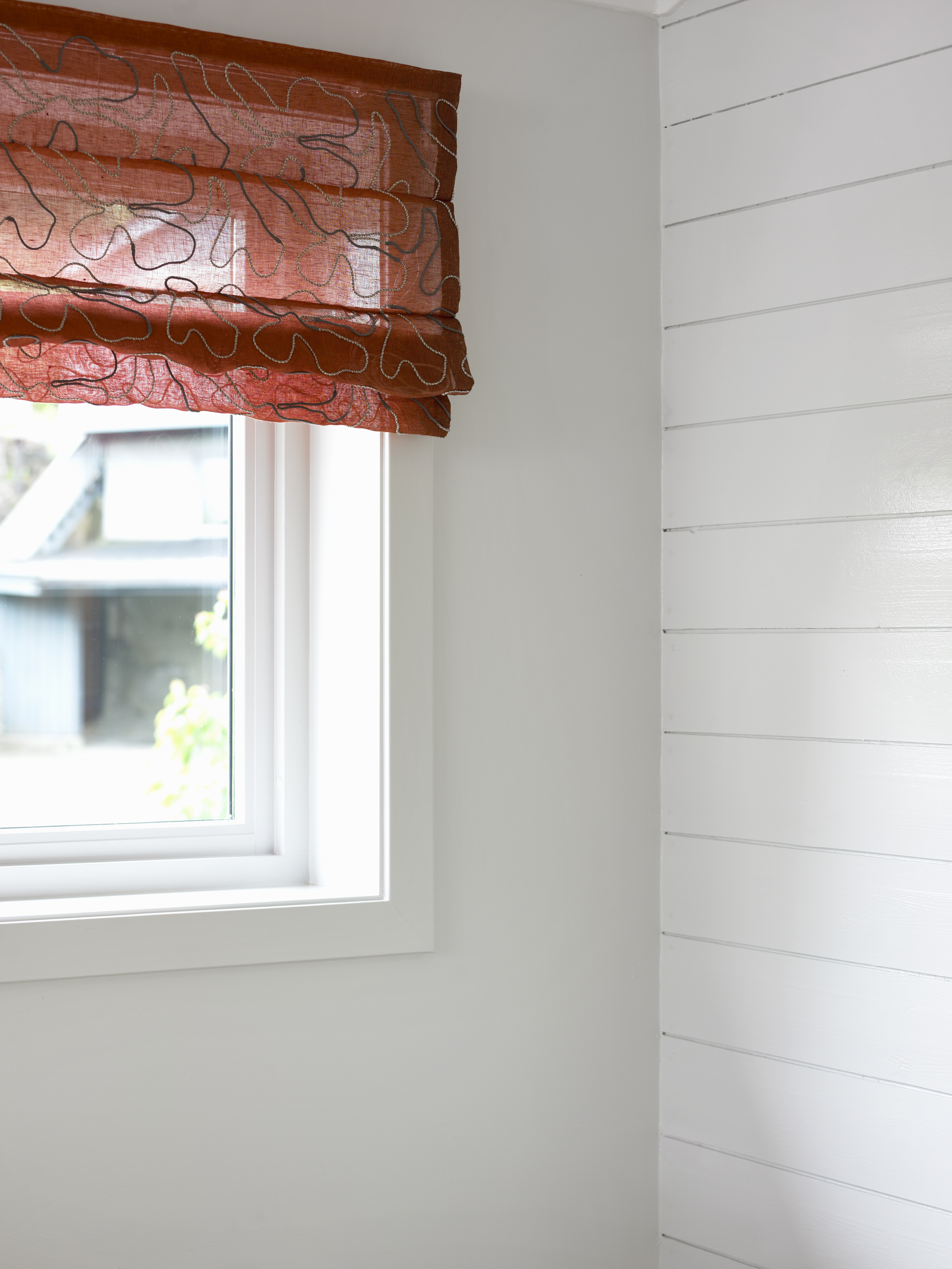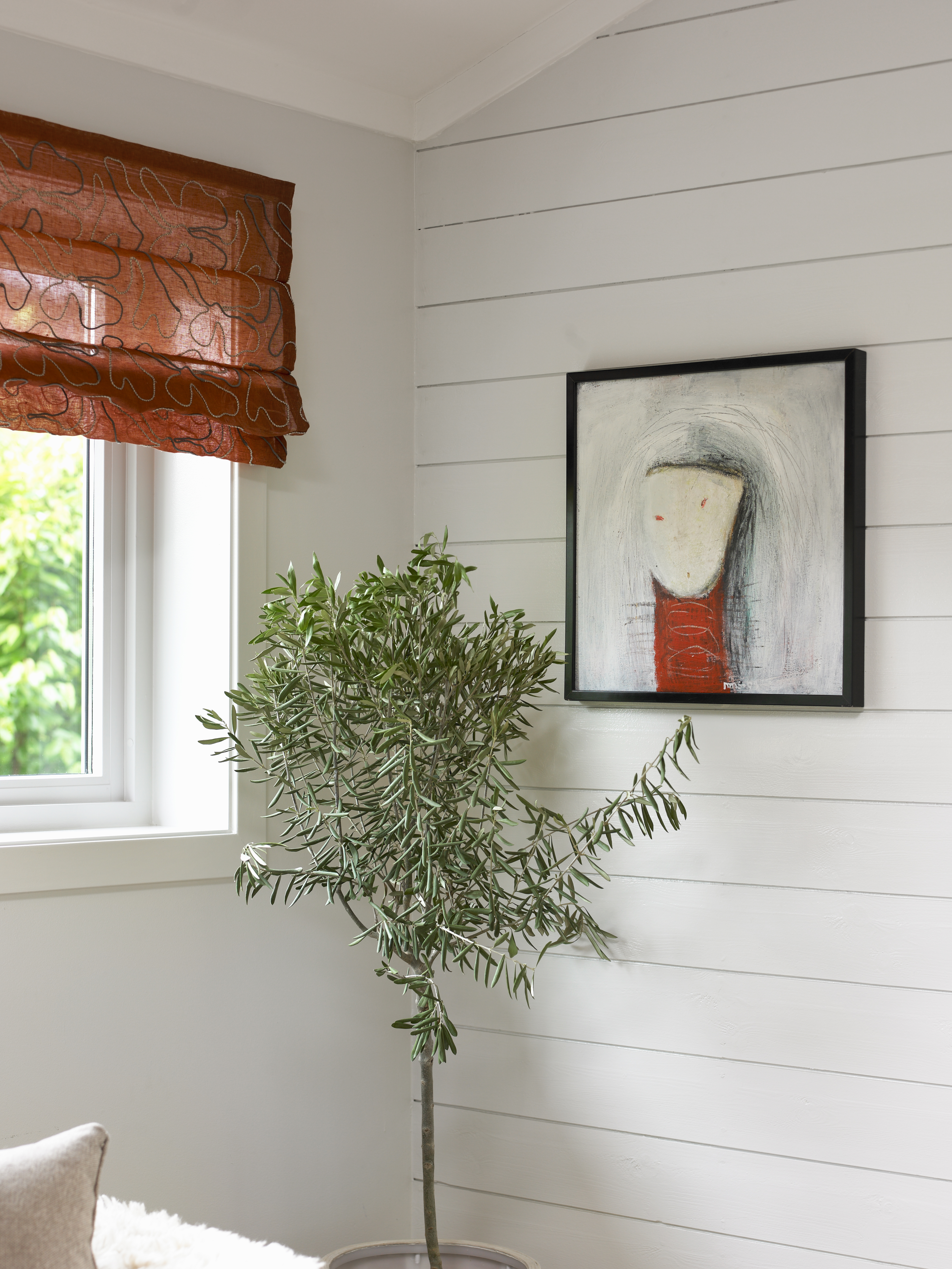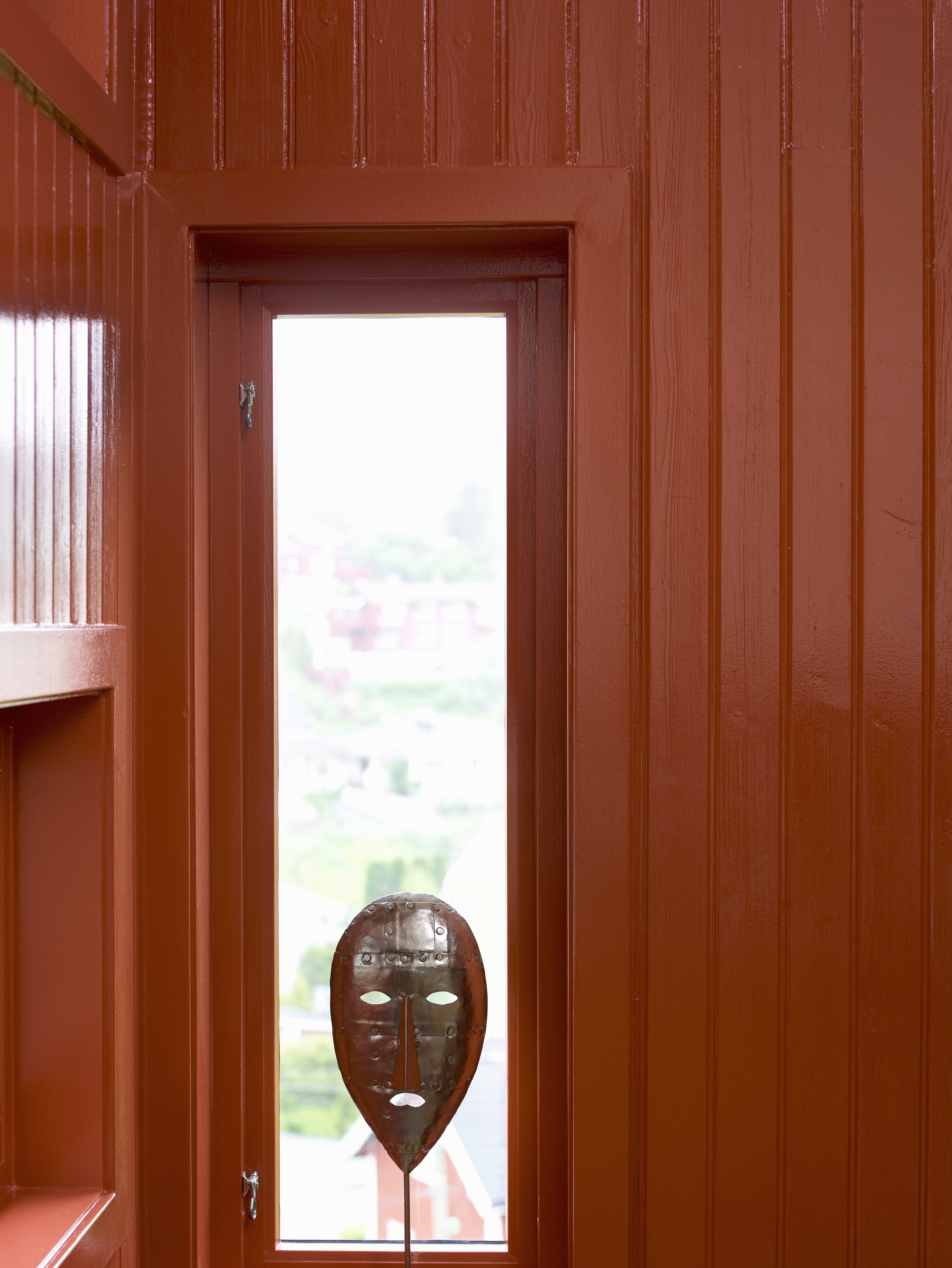 – I dette store rommet skjer det mye, i form av asymmetriske takvinkler og vinduer som slipper inn mye lys, samt at det ikke finnes en hel veggflate. Familien ønsket ikke gardiner, så her måtte det skapes lunhet og sammenheng på andre måter. Vinduer, gulvlister og de fleste veggene er derfor holdt i samme, lyse farge. Med rødoransje trappegang, en mørk, gråmalt vegg og en annen med lekkert tapet er det ingen fare for kjedsomhet her, sier Ellen.