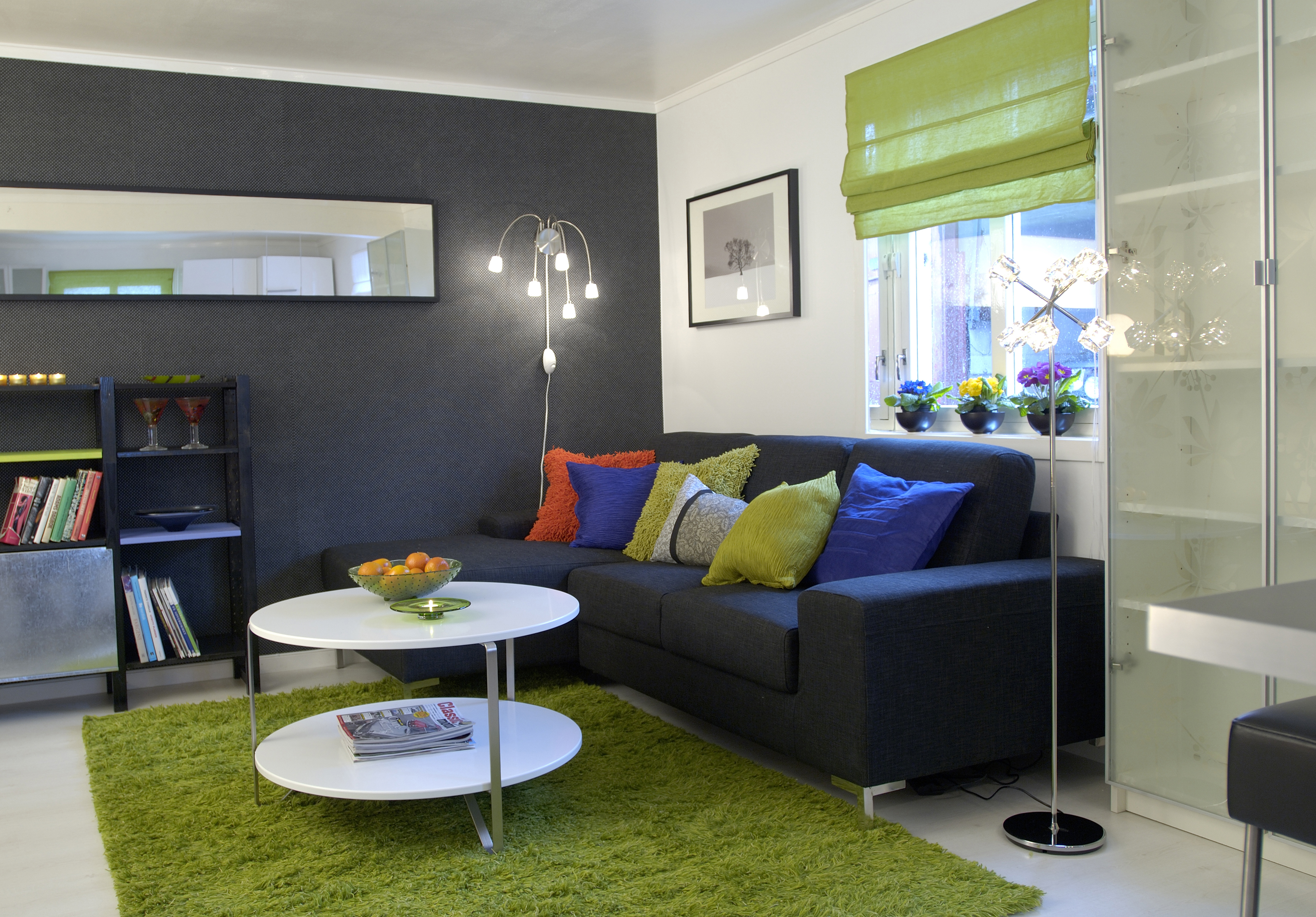 Når boarealet er 48 kvadratmeter, sier det seg selv at ikke oppholdsrommet er stort. Godt lys på riktig plass er alltid viktig, og i små leiligheter blir det ekstra viktig.