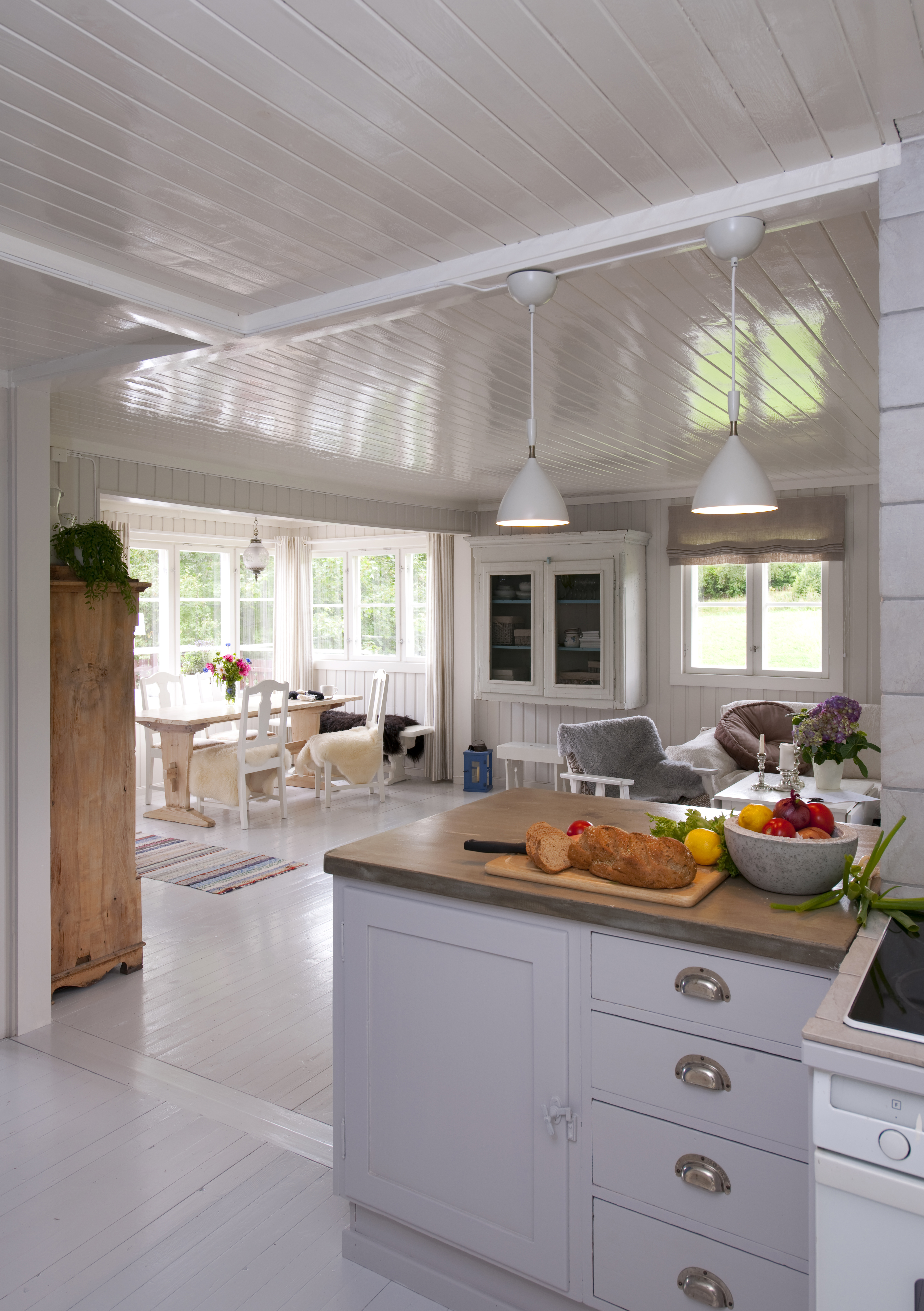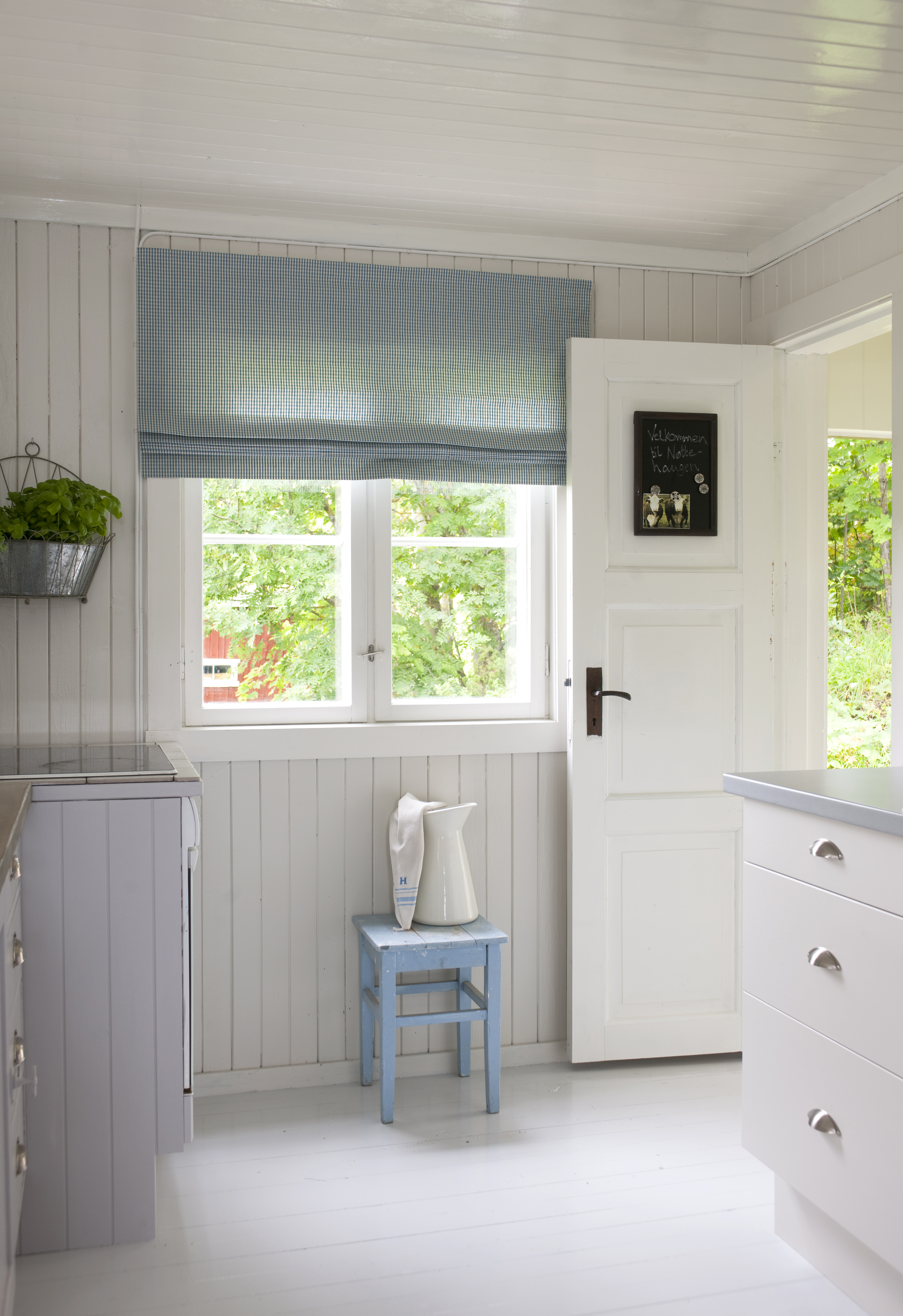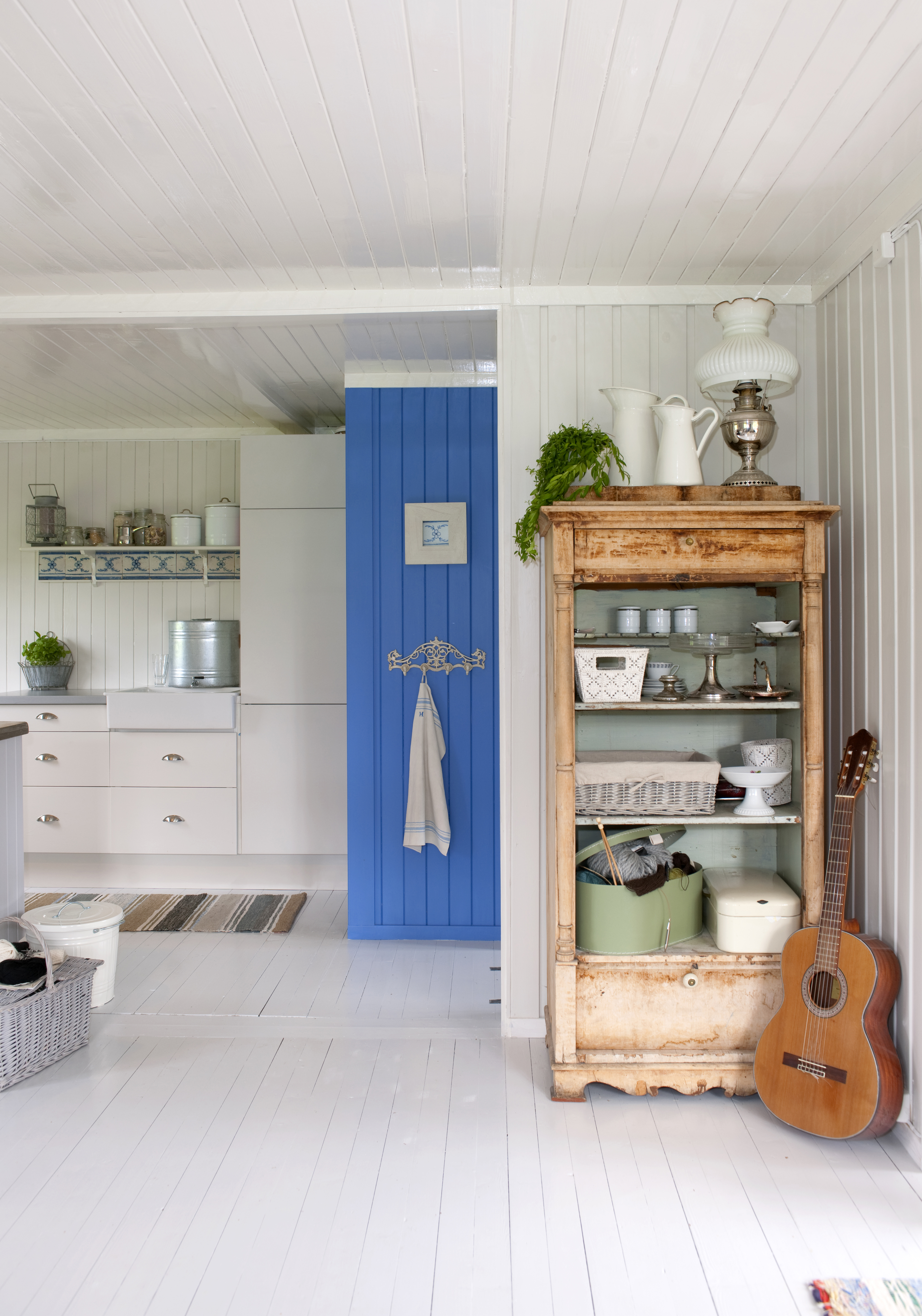 - I et åpent rom som dette, med mange funksjoner, er det viktig å se helhet og binde elementene sammen. Men man må også legge inn kontraster og skape små overraskelser. Mari så for seg et lyst interiør, så tak ble hvitmalt i 90-glans, vegger og dører ble malt lyse, brukket mot beige, mens vinduer og listverk ble hvitmalt i 40-glans. Gulvet ble lysegrått. For å skape en litt heftig kontrast, foreslo jeg å male en halvvegg knall blå. Det gjorde rommet litt rampete. Fargen ble valgt ut ifra de antikke flisene som Mari hadde kjøpt i Portugal, forteller Ellen Skifjeld.