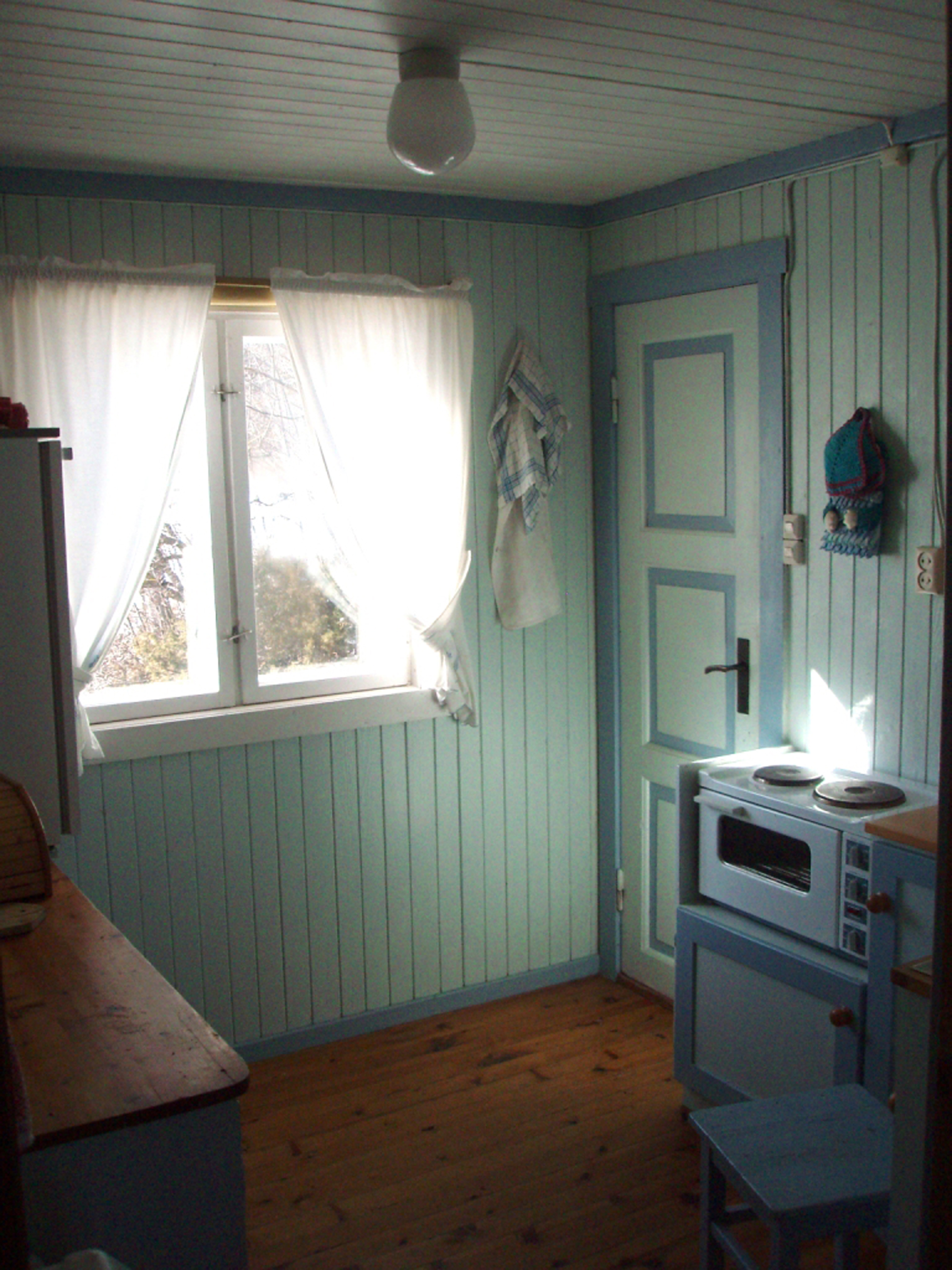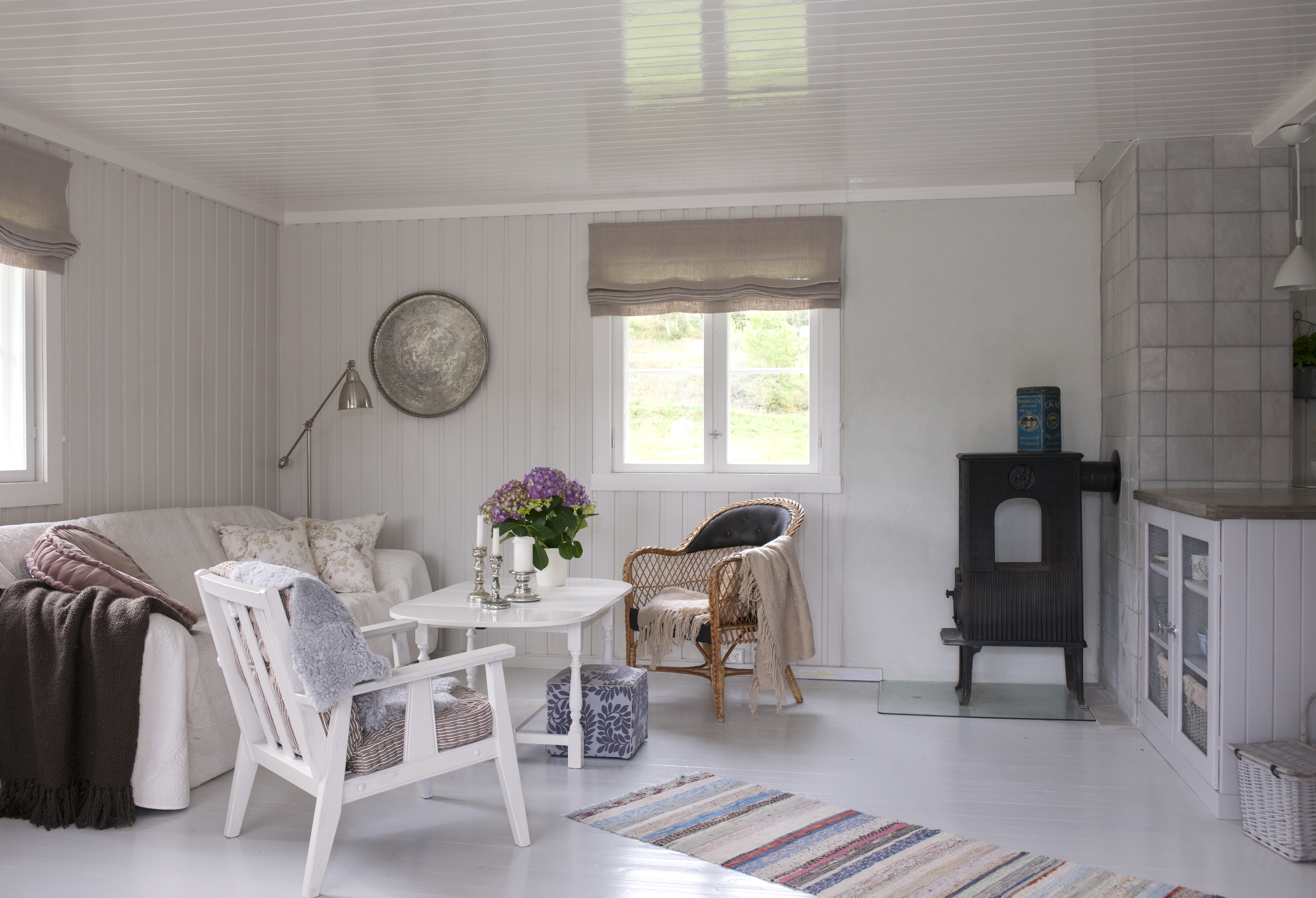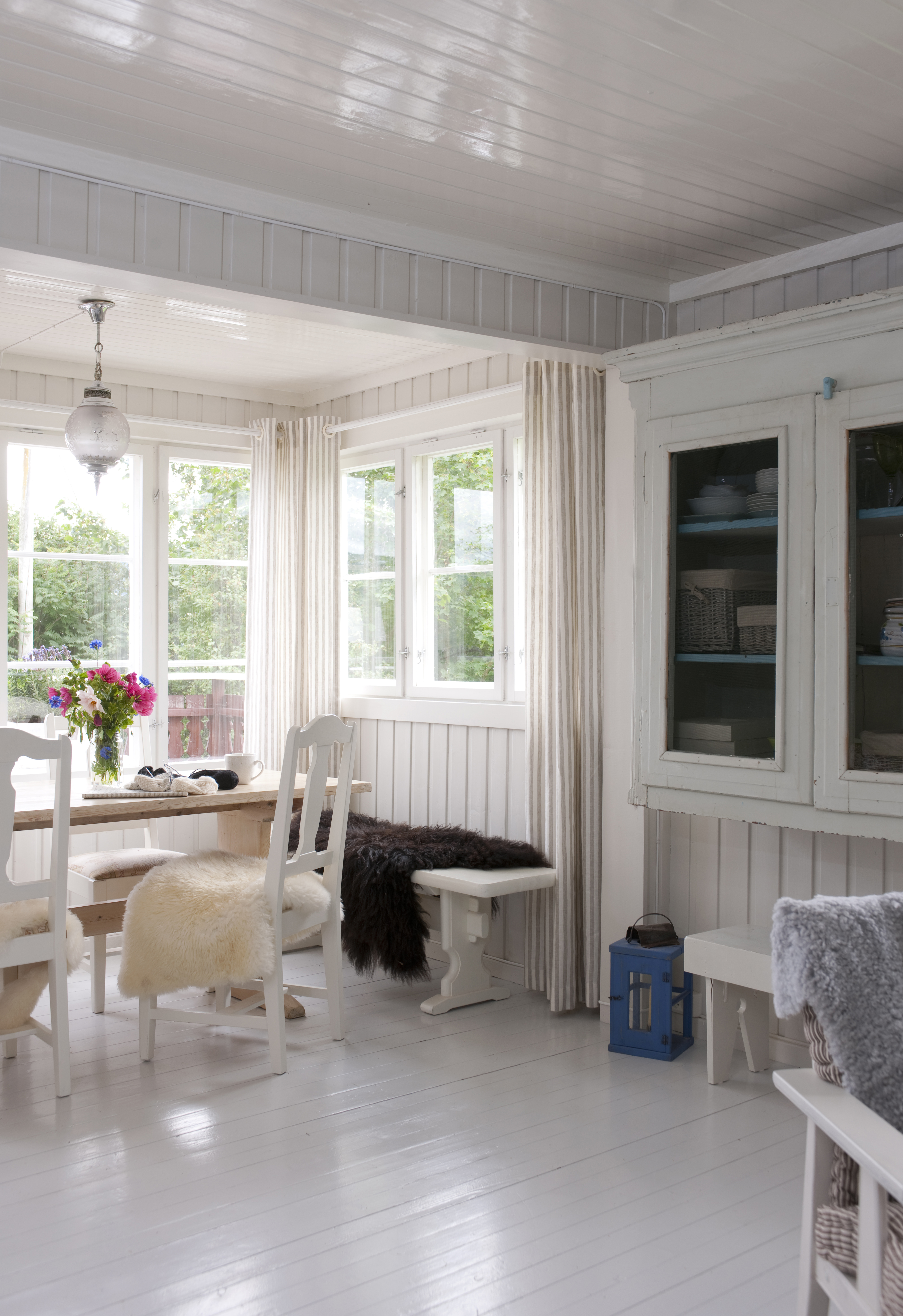 - I et åpent rom som dette, med mange funksjoner, er det viktig å se helhet og binde elementene sammen. Men man må også legge inn kontraster og skape små overraskelser. Mari så for seg et lyst interiør, så tak ble hvitmalt i 90-glans, vegger og dører ble malt lyse, brukket mot beige, mens vinduer og listverk ble hvitmalt i 40-glans. Gulvet ble lysegrått. For å skape en litt heftig kontrast, foreslo jeg å male en halvvegg knall blå. Det gjorde rommet litt rampete. Fargen ble valgt ut ifra de antikke flisene som Mari hadde kjøpt i Portugal, forteller Ellen Skifjeld.