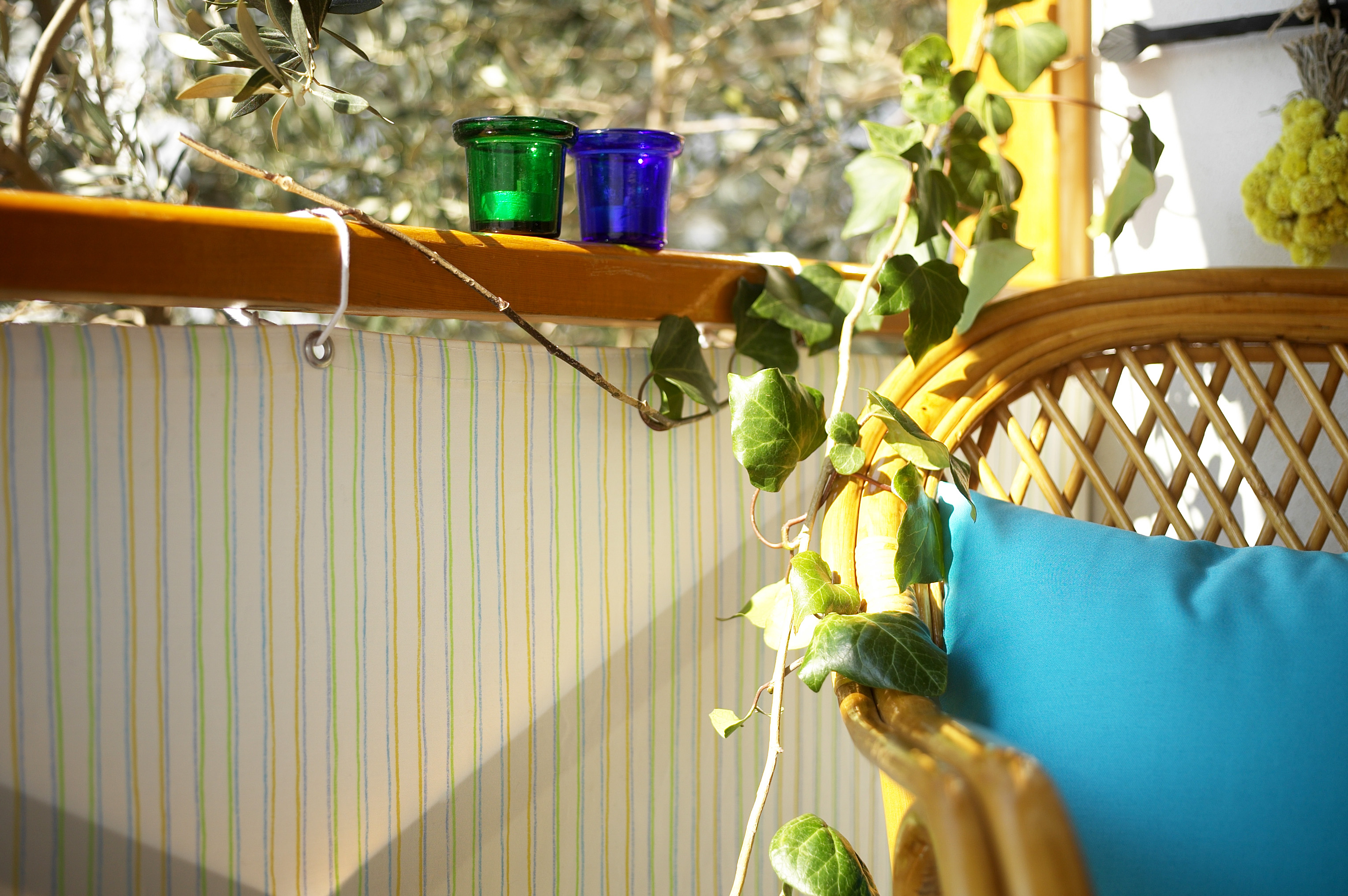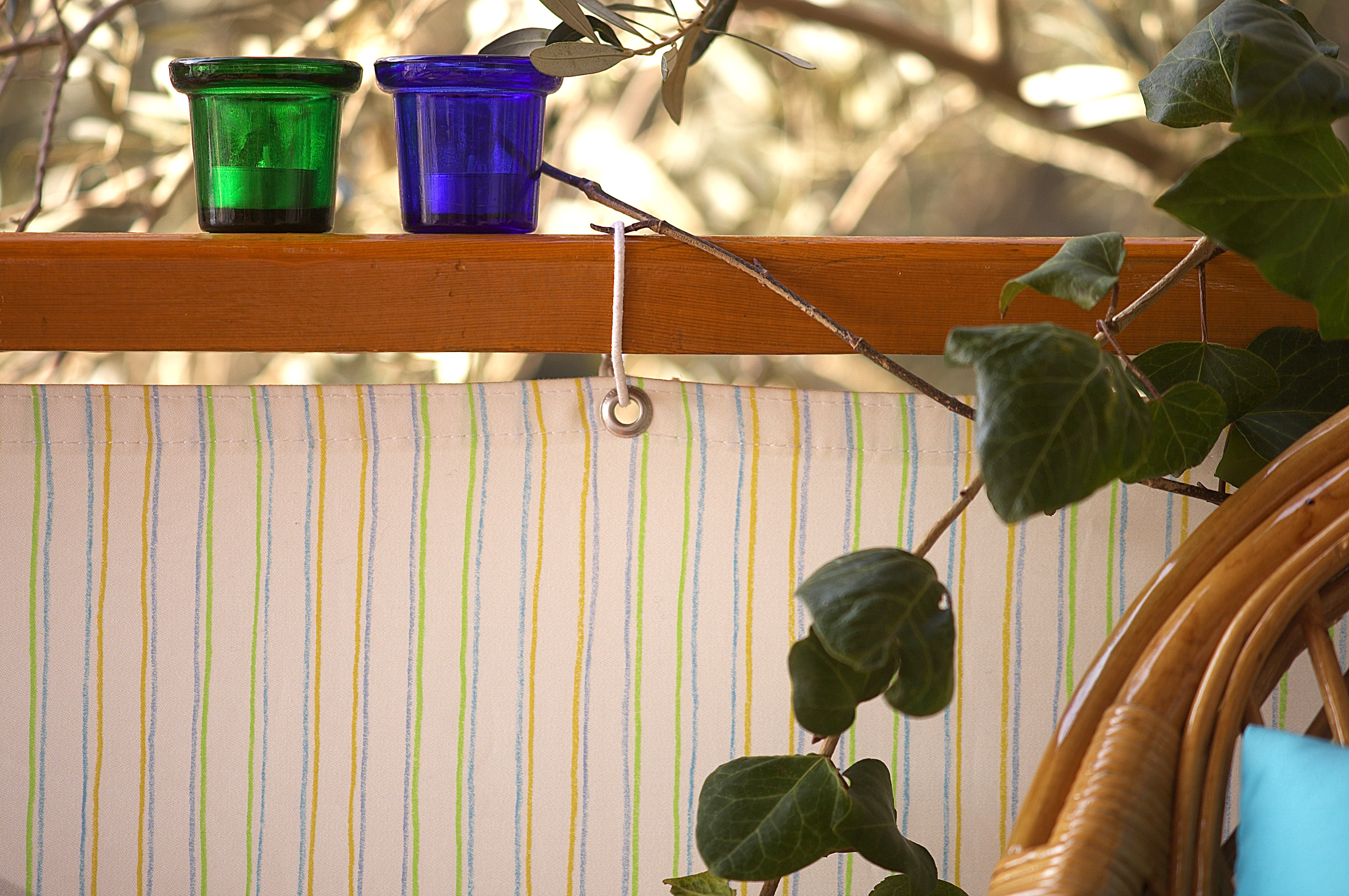 Sommer og lys gir skaperlyst. Med noen meter nye tekstiler og litt fargeglad maling kan du skape en herlig sommerstemning på balkongen. Legg en fargeglad duk på verandabordet, sy puter til stolene, mal noen småmøbler, og du har en ny og frisk uteplass. Glassplaten på bordet er 4 mm tykk med slipte kanter. Glass kan skjæres etter mål hos en glassmester.