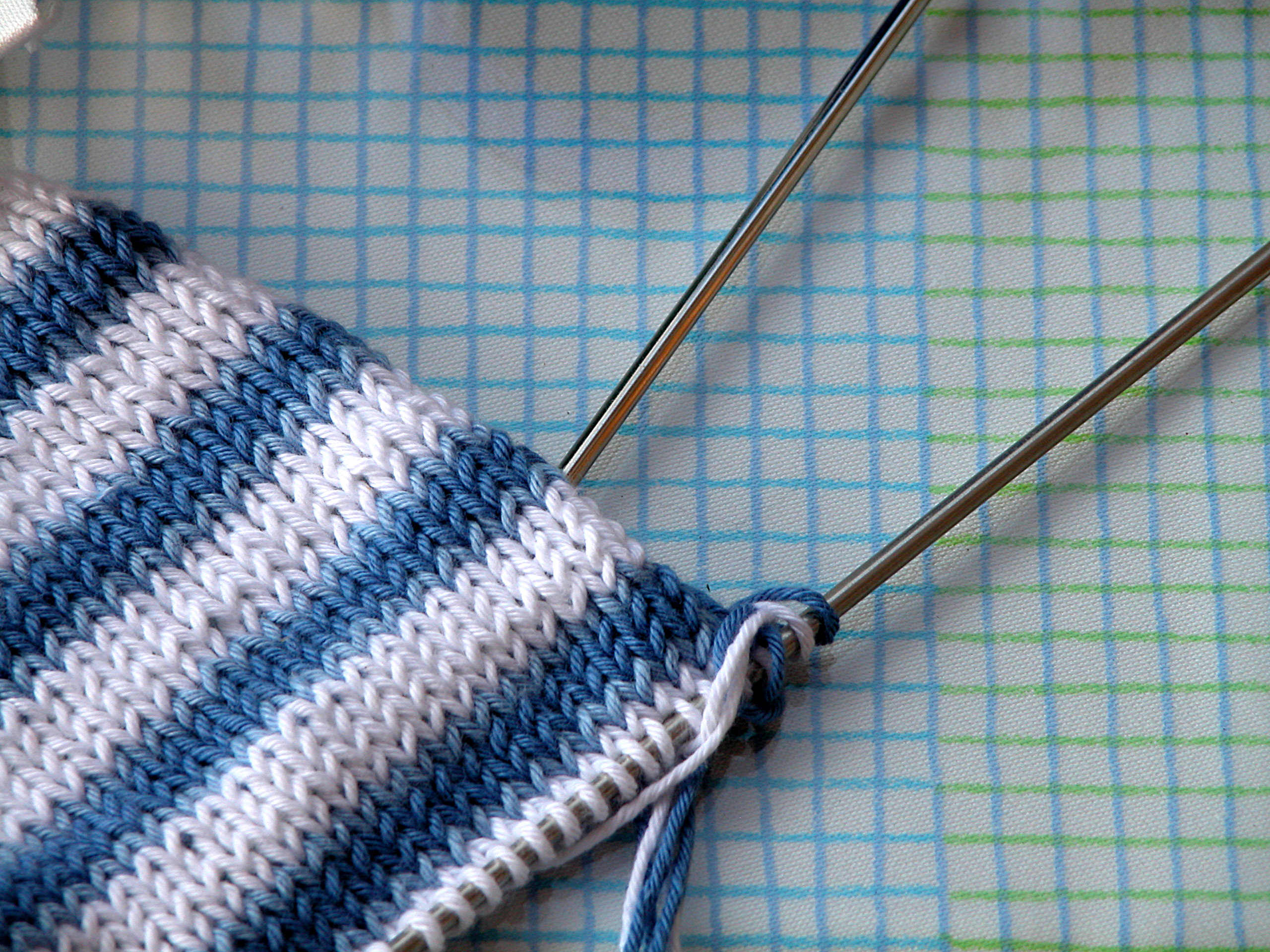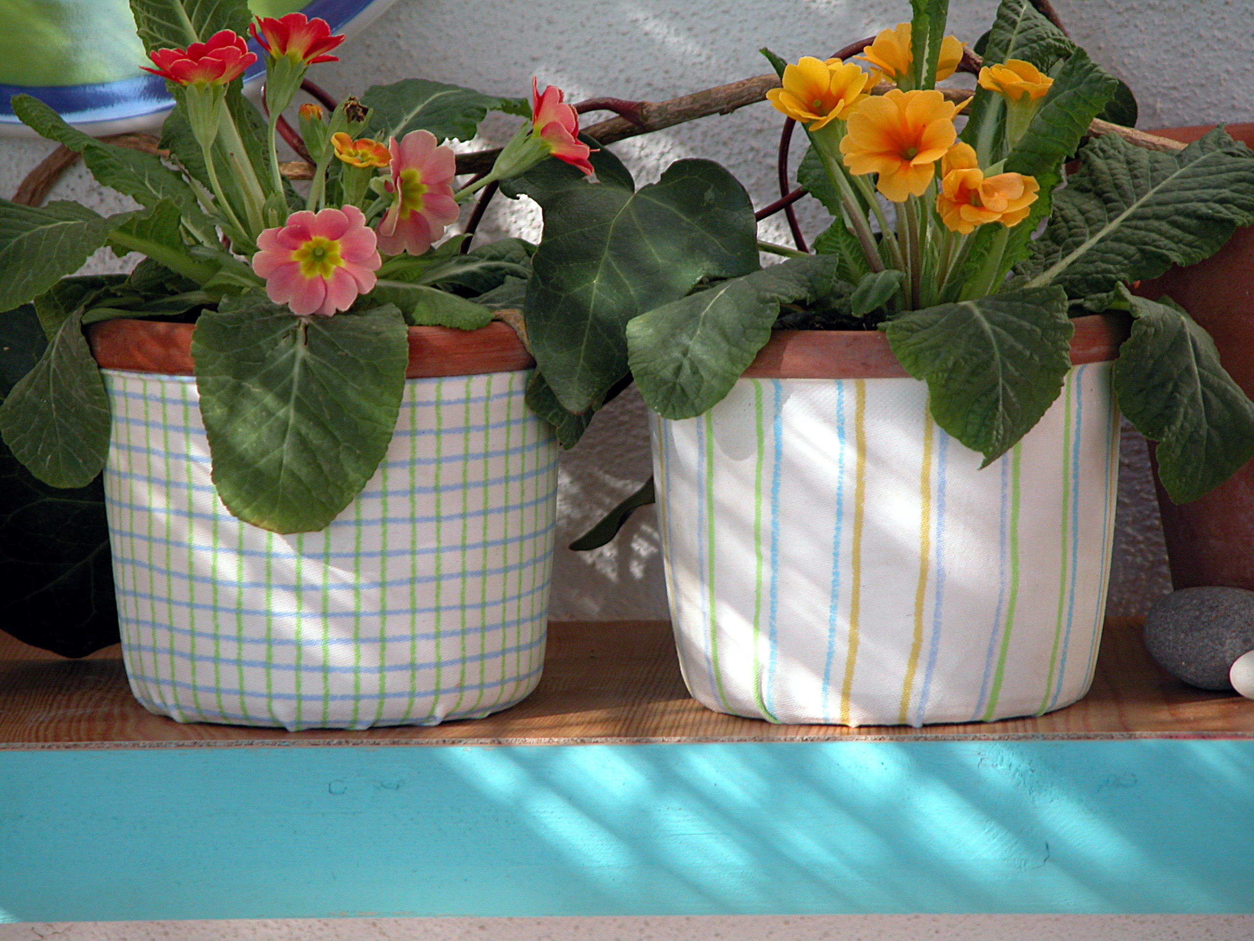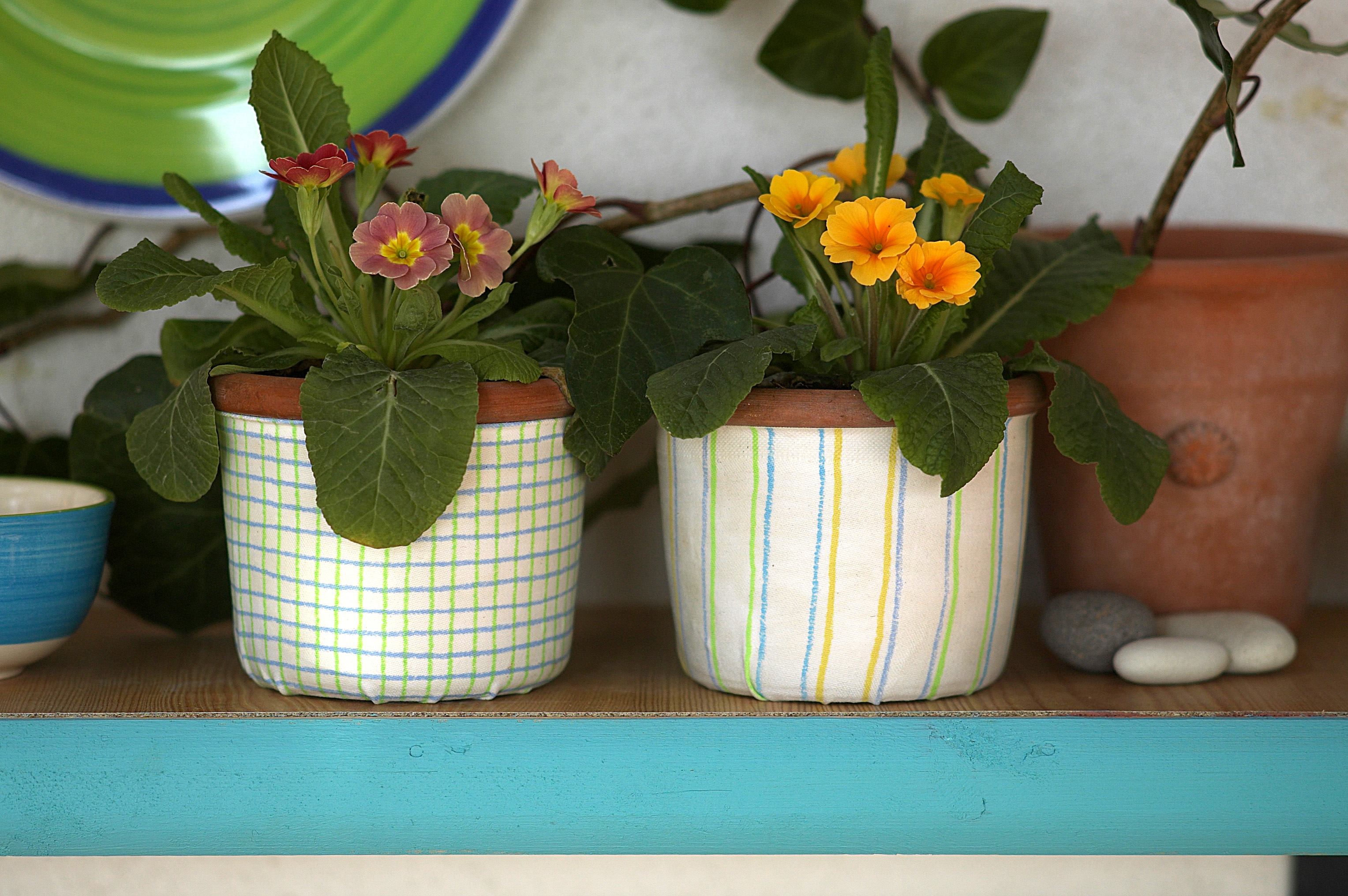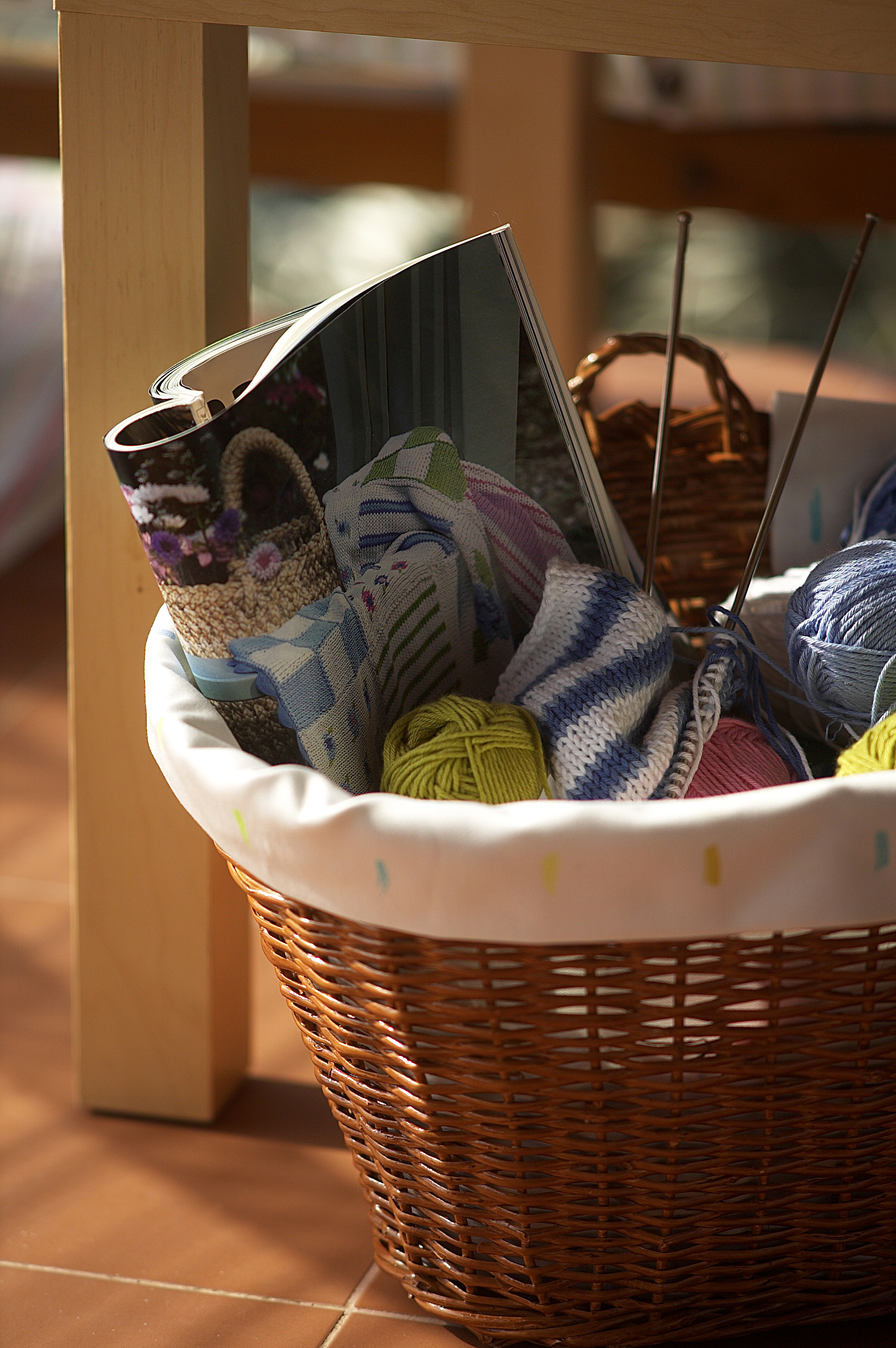 Det er godt å ta en pause i solen, med kaffekopp og strikketøy innen rekkevidde. Håndarbeidskurven fikk et løst stoffor som lettvint kan tas av for vask. Træ en strikk gjennom en løpegang oppe og brett stoffet rundt kanten av kurven