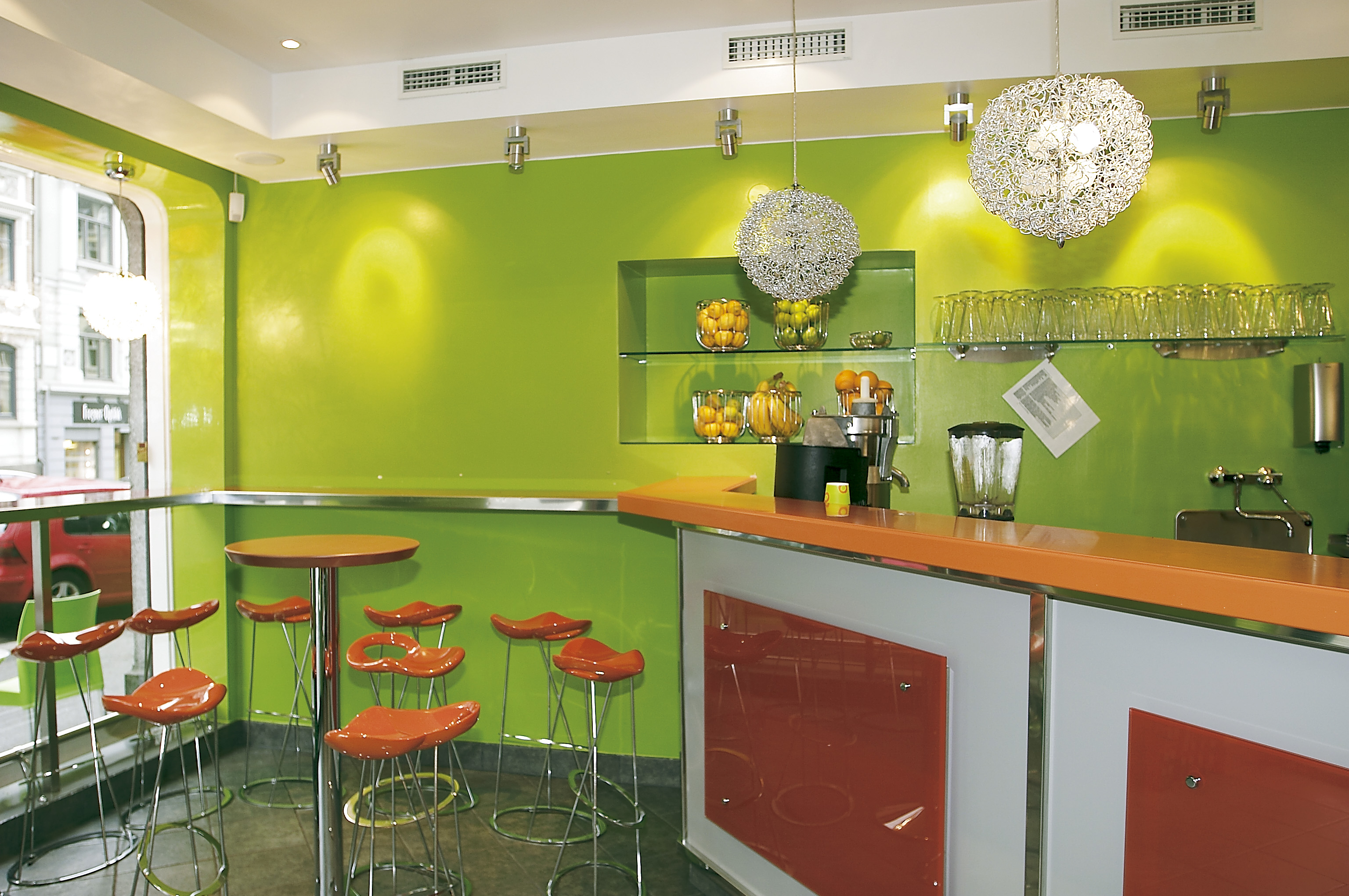 Lokalet i Skovveien var tidligere en del av Frogner Hotell, et vanskelig lokale for interiørarkitekt ettersom det er så langt og smalt - hvor disken i en kaffe- og juicebar nødvendigvis tar mye plass fordi den skal inneholde så mye. Dessuten er denne bygården et gammelt bygg med gamle bjelkelag. Hele rommet ble derfor strippet rent.