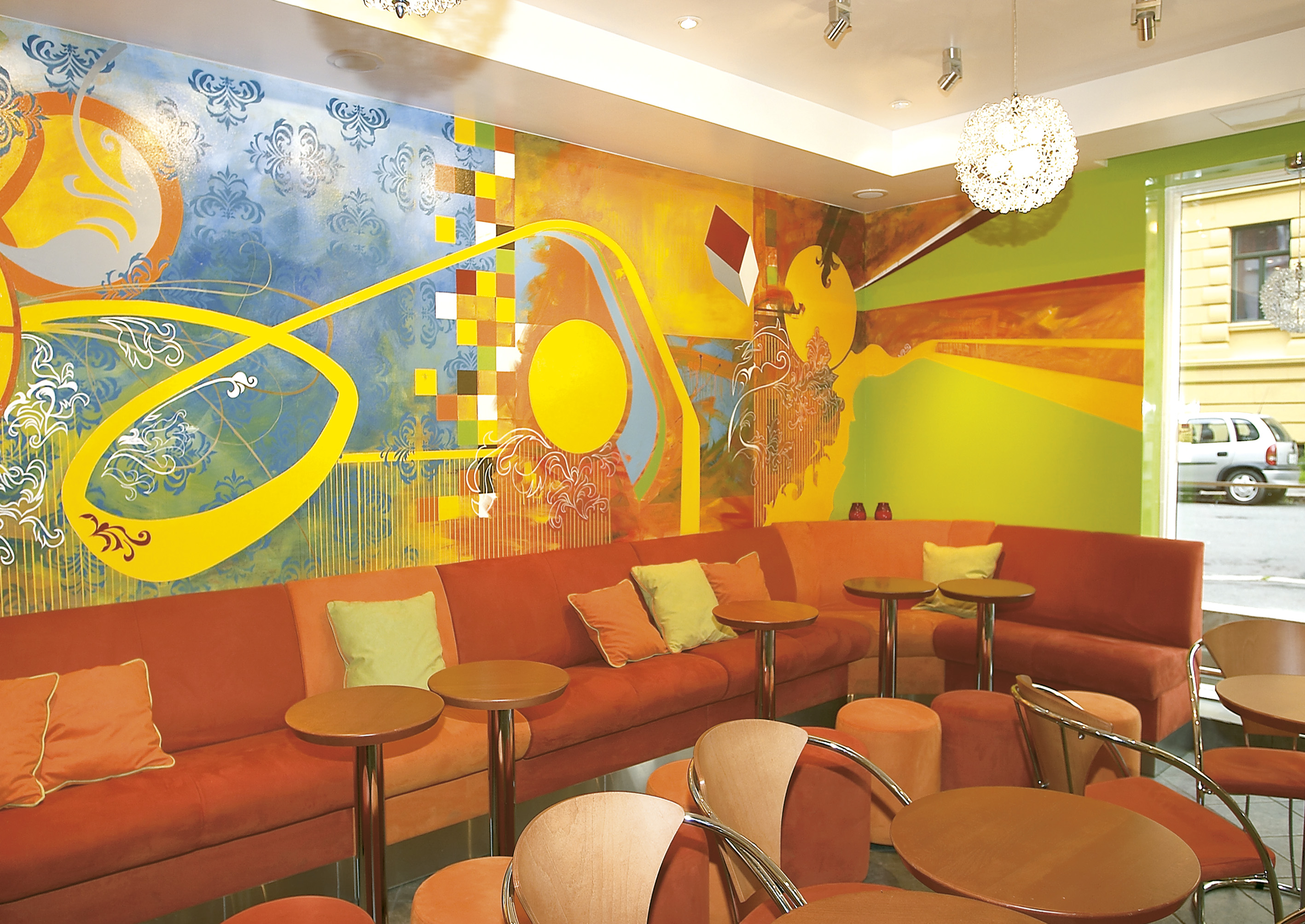 Innerst i lokalet finner vi fargekonseptets mest iøynefallende vegg - illustrert symbolsk med fruktene og solen av dekorasjonsmaler Matt Delahunt fra London. Her er det sofapartier, puffer og bord som skiller seg fra resten av snackbar-stilen fordi Bagel & Juice også holder åpent om kveldene med matretter og skjenkerett. Møblene i de samme friske farger har borrelås og avtagbare tekstiler slik at veien til vaskemaskinen er kort.. Kombinasjonen høst-/vinter-Norge og høy trafikk gir en hel del søl.