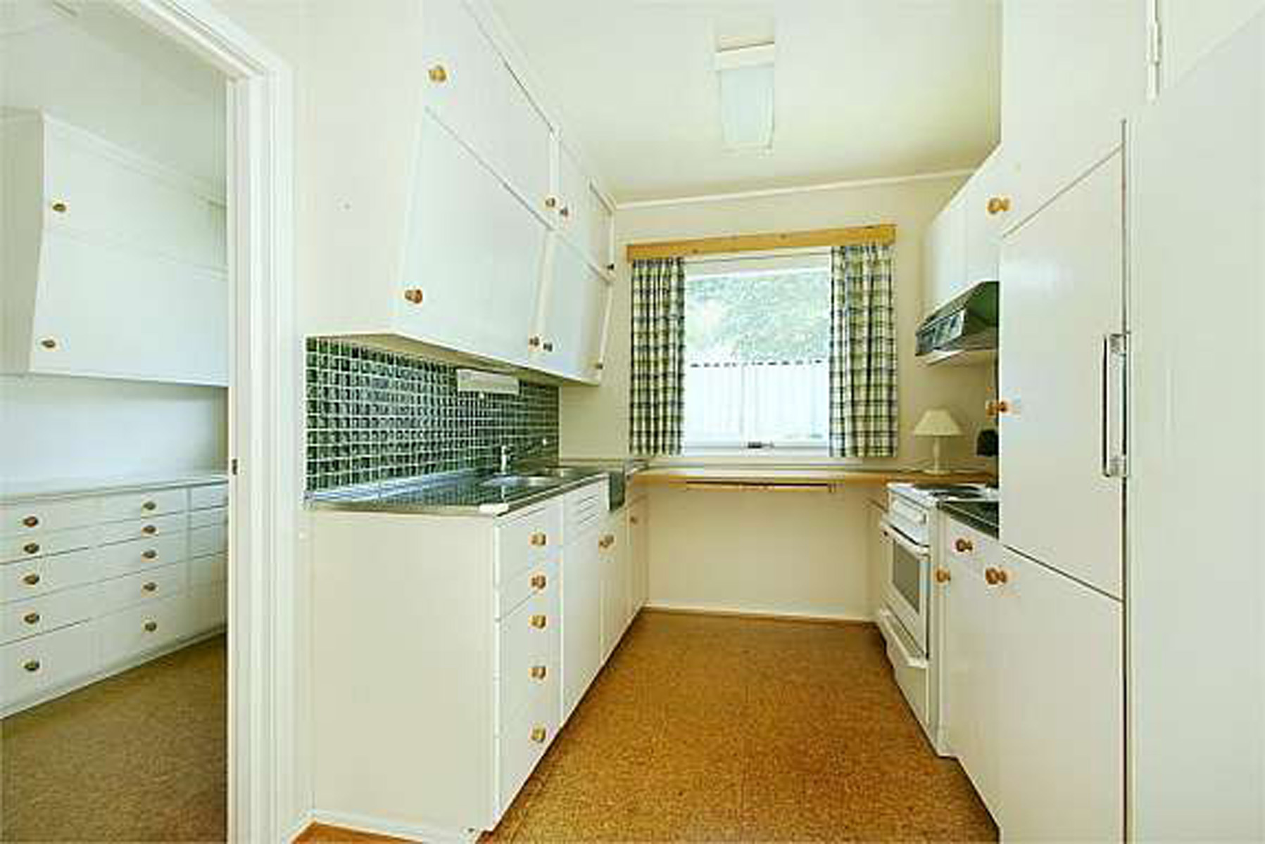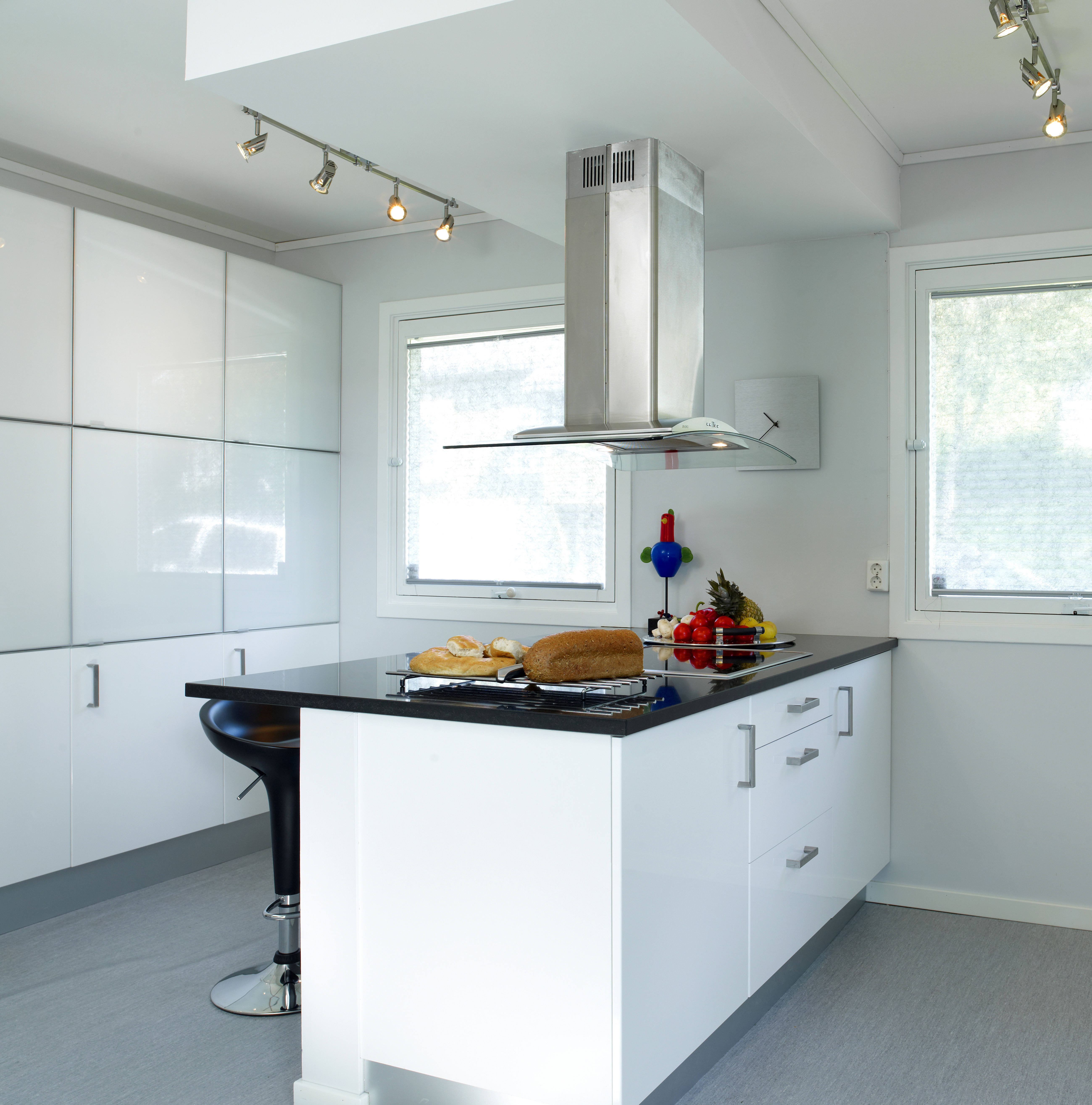 Det trange kjøkkenet i to avdelinger ble gjort om til ett stort kjøkken der enkelhet og gode praktiske løsninger ble viktige stikkord. Ny kjøkkeninnredning med glatte flater er lett å holde rent. Benkeplatene er sorte stenplater som gir et eksklusivt preg på kjøkkenet. Et viktig stikkord ved valg av slike plater er at dyktige fagfolk tar riktige mål og monterer platene.