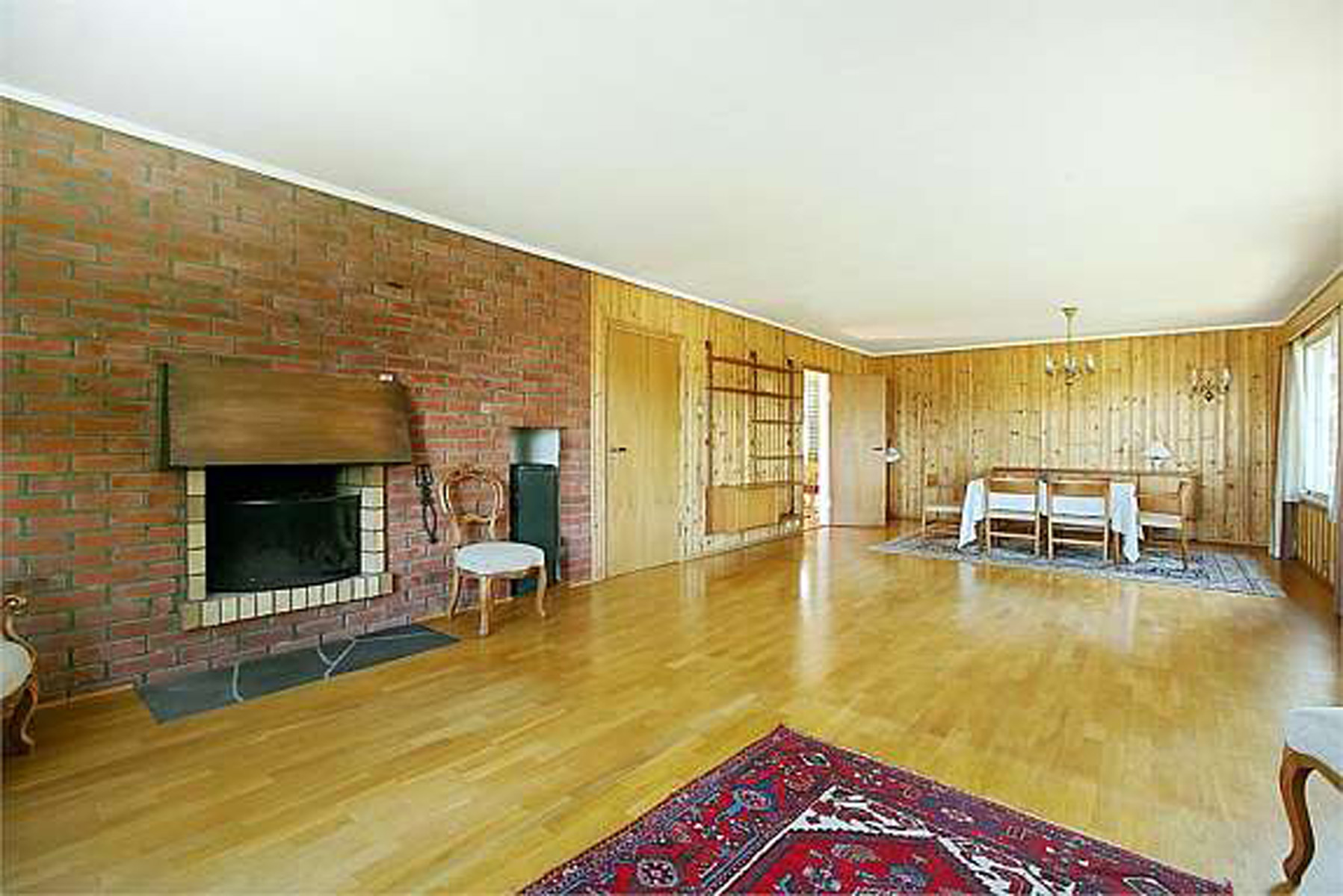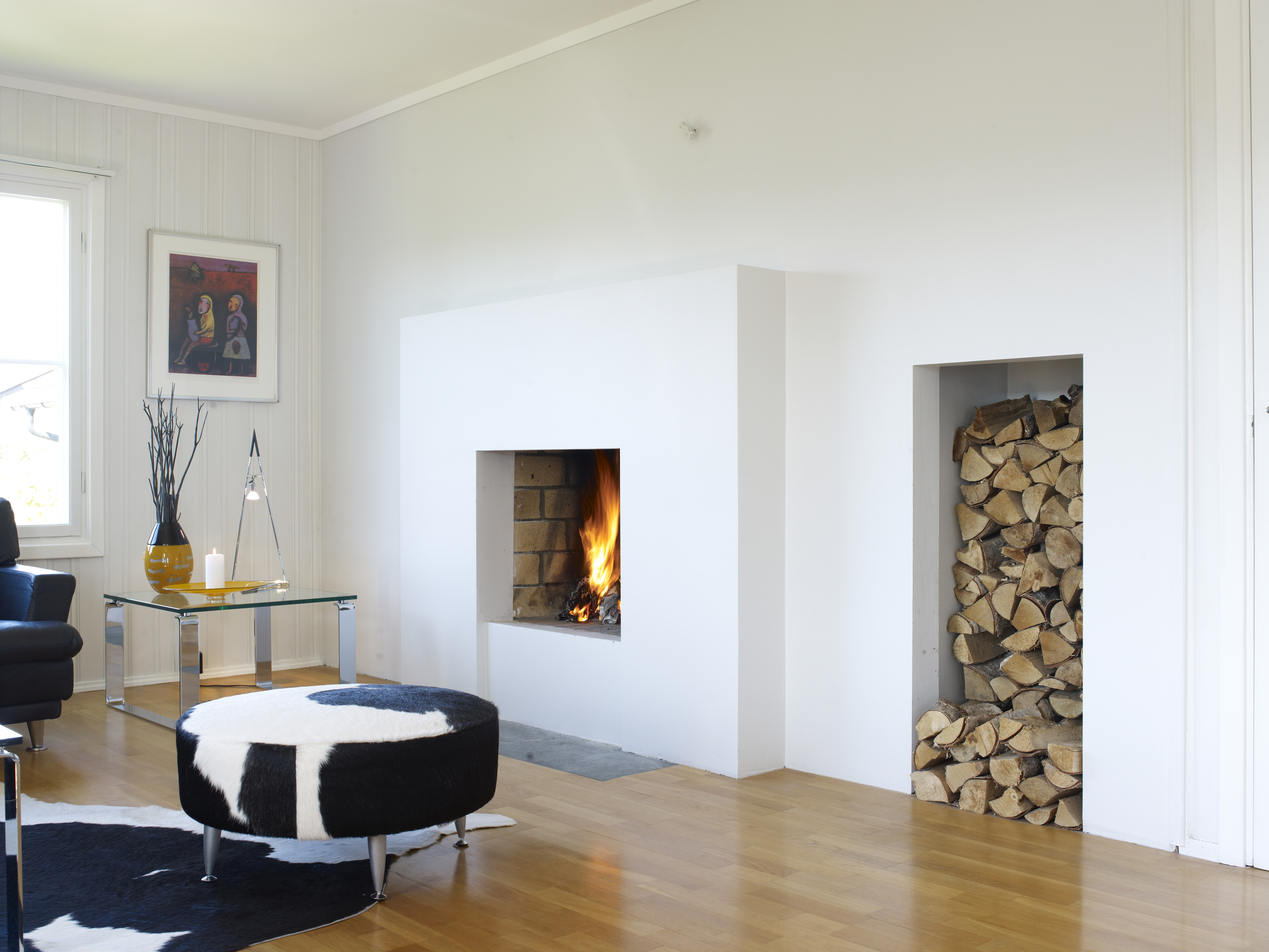 Den gamle peisen i stuen ble beholdt, men fikk en solid og moderne utforming. Opprinnelig ønsket huseierne en glatt, murt vegg, men pga. en konstruksjon med en jernbit som ikke kunne fjernes, ble det satt opp siporexblokker (som er en form for lettbetong) rundt peisen. Blokkene skjuler jernbiten, skaper en fin ramme rundt peisen og forbedret også trekken. Både den nye peisen og veggen ble sparklet og malt i samme farge som panelet.