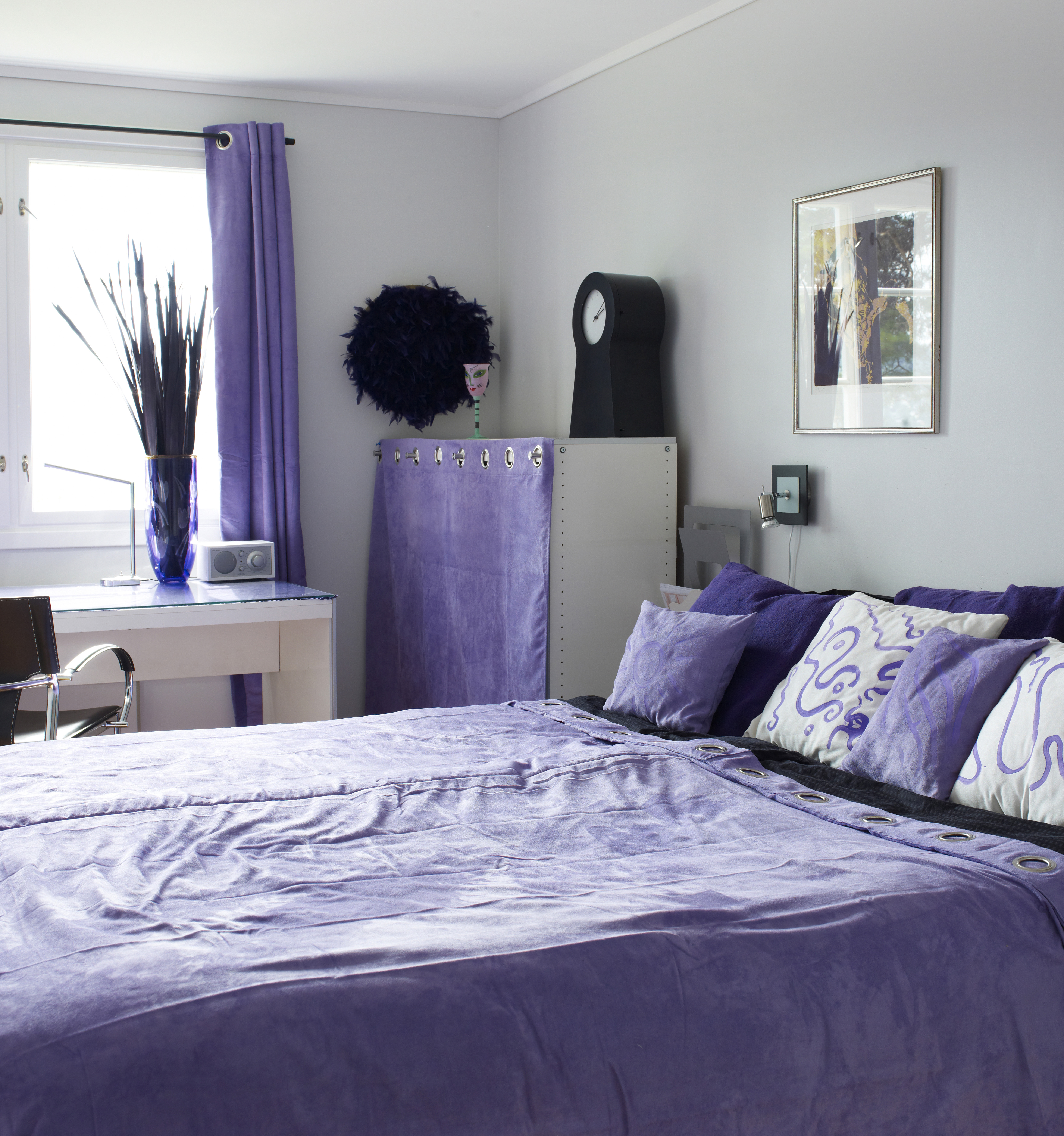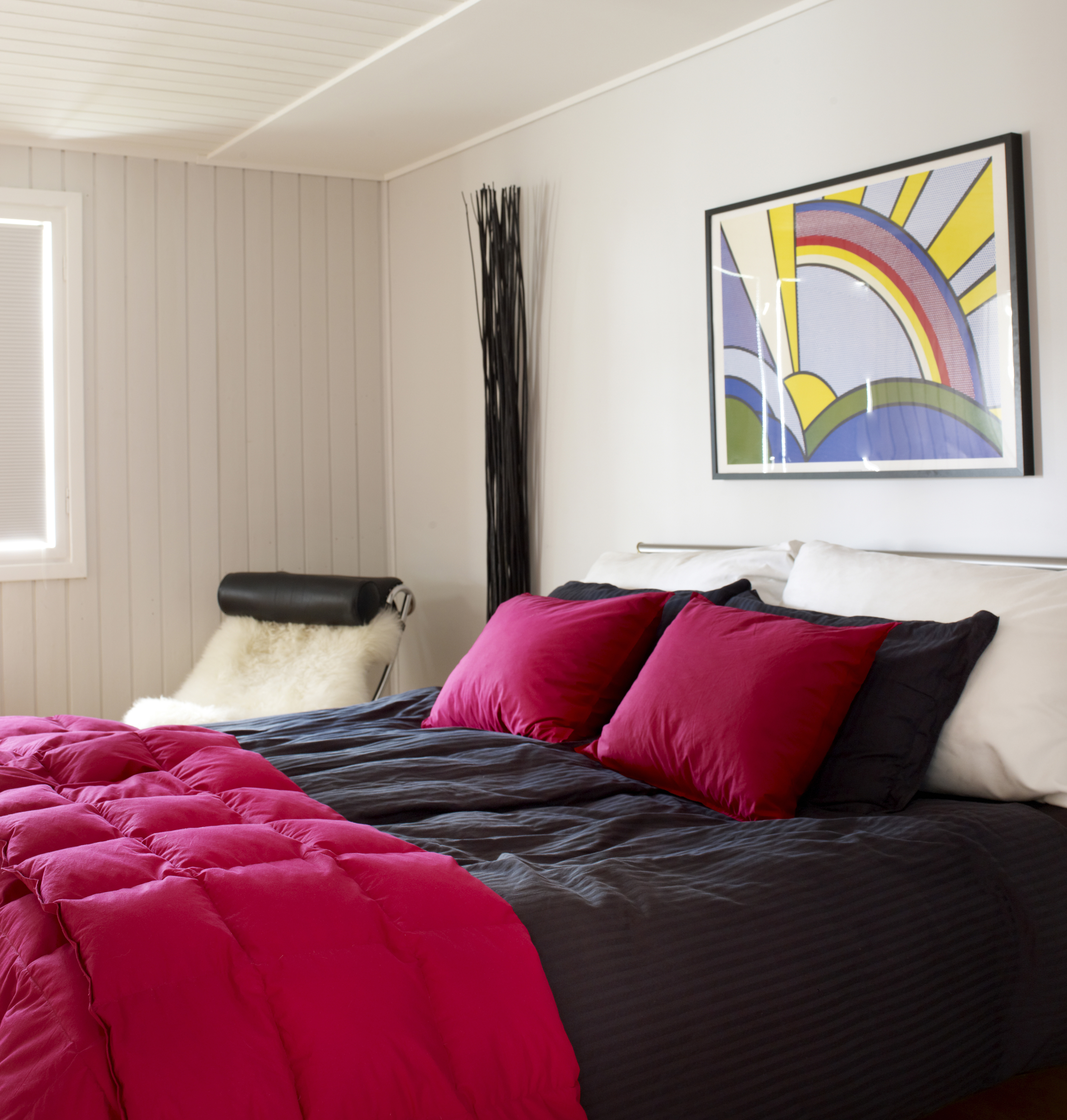 På soverommene ble også panelet malt i grått. Den nøytrale, lyse fargen gjør rommene større, og det er enkelt å skifte det fargerike tilbehøret med andre fargeinnslag om man går lei. Store puter, pledd og sengetepper myker opp den ellers stramme stilen. Noen kvister eller planter gjør også samme nytten. Hovedsoverommet ble gjort større ved å flytte veggen 60 cm inn i gjesterommet, som ikke trengte å være så stort.