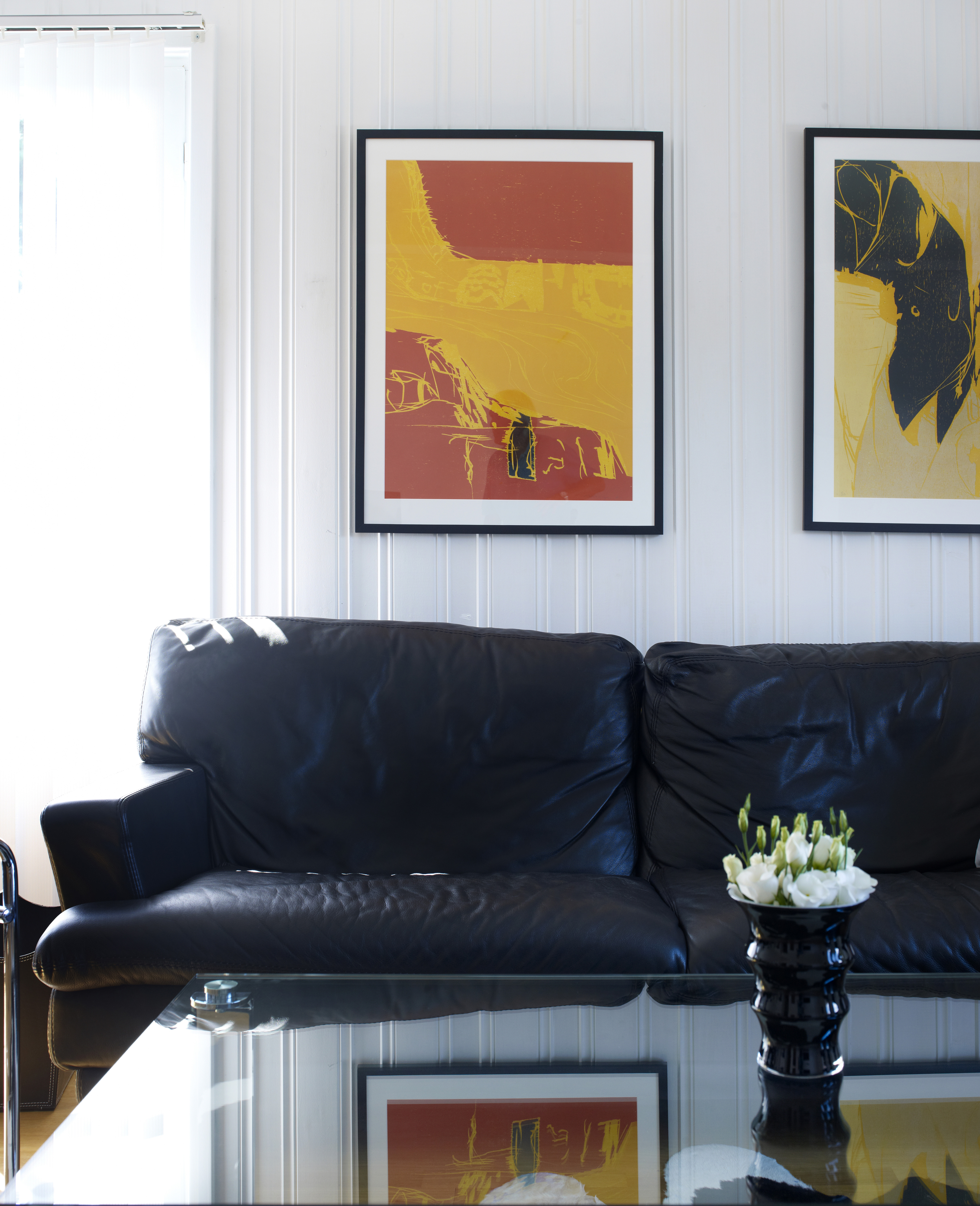 To kjøkkenvinduer gir bra lysforhold på kjøkkenet, men ikke den helt store utsikten. Det løste den erfarne interiørarkitekten på en kreativ måte: Hvit- og sortmaling og passende pensler ble funnet frem, et enkelt motiv i bølgeform maltes så på glassplatene. De ulike gråtonene skapes ved å gradvis blande mer og mer sort i hvitmalingen. "Glassmaleriet" fungerer både som noe å hvile blikket på og som en praktisk flate å holde ren over kjøkkenbenken. Et slikt maleri kan eventuelt også skapes ved å male rett på veggen og montere glassplatene etterpå.