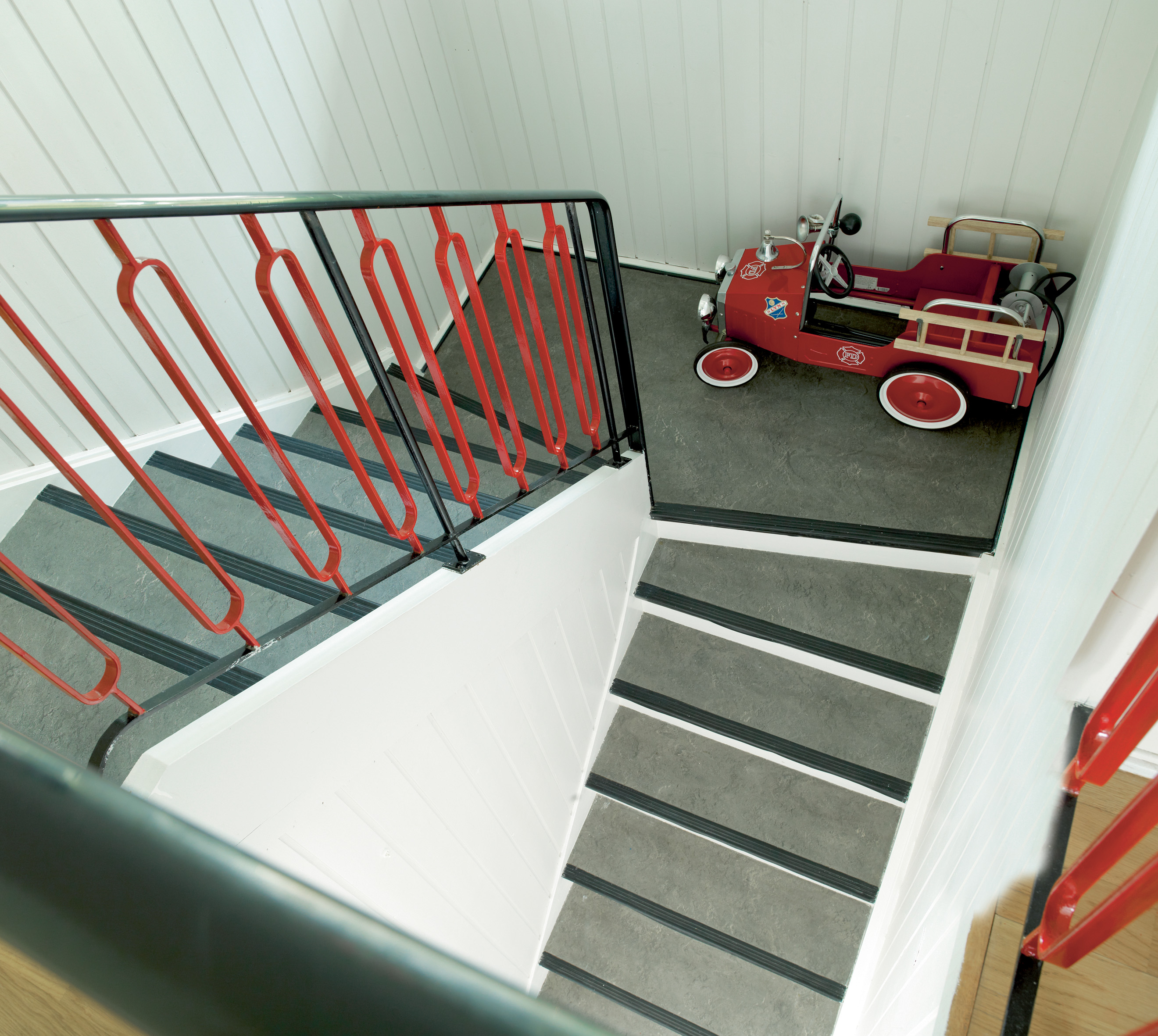Det gamle smijernsgelenderet i trappen, som minnet om svunnen tid, overlevde oppussingen med stil. Malt med metallmaling i en glad rødfarge og helt sort kom de elegante formene bedre frem, og gelenderet ble et festlig og funkisinspirert innslag i trappegangen. Linoleumsbelegget på trappetrinnene ble beholdt fordi det både er lett å holde rent og slitesterkt.