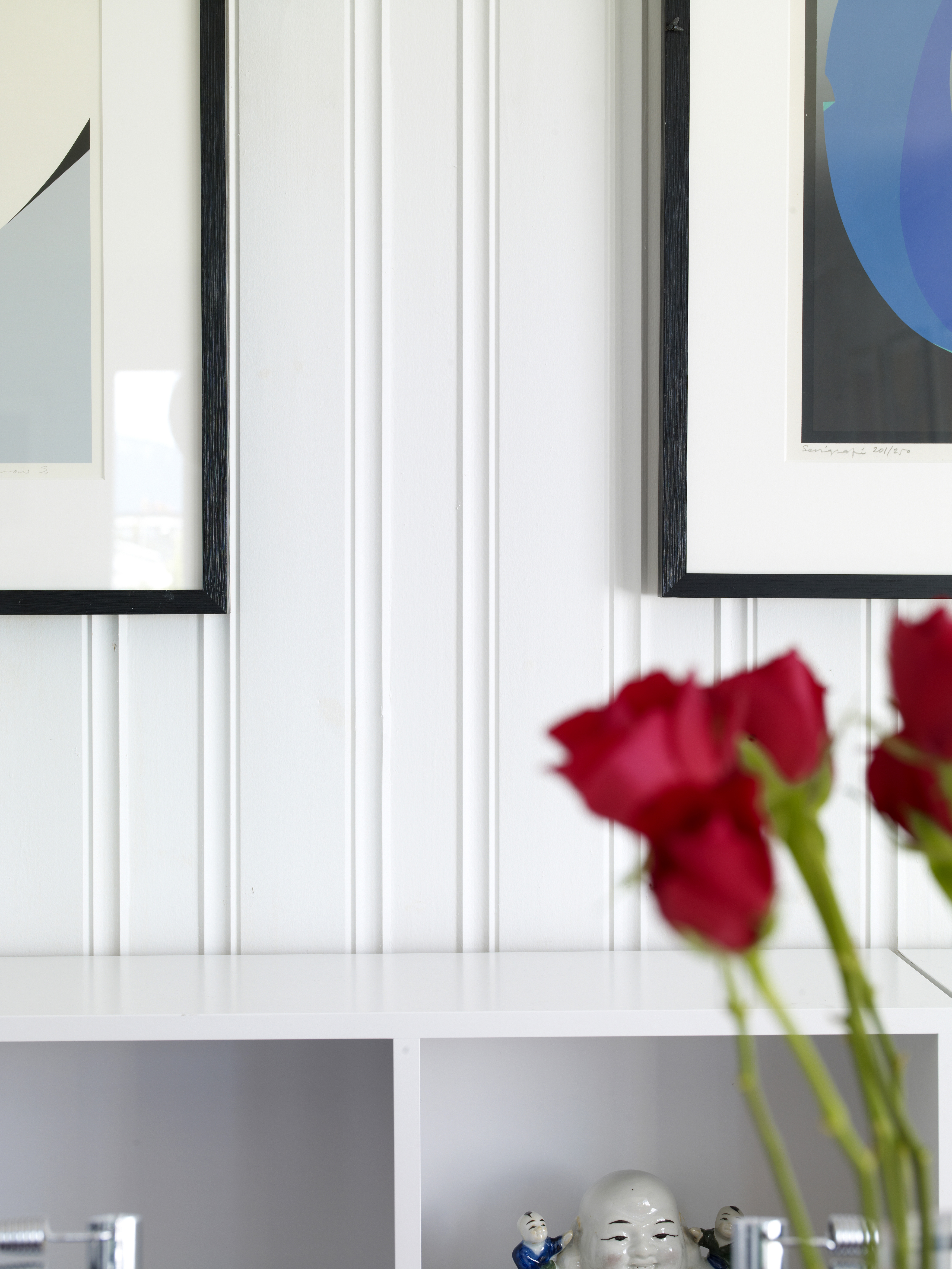 Til sammen gir det lyse panelet og den originale, klassiske parketten et helhetlig og rent uttrykk, som fungerer som en god basis for litt mer fargerike sprell for eksempel rundt spisestuen. Moderne kunst på veggen, morsomme ting i hylla bak spisbordet og de røde, runde teppene, som egentlig er badematter, er alle fargeglade innslag som myker opp stilen og som er lett å bytte ut når man har lyst.