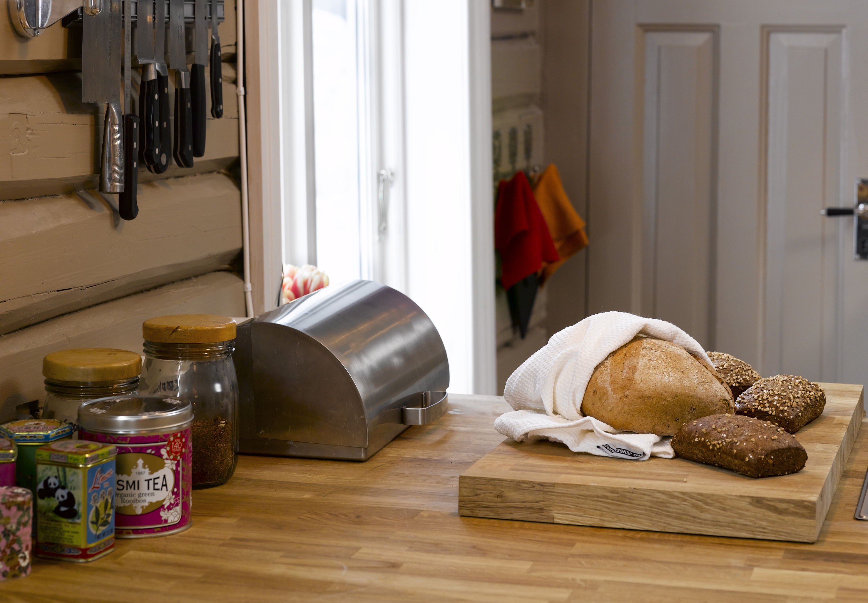 Familien så først for seg en høyglanset, hvit utgave, med skap helt opp til taket. I samråd med interiørarkitekten innså de at såpass mye hvitt ville skape en nokså hard kontrast til de øvrige overflatene, samt at høye skap ville skjule for mye av de ærverdige veggene som er spekket med historie. Valget falt altså i stedet på mørkegrå skap, i en stram, moderne stil. Resultatet er at rommet har fått et mye roligere uttrykk enn om de hadde valgt hvite.