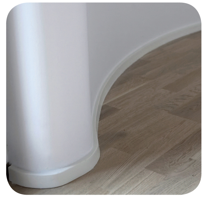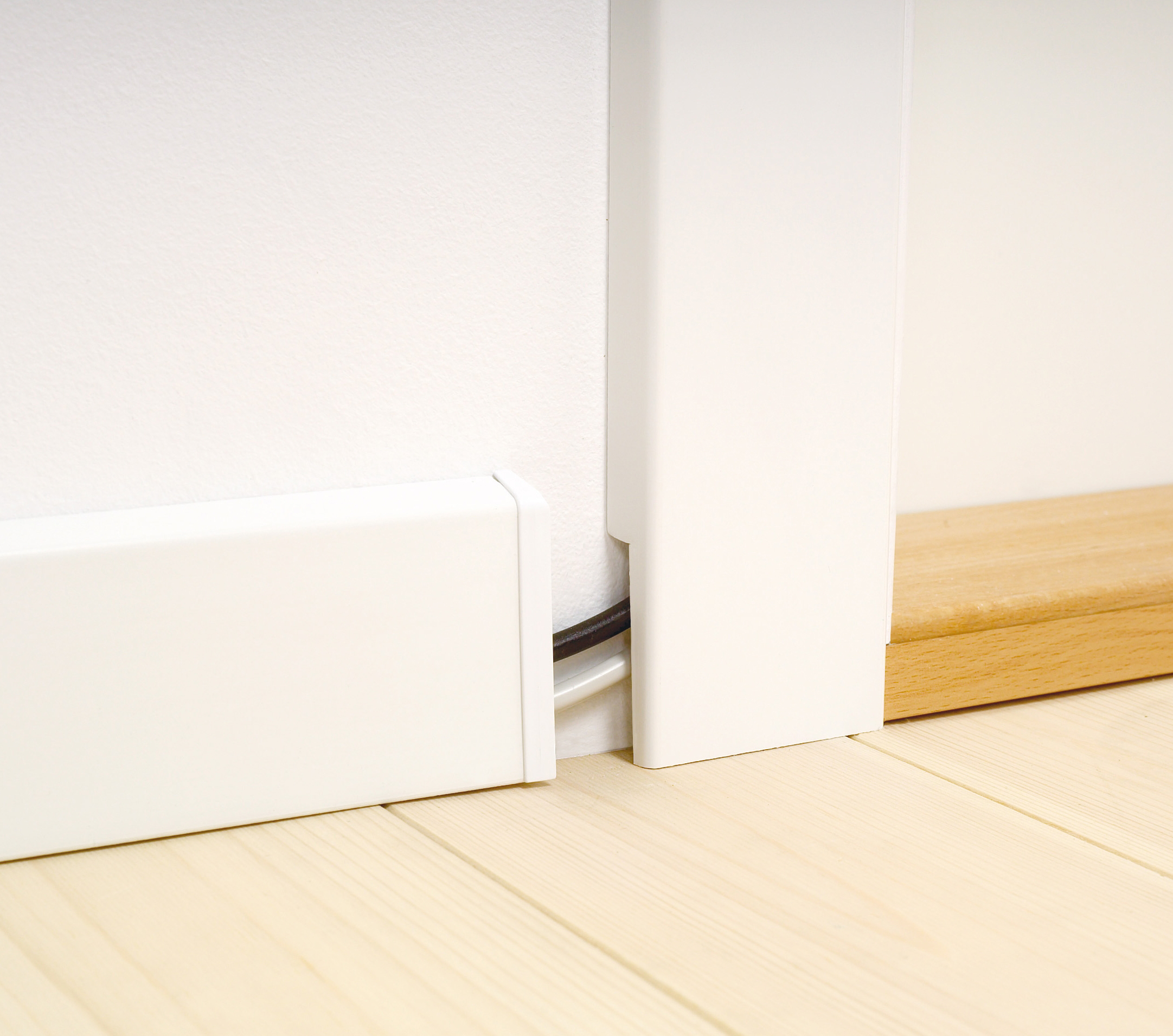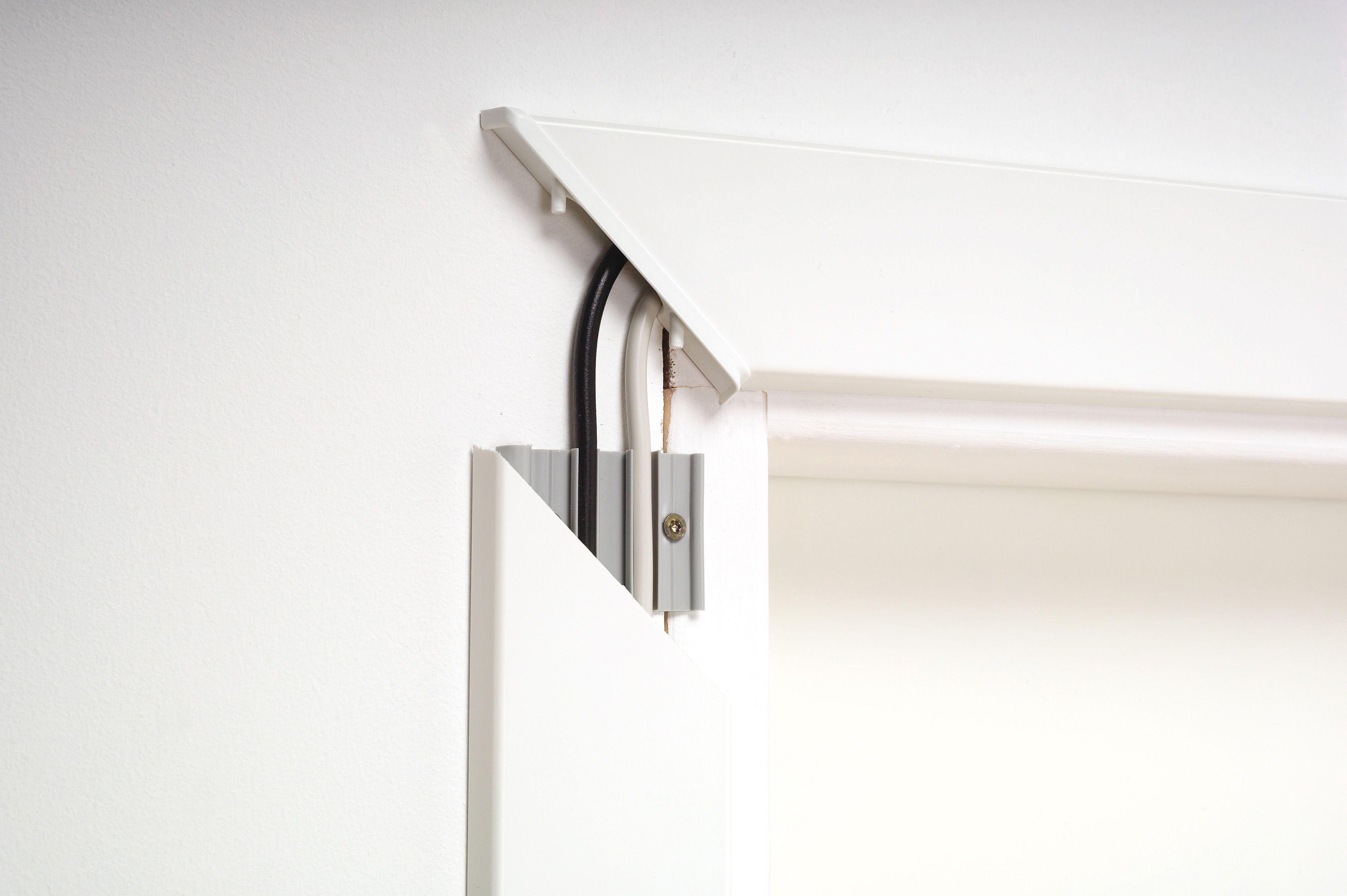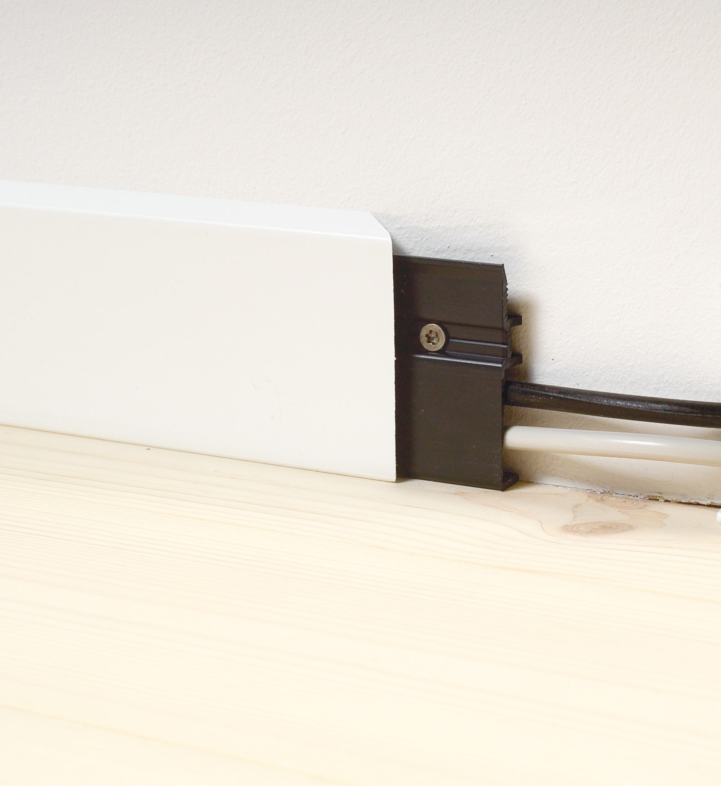 I den halvrunde kabellisten rommes ledninger for strøm, antenne, surroundanlegg, DVD og HD-opptaker og den tykke scart-kabelen. Listen har en halvrund form, som slutter helt tett inntil veggen – også på pussede overflater. Bakstykket monteres med vanlig verktøy. Når ledningene er samlet, er det lett å klemme listen av og på hvis du skal skifte ut ledninger eller male veggen.