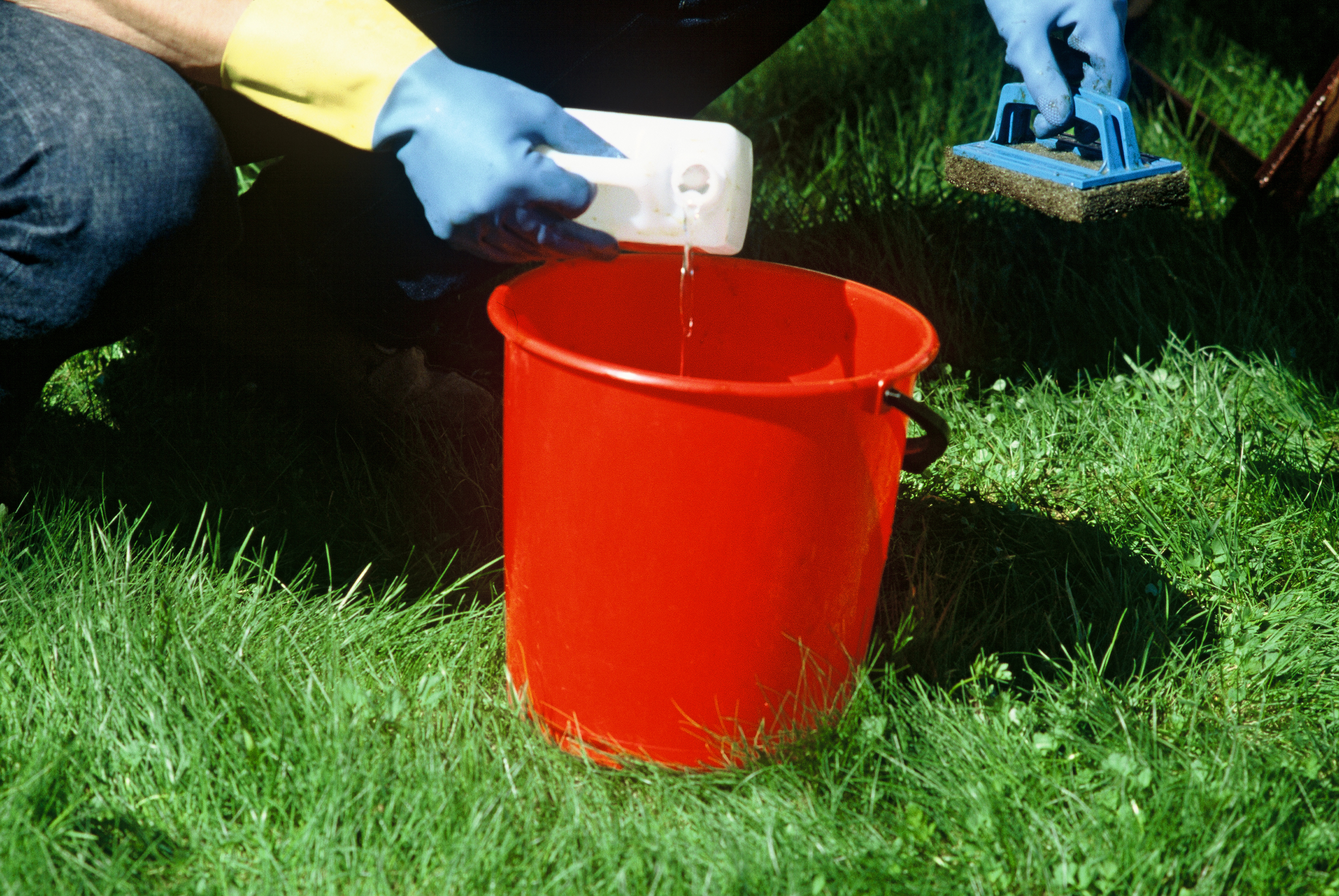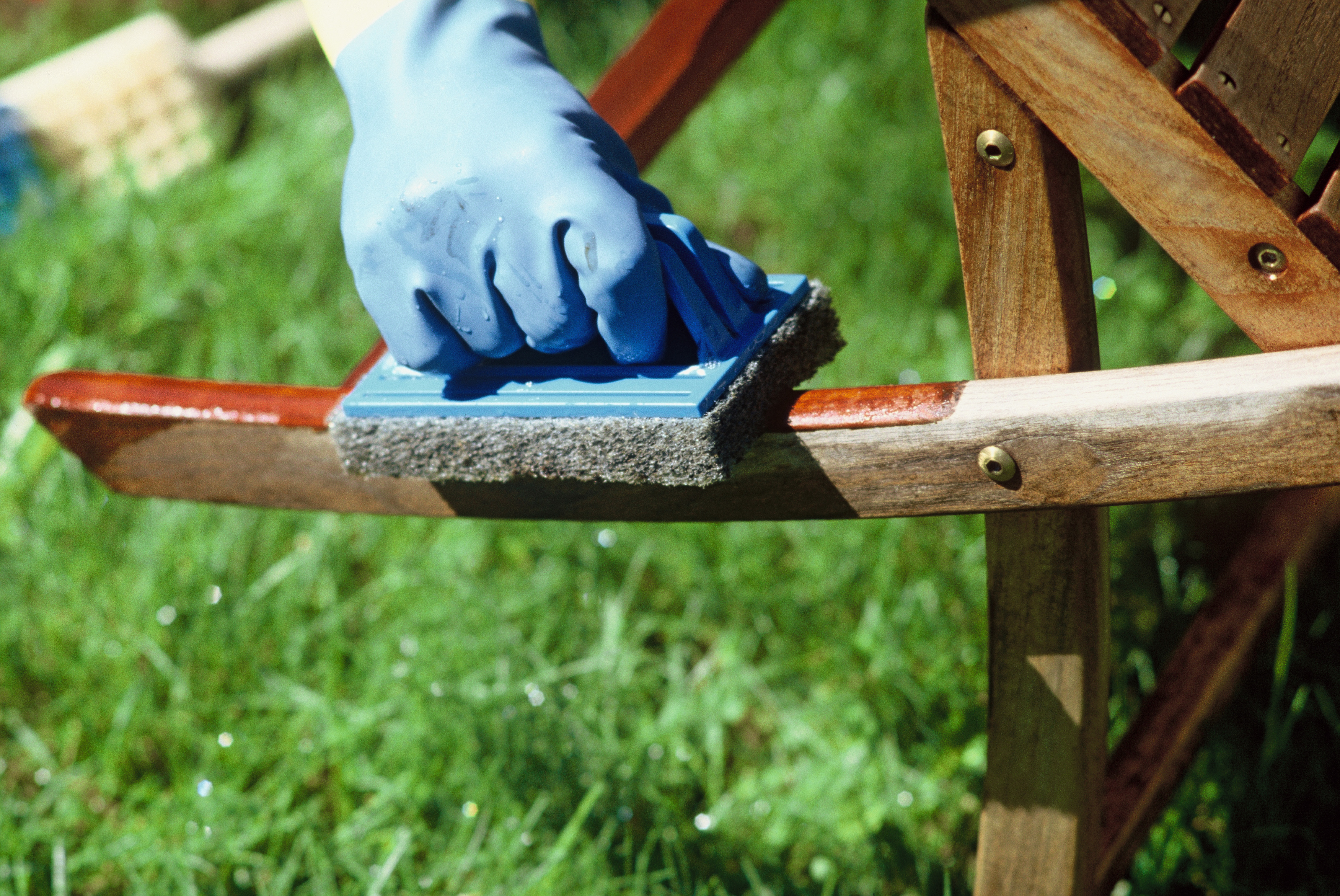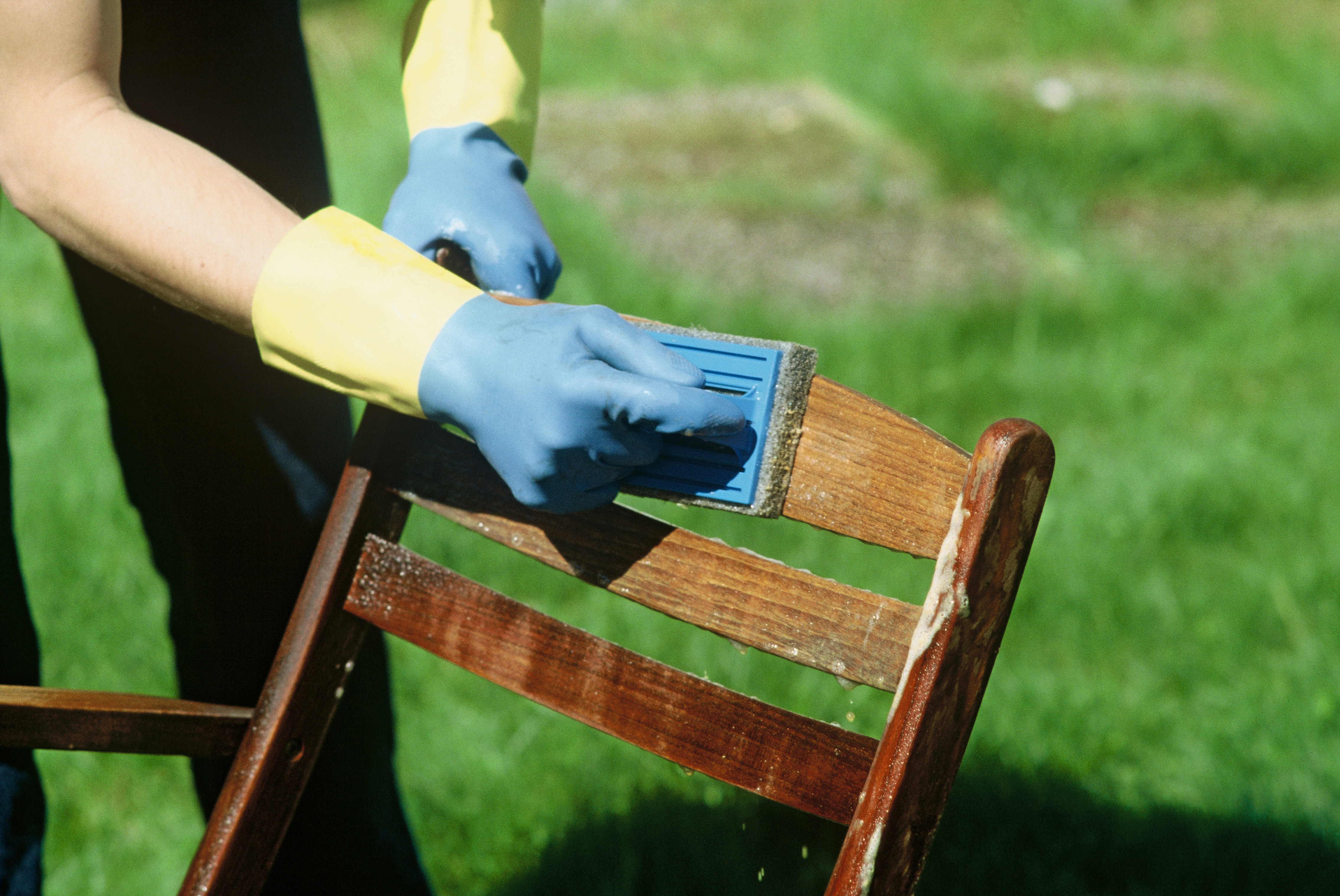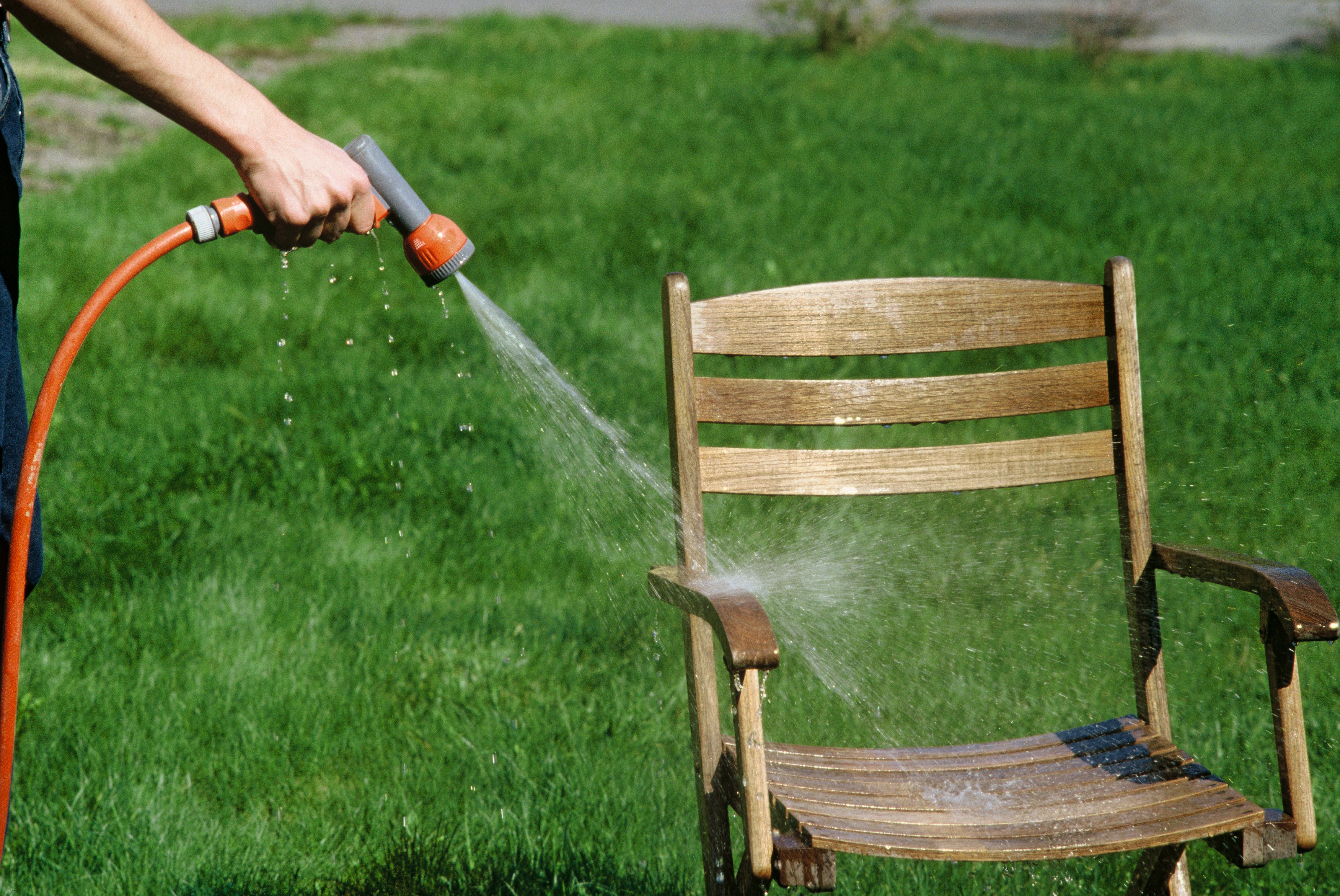 Den behandlingen som vises her er basert på en tokomponentløsning. Det første du gjør, er å spyle veden til den er helt våt. I vått treverk gnis og skrubbes stolen med a-komponenten. Bruk en mellomstiv børste eller skurepad. Denne fjerner blant annet gamle oljerester. Fortsett så vått-i-vått med utfortynnet B-komponent. Skyll godt til slutt. Pass på at treet ikke tørker opp under behandlingen. La treet tørke i 24 timer før en ny oljebehandling.
