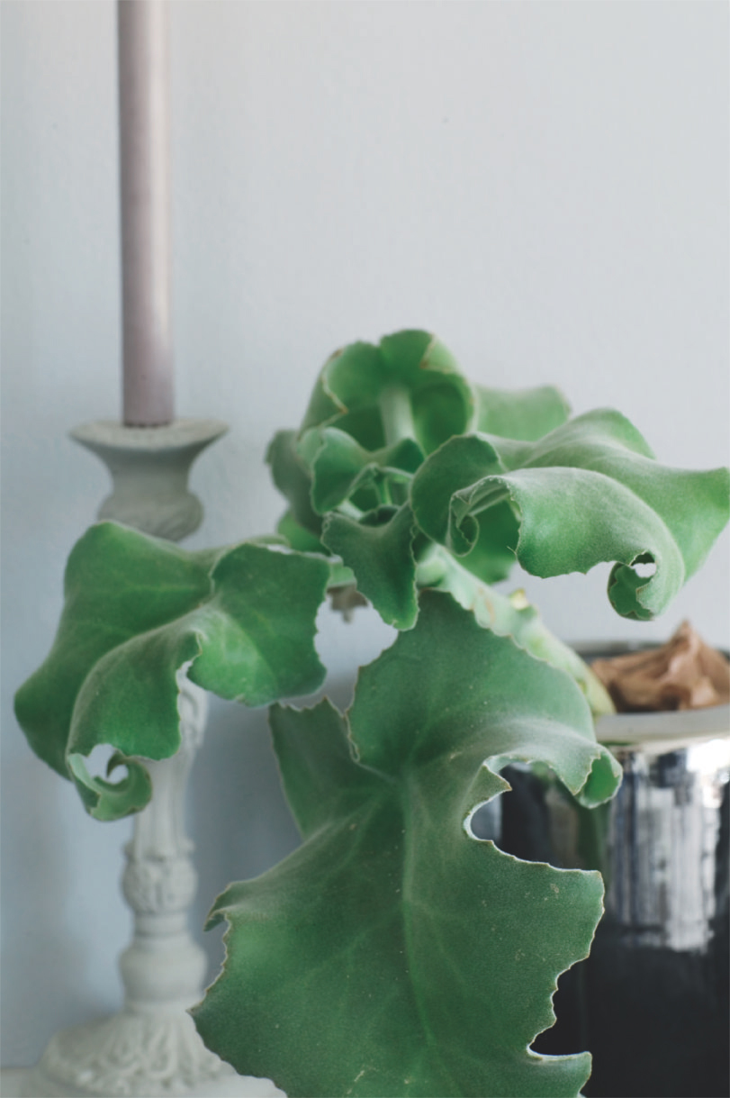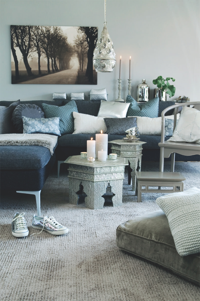 Veggene i denne stuen har fått en helt nøytral grå tone, som verken heller mot varmt eller kaldt. For å skape en helt matt flate ble det brukt en sandmaling som gir en flott struktur på veggen. Slike malinger lager forskjellige effekter avhengig av verktøyet de blir påført med, så her gjelder det å prøve seg frem.