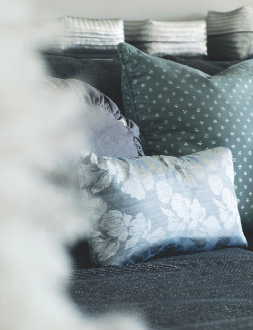 Med den diskrete bakgrunnen teppet og veggene gir, står en åpen til å utfolde seg med detaljene. Når fargerne holdes i en dempet gråskala, blir mønstre og overflater viktige for å skape variasjon.