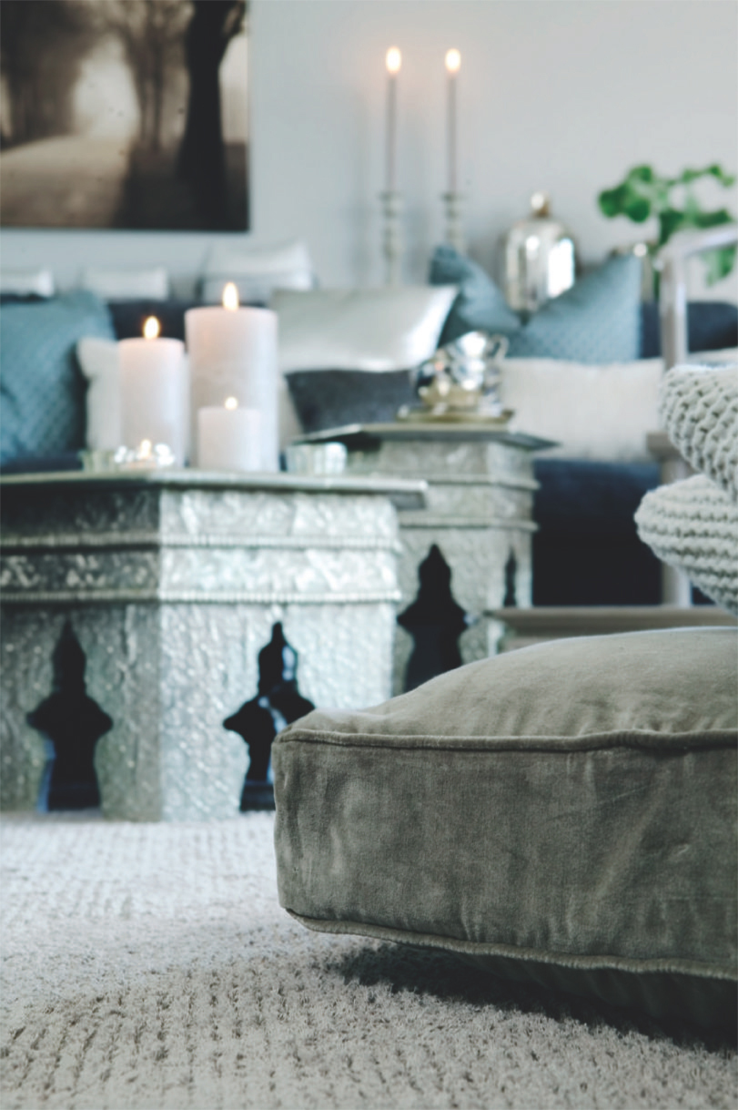 Som en myk og nøytral ramme i rommet falt valget på heldekkende teppe. Kombinert med et par store puter blir også selve gulvet et stort møbel der hele familien kan slumre.