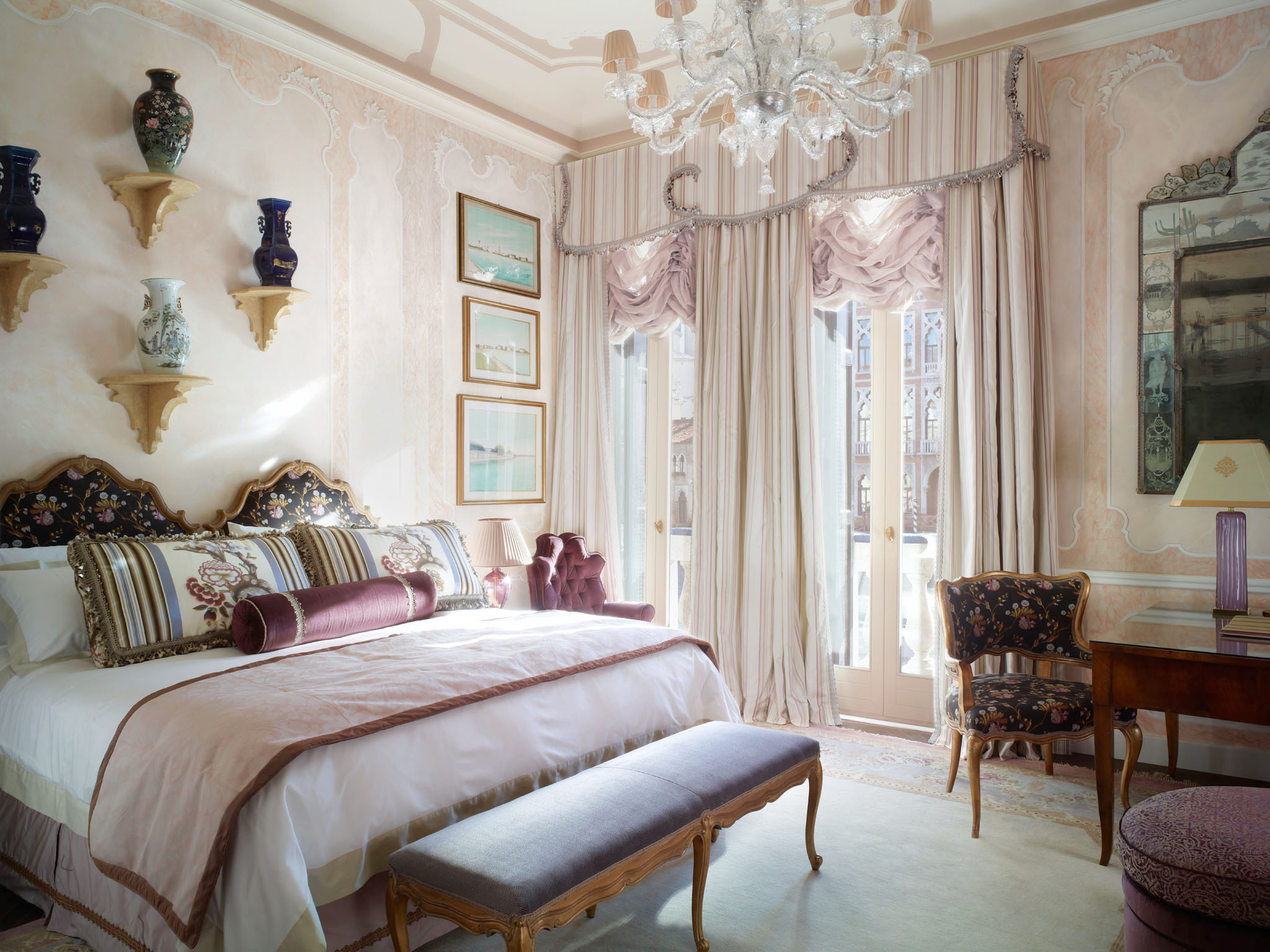Når det kommer til valg av tekstiler har Chewning ikke forsøkt seg på en direkte omgjøring fra fortid til nåtid, men heller etterstrebet en romantisk interpretasjon, med et revitalisert og kreativt blikk. Designteamet har referert mønstre fra mer enn 7000 antikke dokumenter i Rubellis ustrakte arkiv. De har valgt en rød damask til veggene i Grittis eksplorative bibliotek, og et 1930-talls Giò Ponti kappet fløyel til sofaene i suitene.