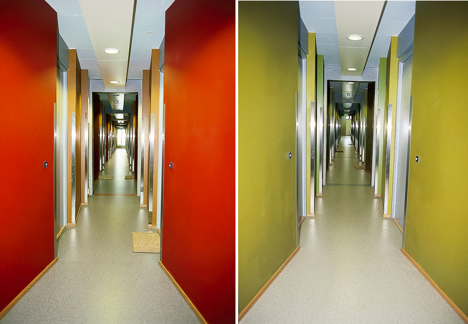 Interiørarkitekt har fargesatt gulvbelegg og veggene etter en plan. Et grått fargeinnslag går igjen i alle hybler og leiligheter, men ellers er det valgt farger fra fire hovedtemaer - oker, grønn, sjøgrønn og blå. For hver tredje eller fjerde etasjer skifter fargeinnslaget - helt opp til 16. etasje