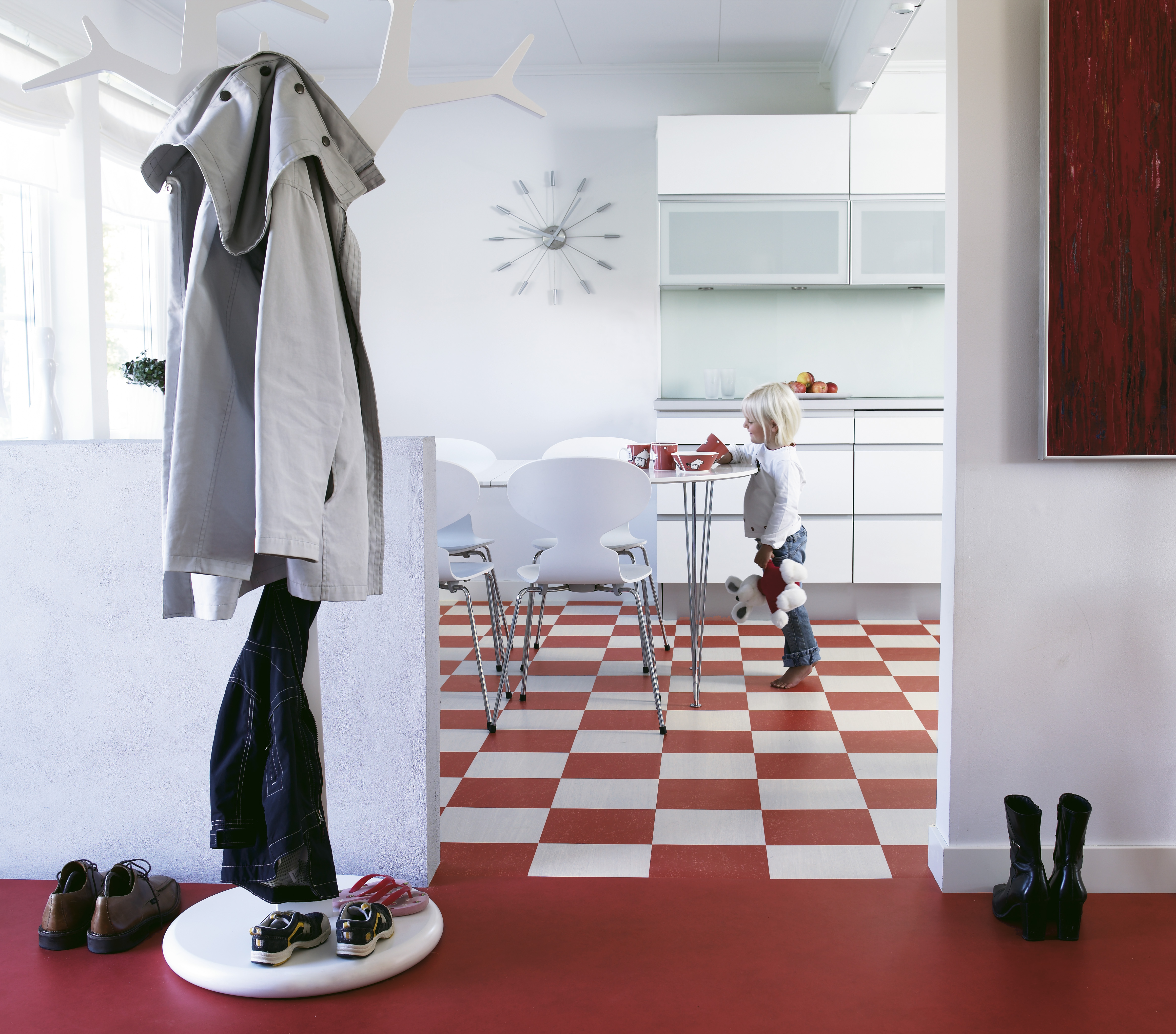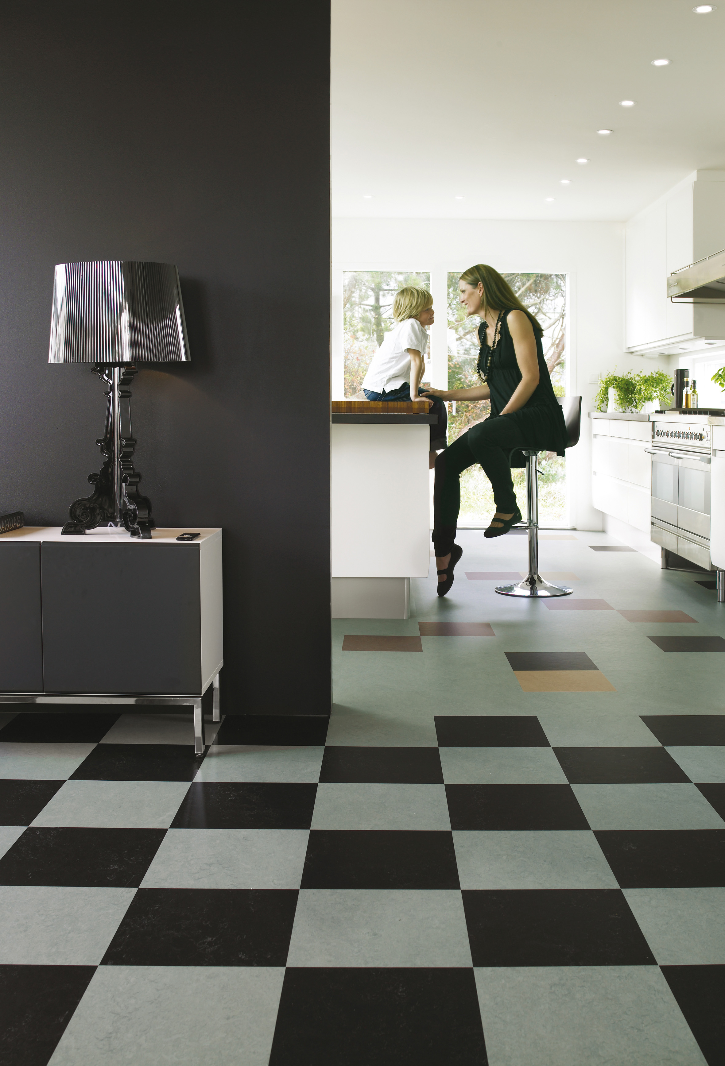 Linoleum og vinyl blir ofte forvekslet. Men selv om disse to materialene kan ligne hverandre av utseende, er de langt fra det samme. Linoleum er et naturmateriale, som også derfor bør få sin renessanse med dagens bevissthet om forurensning og klima. Produktet er økologisk svanemerket. Det er laget av linolje (linoleum på latin) fra frøene på linplanten, og tilsatt blant annet tremel, harpiks, kalkstein og naturlige fargepigmenter. Linoleum fås som banevare eller som fliser og planker. I Marmoleum Click (Forbo) er linoleumen lagt på et HDF-kjernemateriale med en bakside av kork. utstyrt med et mekanisk låsesystem klikkes gulvet sammen og legges helt uten behov for lim. 30 x 90 cm planker i kombinasjon med 30 x 30 cm fliser i 21 farger gir et utall av muligheter.