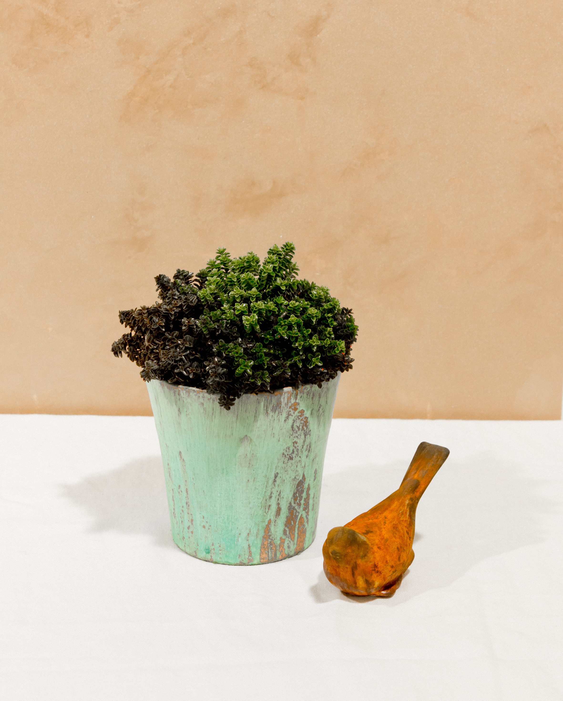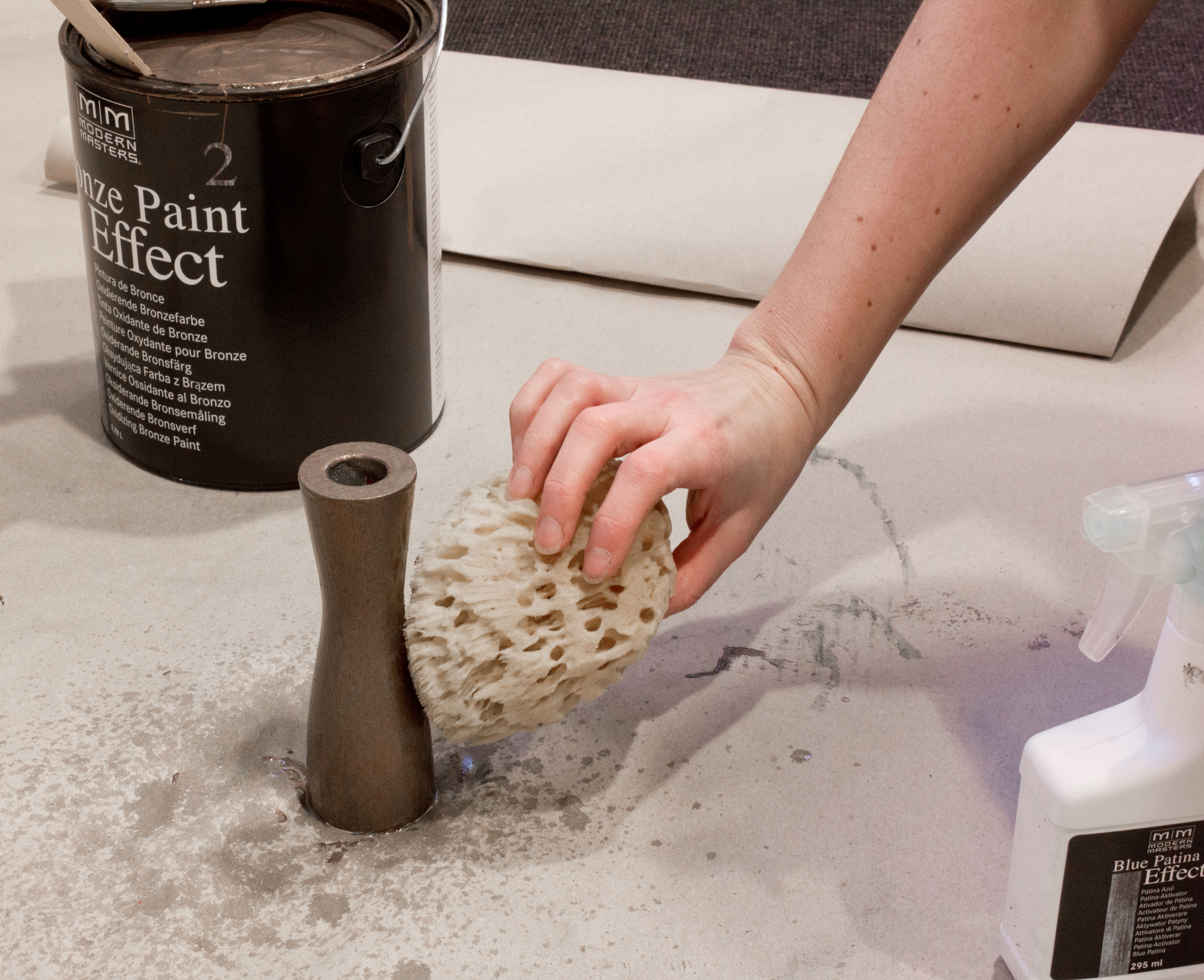 2. Primeren påføres i to strøk med pensel eller rull. Effektmalingene er vanntynnede og inneholder ekte metallpartikler, som over tid vil oksidere også uten aktivatorer, hvis flaten eksponeres for vær og vind. Men ved å påføre en aktivator eller aldringskjemikalium for blå eller grønn effekt som brukes på kobber og bronsemalingene, går oksideringen raskere, og i løpet av timer får flaten den vakre, oksiderte flaten som ville ha tatt mange år i friluft å få frem.