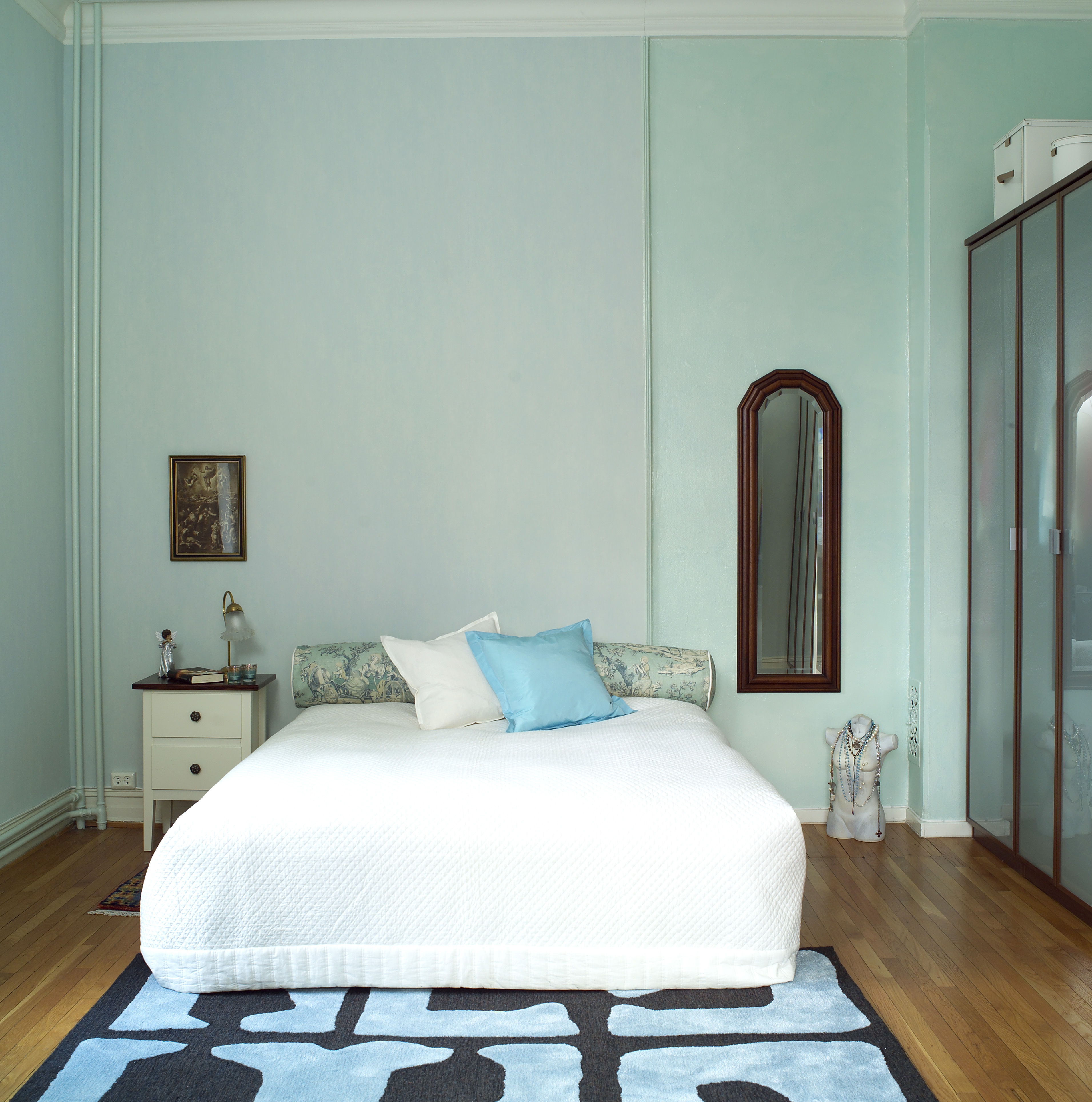 Soverommet fikk ny tapet i en turkisblåfarge, som er en farge i tiden. Fargen gjør seg godt på et soverom, men har også gitt liv til resten av leiligheten og binder rommene sammen til en helhet.