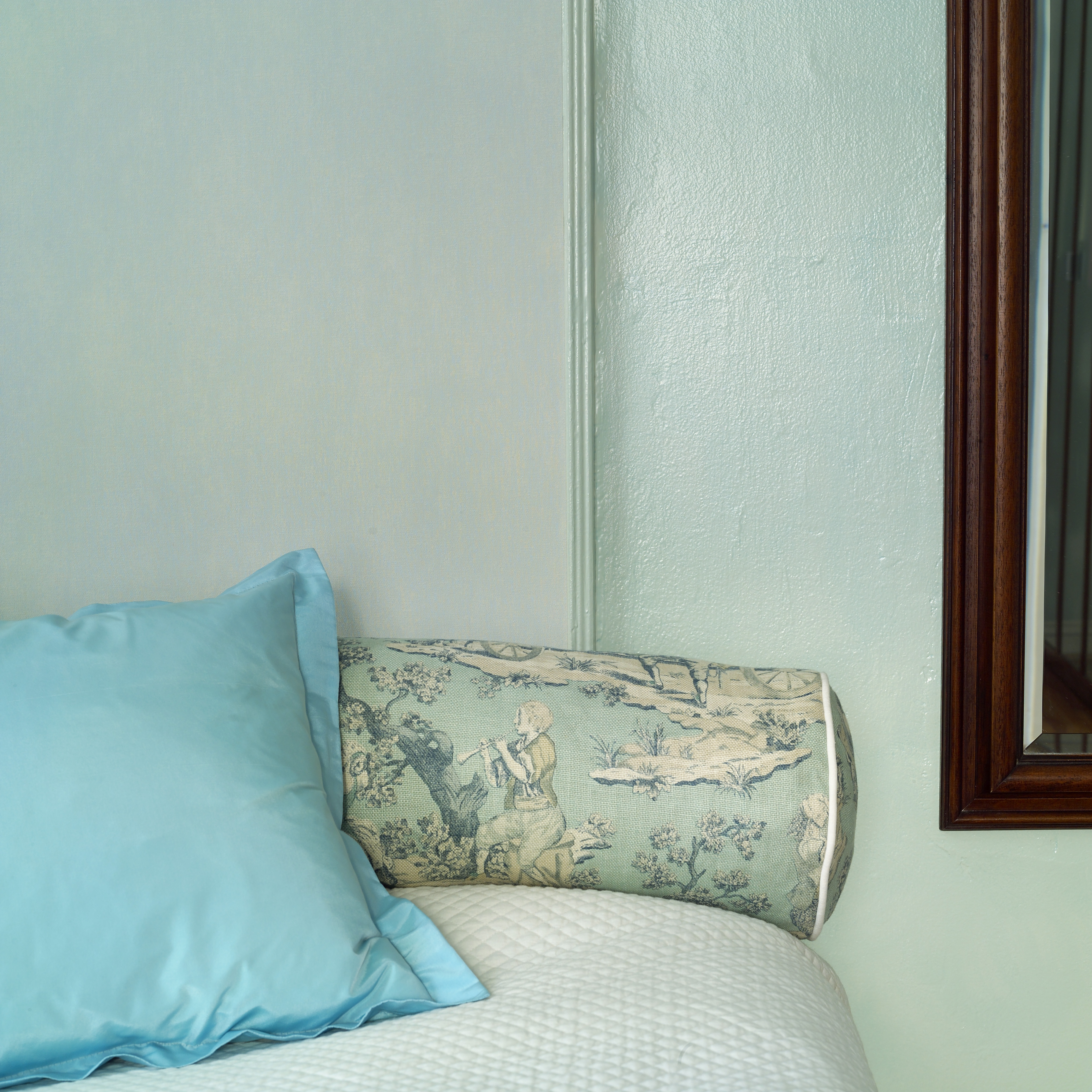 På soverommet er det både tapetserte vegger og vegger i ren mur. Fargen er den samme på alle. - Vi er nærmest opplært til å male murvegger og tak hvite, men her har vi valgt å unngå et stort hvitt felt i den blå helheten. Derfor er muren malt slik at den går i ett med den tapetserte delen av rommet, forteller Lønnestad. Inni mellom må man være litt modig for å få et spennende resultat.