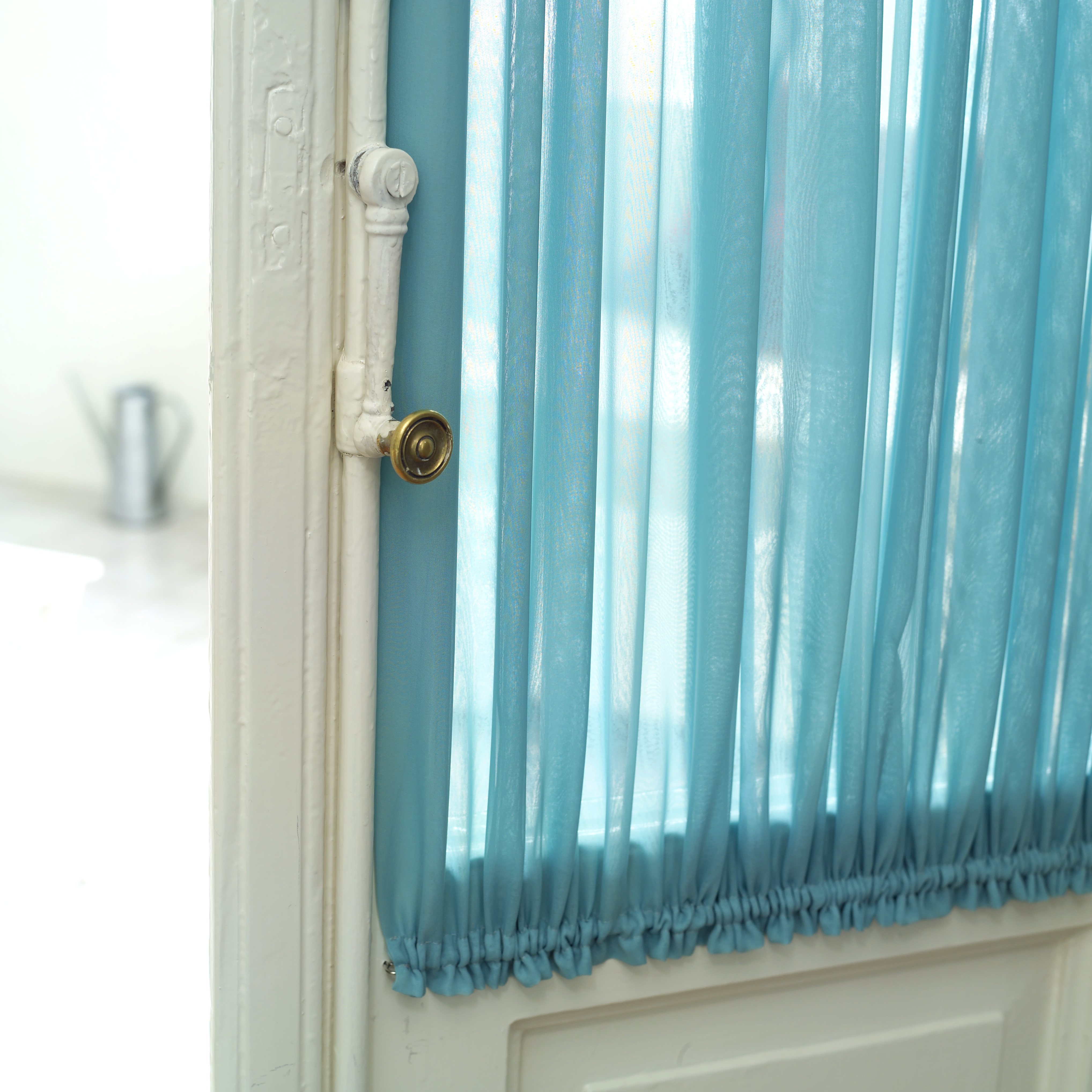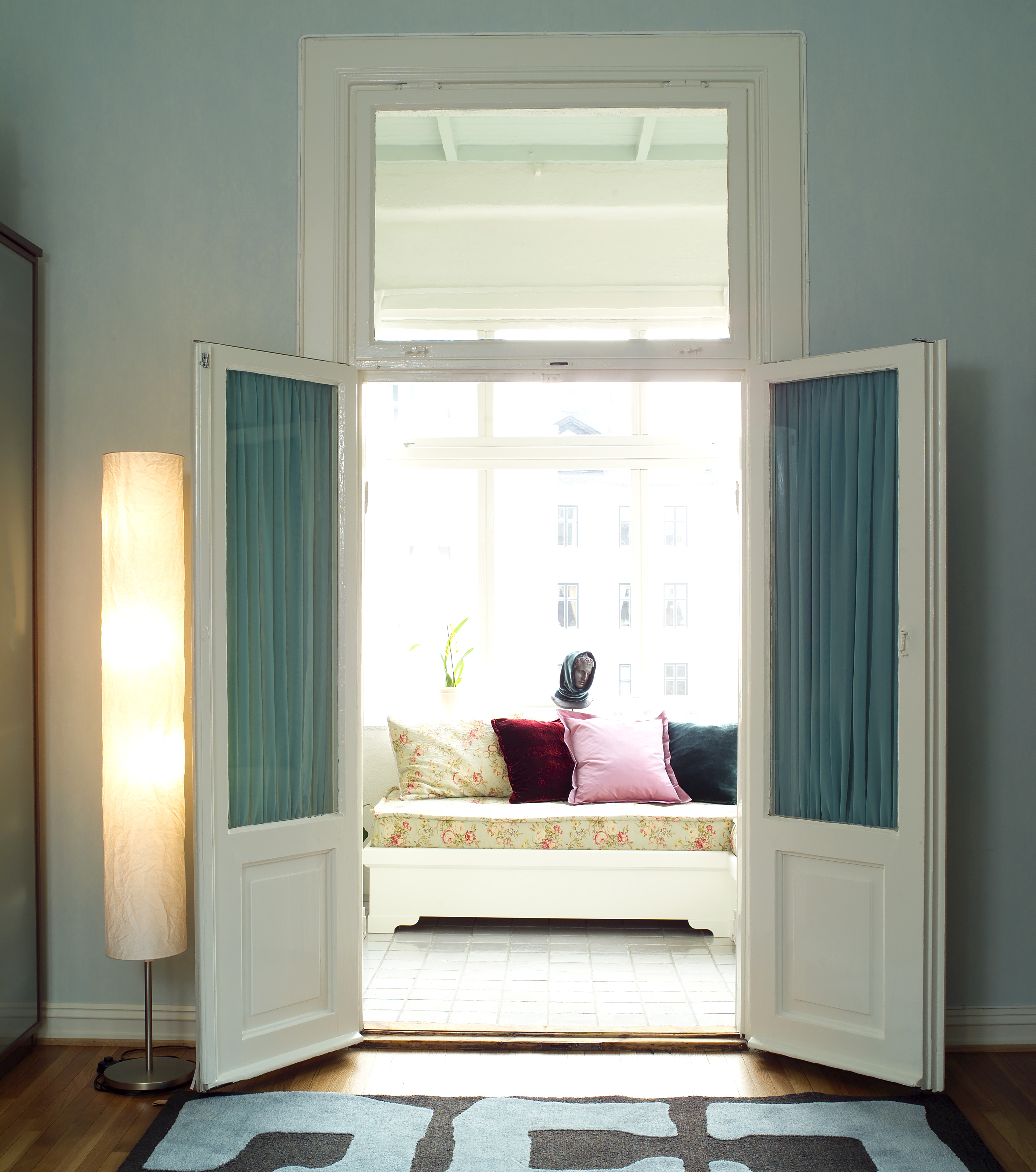 Blåfargen ble bindeledd mellom leilighetens glassveranda og soverom. Dermed ble hagestuen en tydeligere del av resten av leiligheten og fikk et utvidet bruksområde. I utgangspunktet var dette lille rommet møblert med mye smått løsøre. Planter og småbord tok mye gulvplass og et mørkt teppe skjulte flisegulvet.