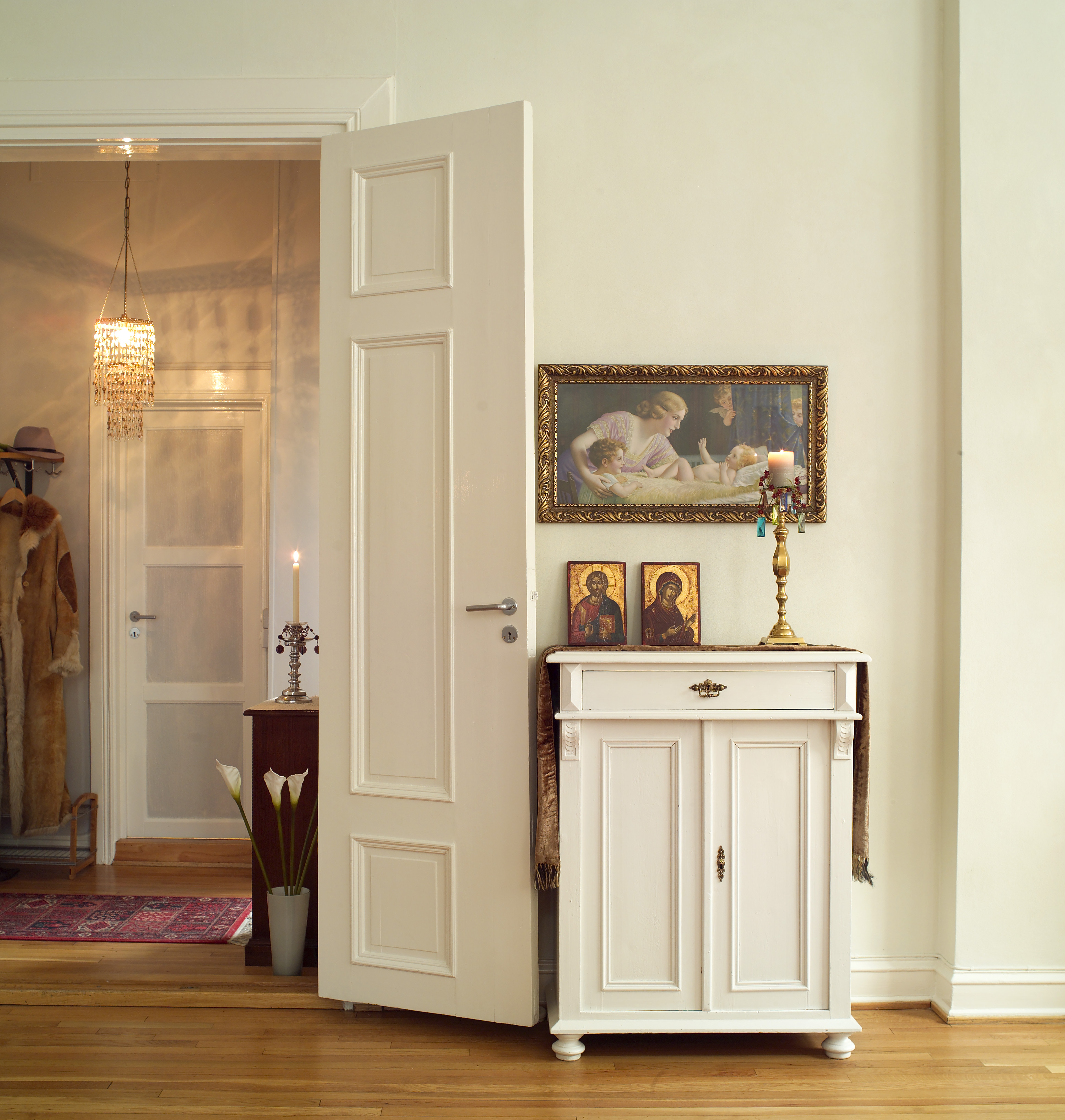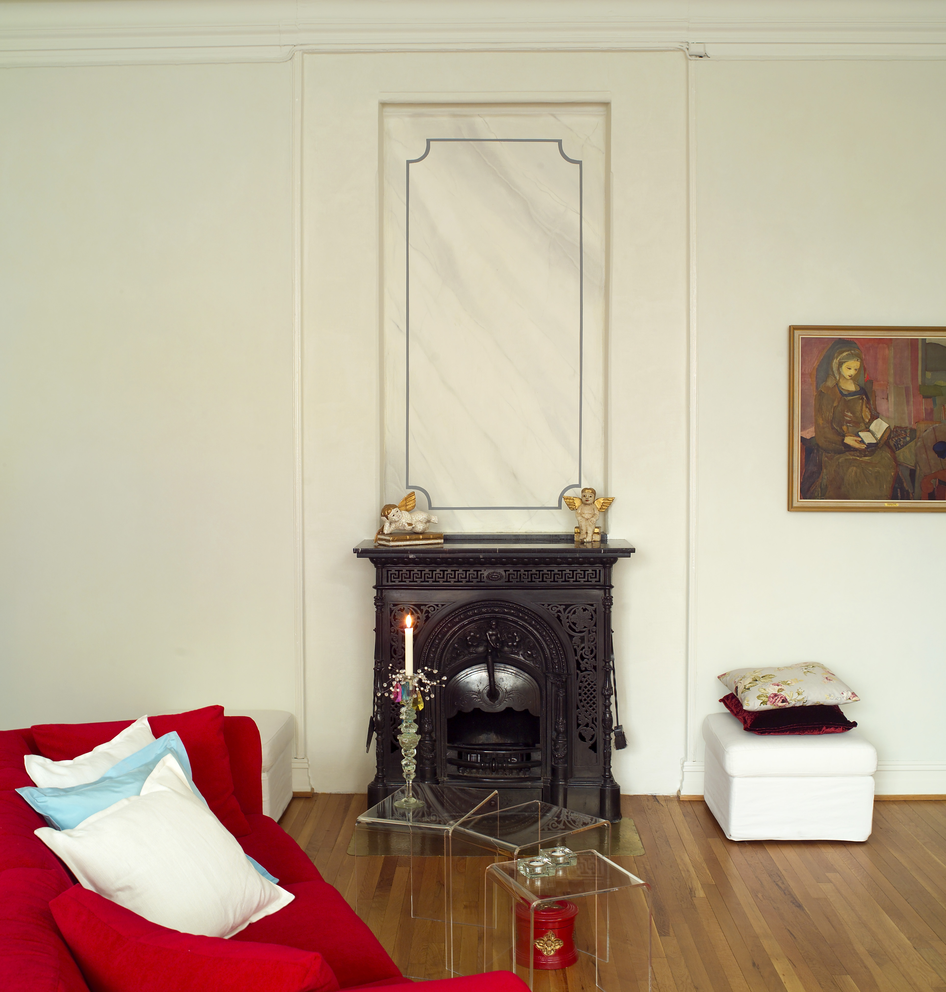 Veggene i stuen var slitte og preget av dårlig grunnarbeid. De ble malt på nytt og fikk samtidig en spennende murlook. Dermed ble det lyse inntrykket beholdt, men veggene fikk mer liv og varme. Nisjen bak den klassiske støpjernsovnen fikk også nytt liv med kreative penselstrøk.