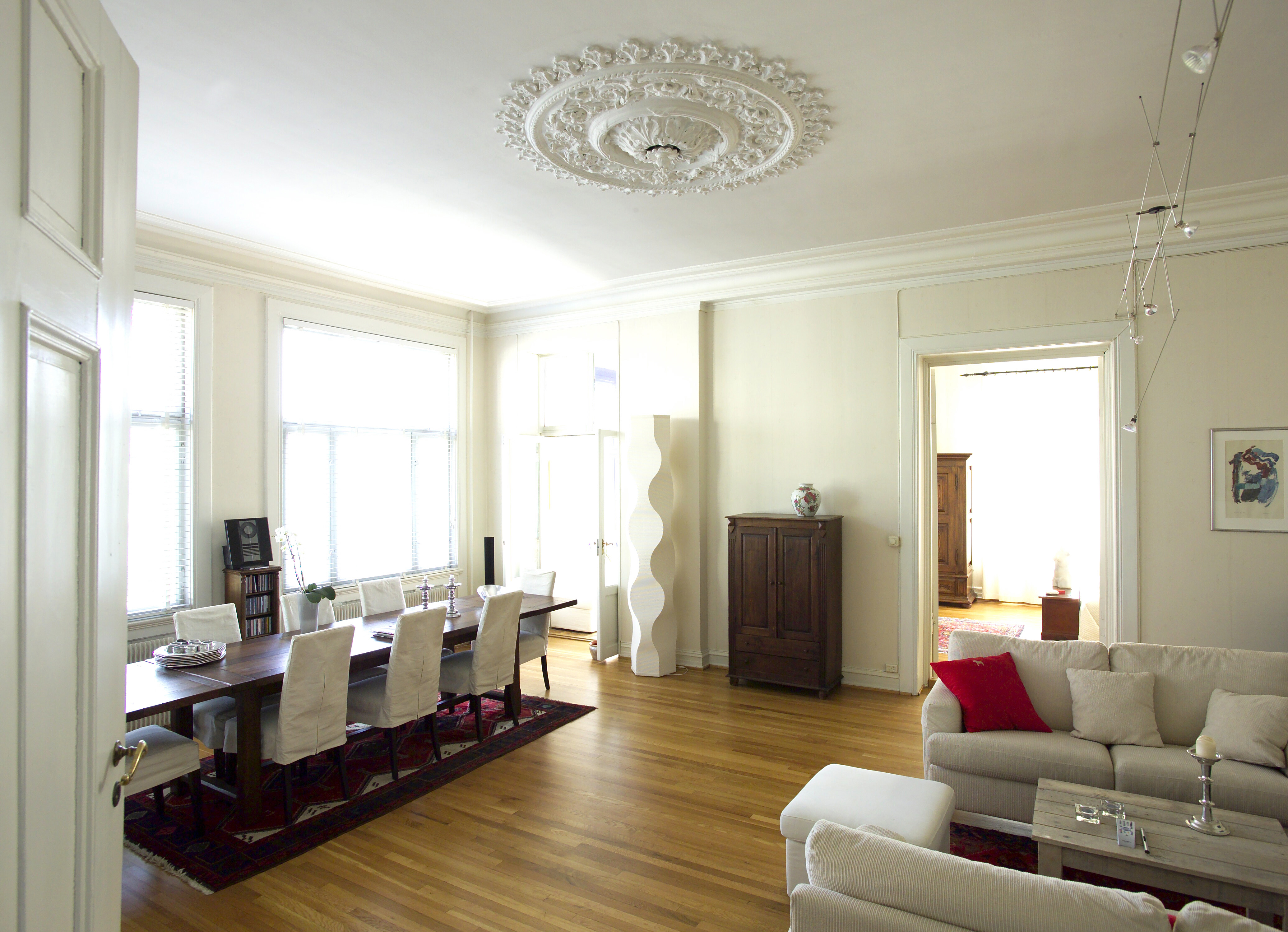Med unntak av et stort mørkt gulvteppe og spisebord, var stuen holdt i hvite nyanser. Den opprinnelige møbleringen ga imidlertid rommet et litt ubalansert uttrykk. De mørke møblene var nemlig samlet for seg på den ene kanten av rommet, mens to hvite sofaer og et salongbord i lyst tre var plassert mot den andre veggen.