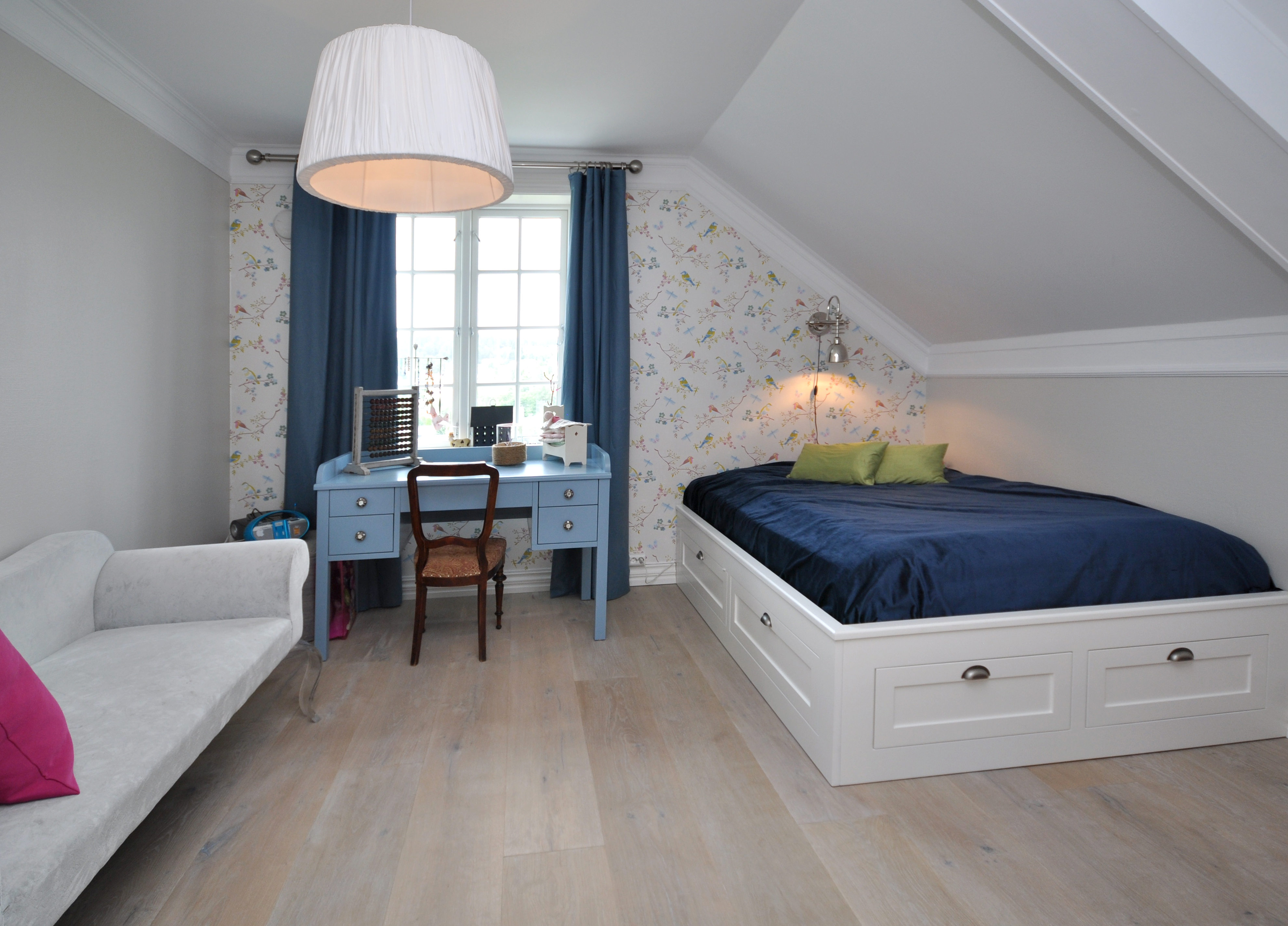 Da de skulle velge gulv, tok de først utgangspunkt i tapetet. Kona hadde størstedelen av interiørvalget.
