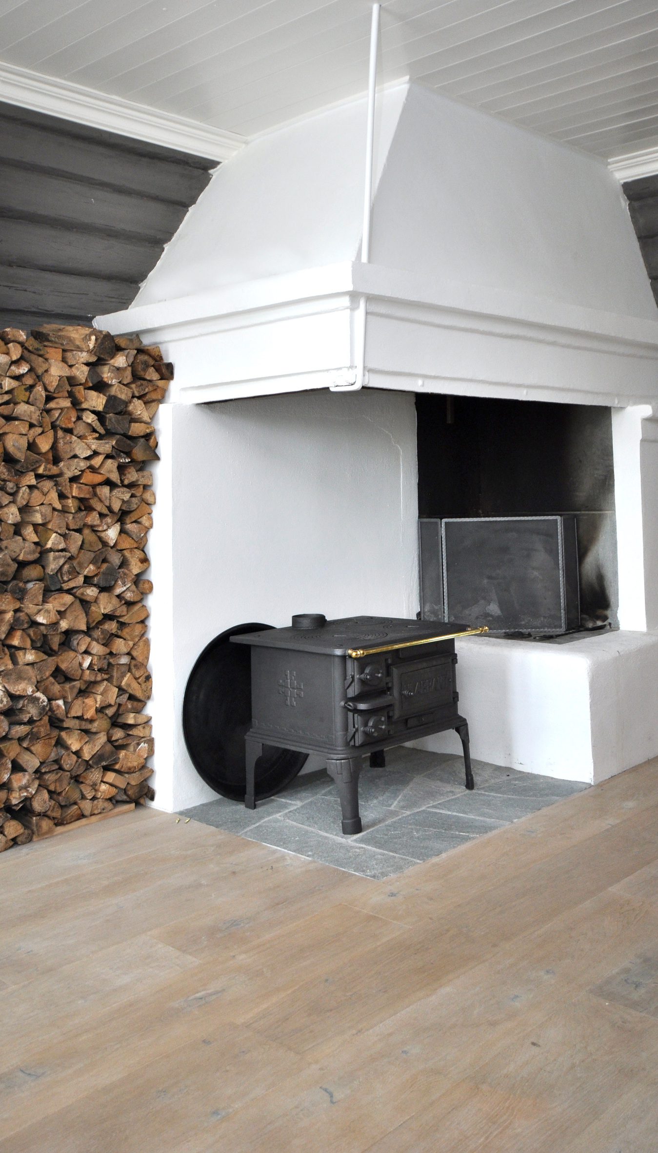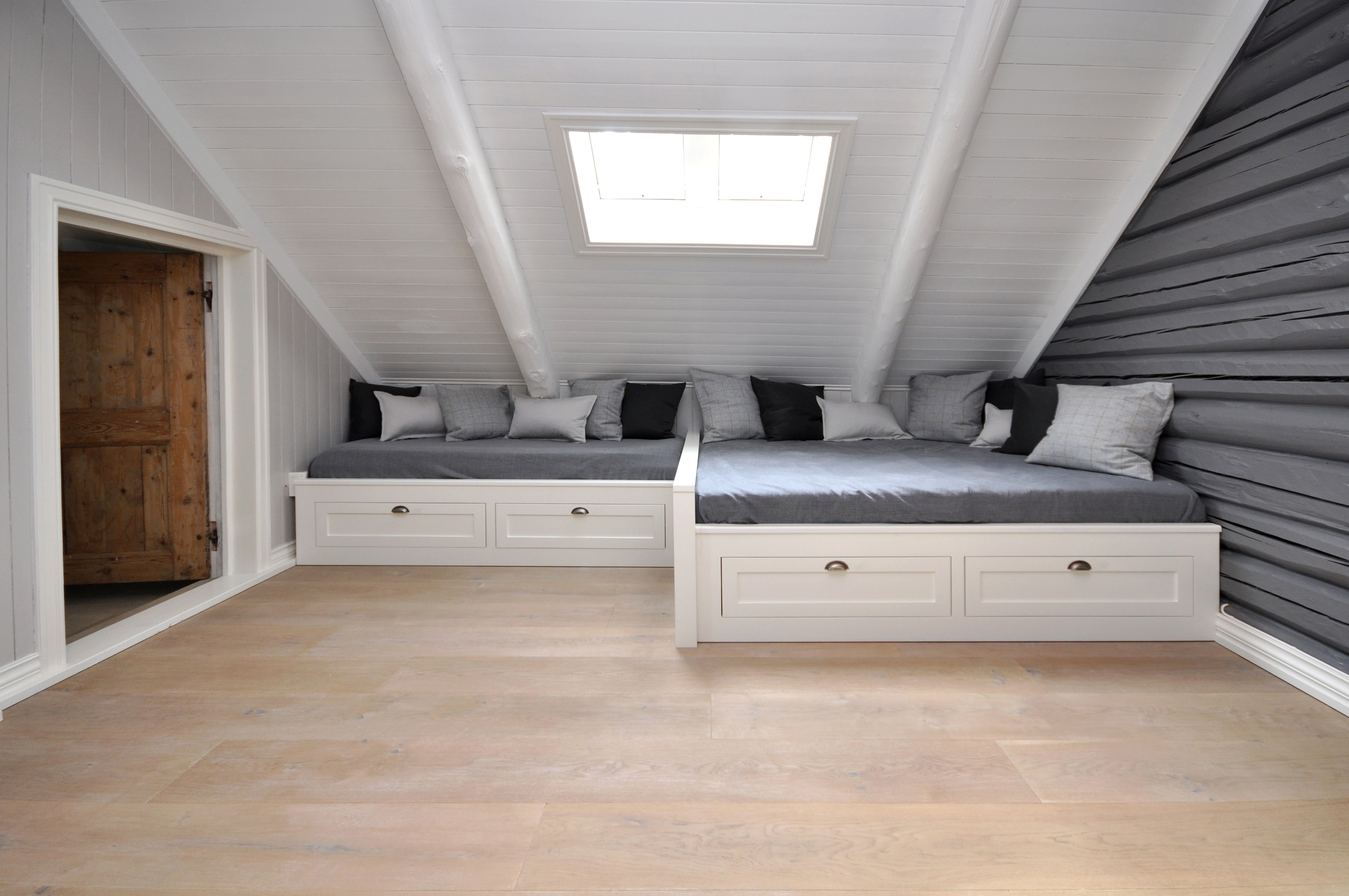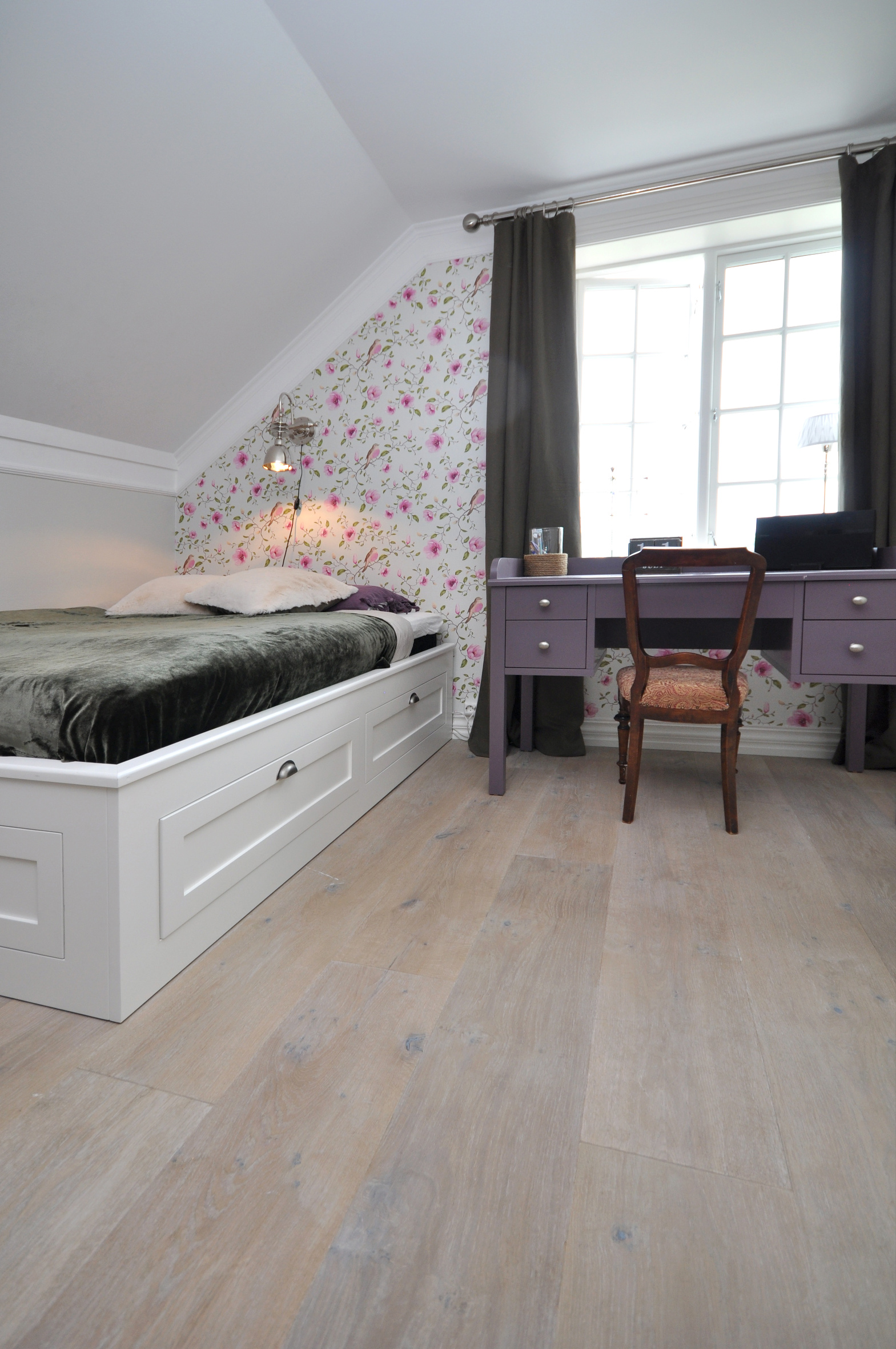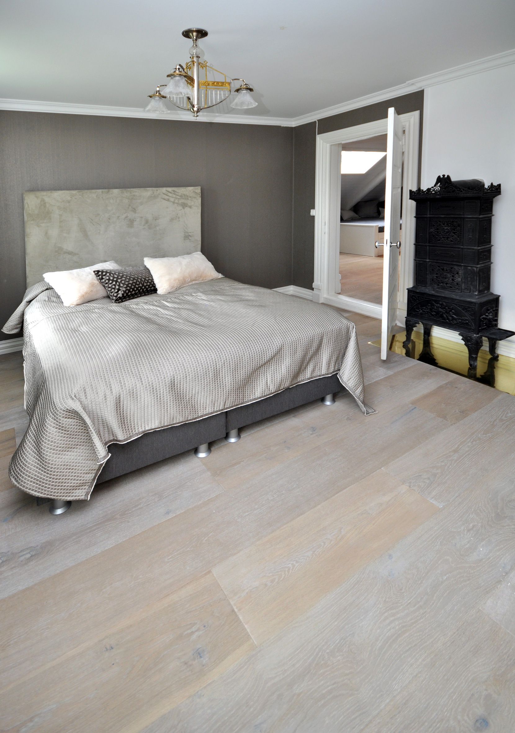 – Vi skulle ha et gammelt gulv som likevel oppleves moderne, og et slitt eikegulv har vi lenge hatt lyst på. I en gammel gård som denne ville det vært umoderne å legge et kirsebærgulv. Gulvet skulle i tillegg tåle mye gjester og tøff bruk, for vi har ofte selskap. Vi valgte brei plank med hvitfarge som vi la i hele huset for å få en gjennomført stil, forteller familiefaren.