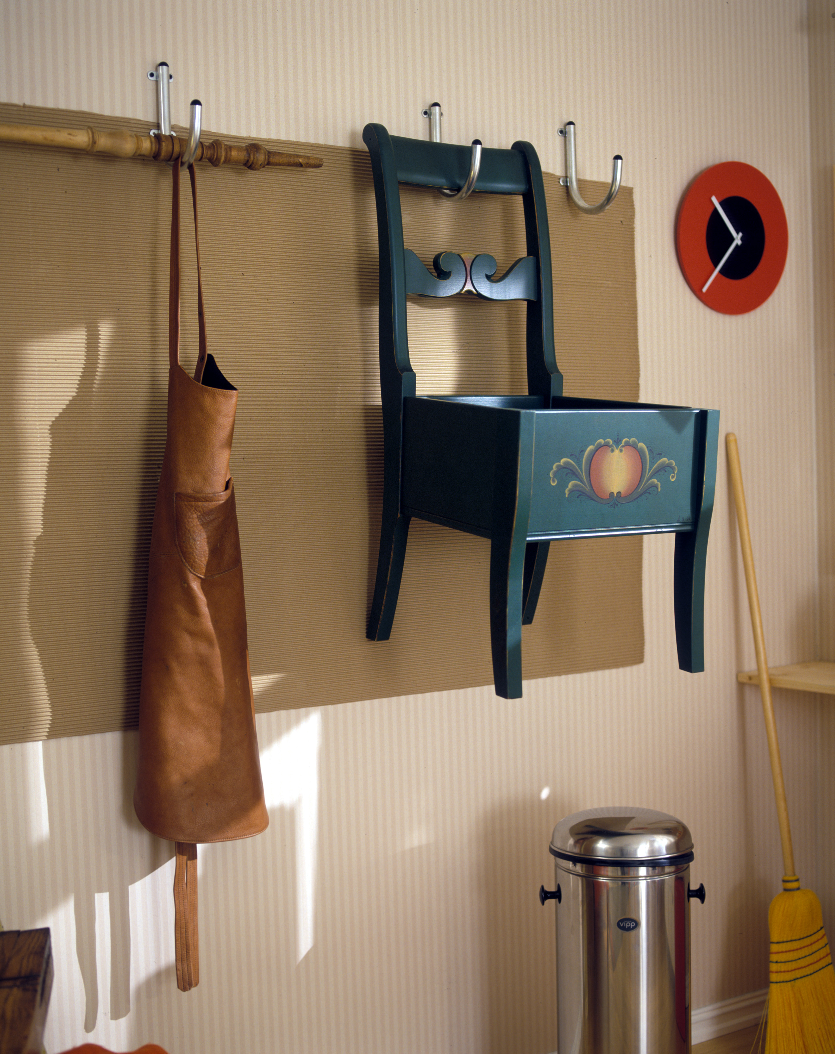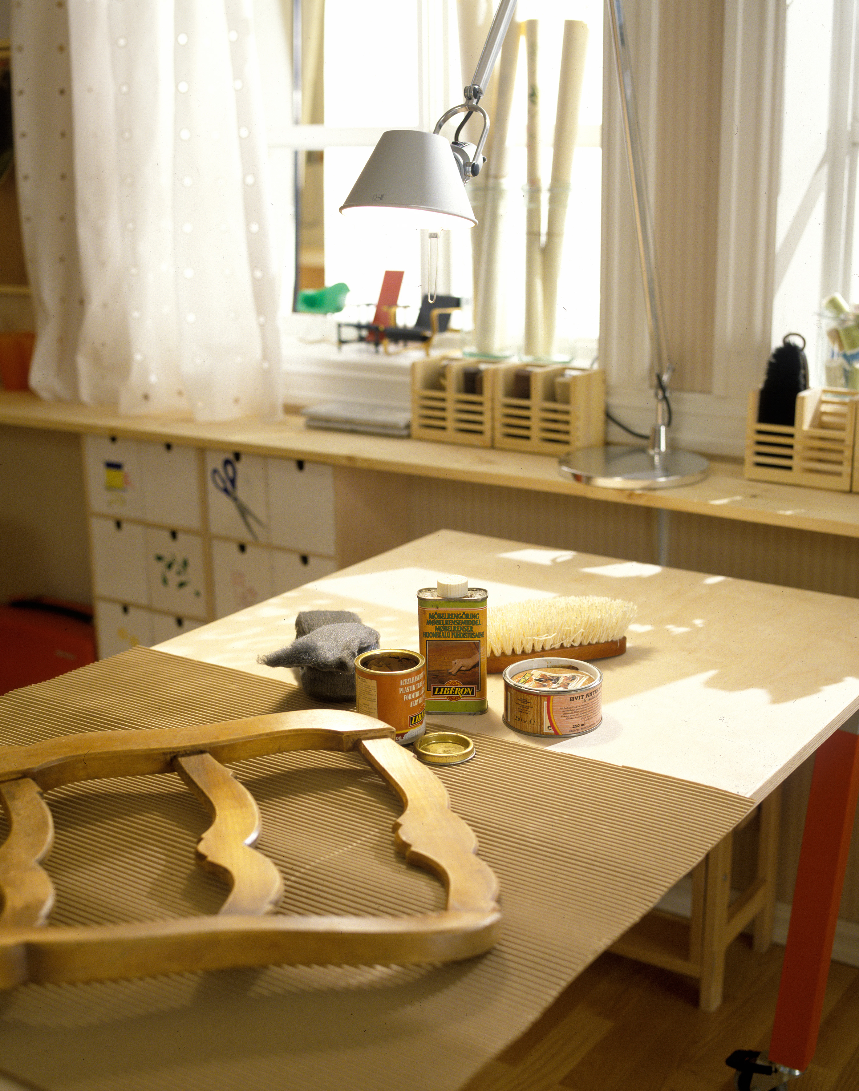 Rommet er sparsomt møblert. En smal hylle under vinduet gir plass til bokser og krukker som rommer mange viktige småting. Under hyllen henger kommoder med små skuffer og verktøy. Skuffene er hengt opp for å frigjøre gulvet og lette rengjøringen. Her blir det ofte både sagflis og støv under arbeidet, så det er praktsikk å komme til med kost og brett.