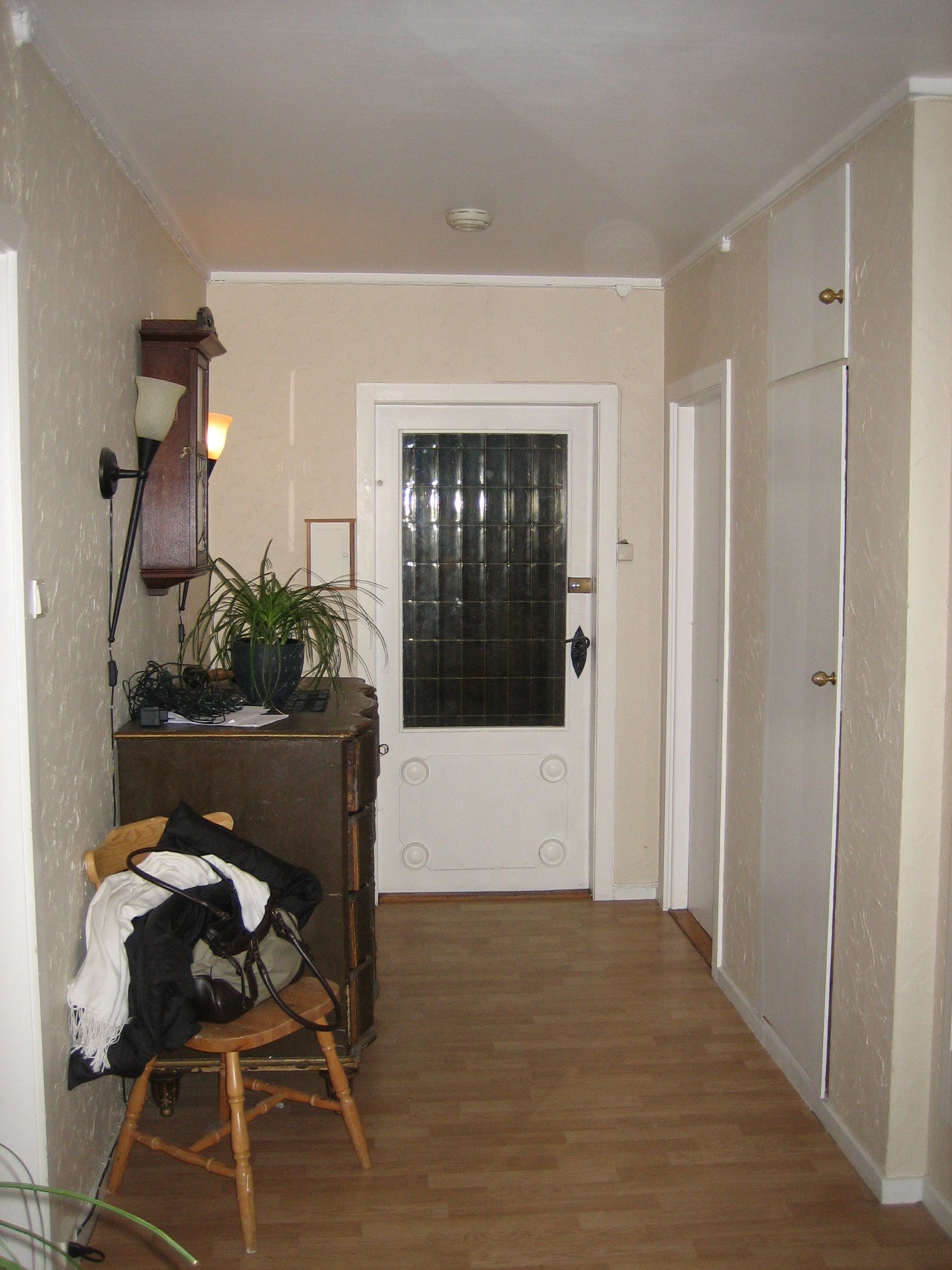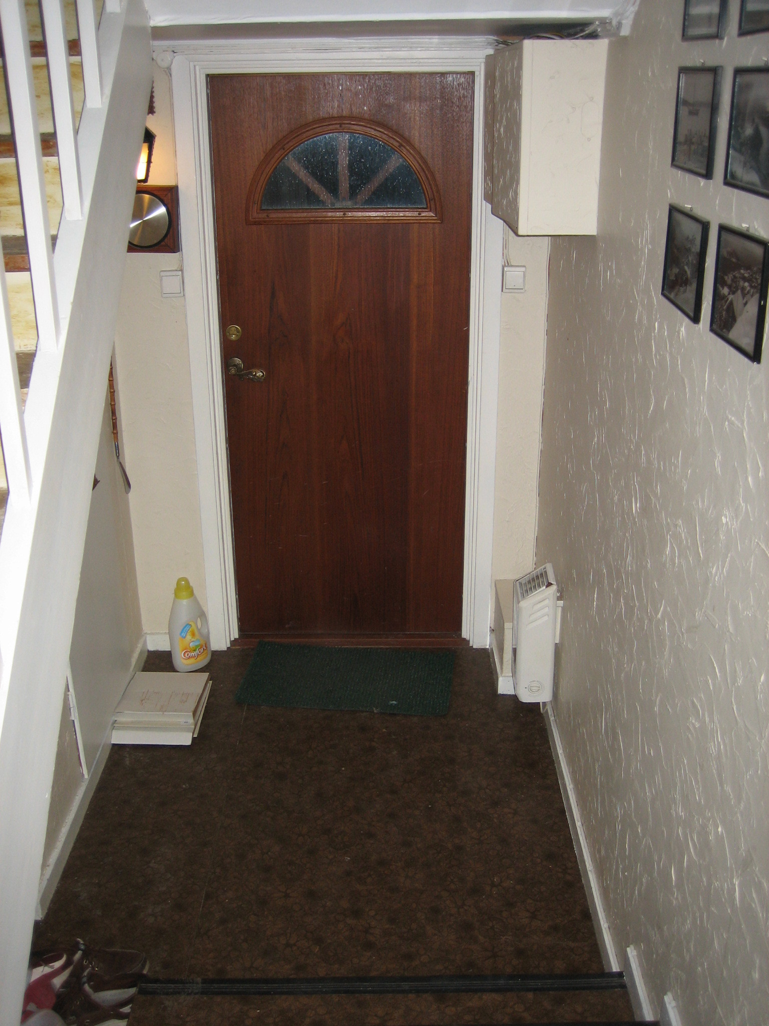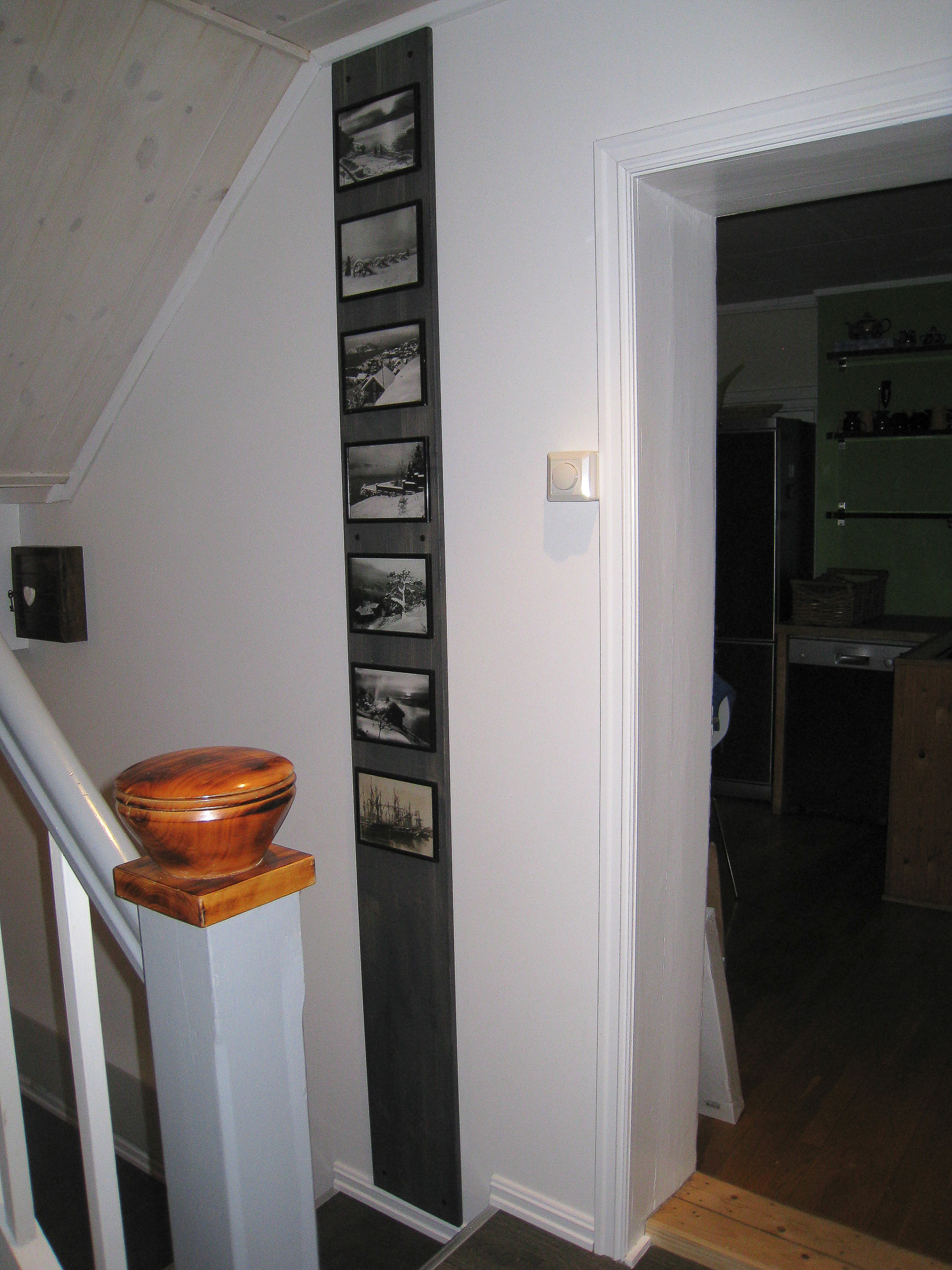 Innebygde skap måtte vike for skyvedørsgarderobe. Gamle bilder i sort-hvitt, fra nærmiljøet, ble montert på en treplate som ble beiset. På den måten kommer de mer til sin rett, i tillegg til å være et dekorelement i gangen.