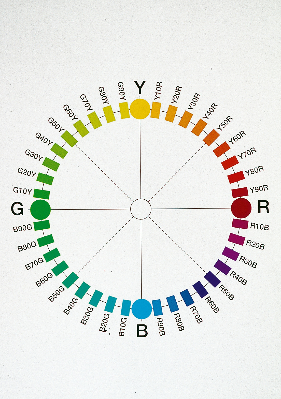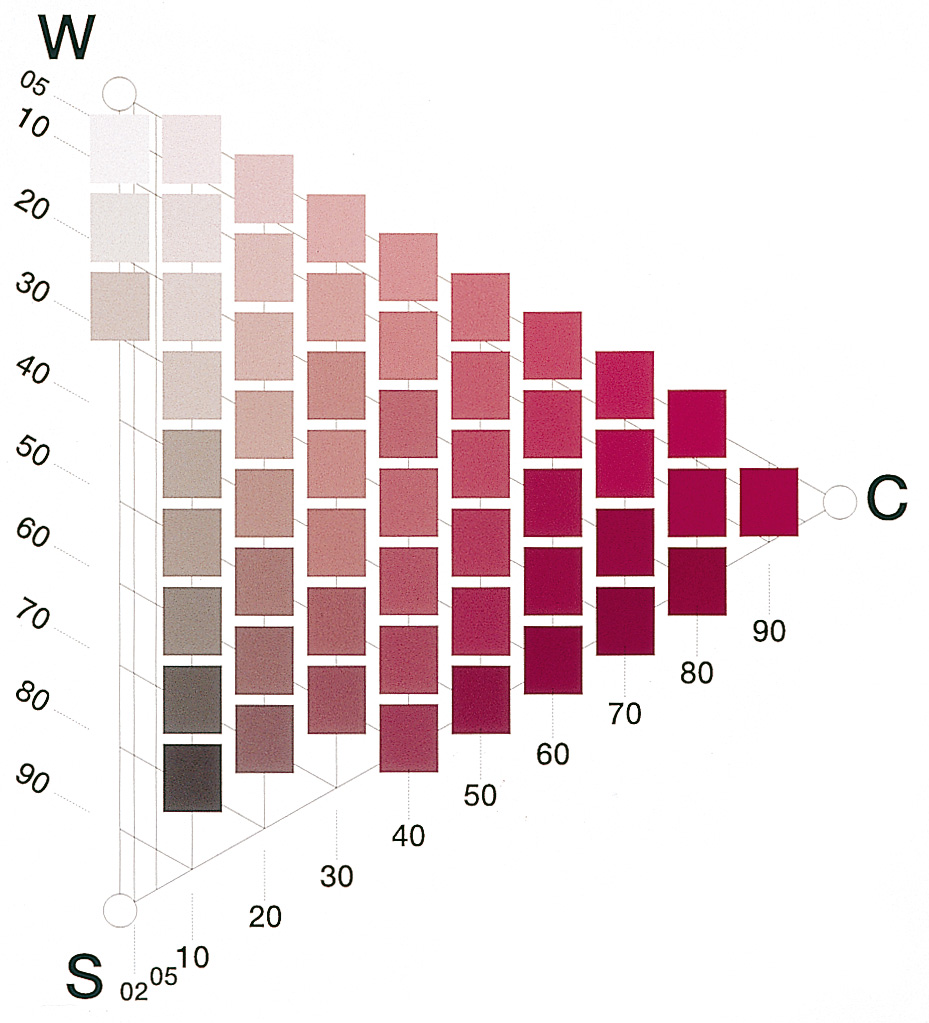 Nyansetriangelet gir et bilde av forholdet mellom sorthet, hvithet og kulør i en farge. Den første delen av fargekoden uttrykker dette blandingsforholdet. I koden angis først prosenttallet for sorthet, dernest for kulør. Resten opp til 100 % utgjøres av hvitt, men er overflødig å skrive. Er tallet for kulør høyt, får vi sterke signalfarger, er det lavt, får vi duse, neddempede farger. Er tallet for sorthet høyt, får vi mørke, grålige farger. Høy andel av hvitt gir lyse pastellfarger. Vi bruker det samme kode-eksemplet igjen: Bak tallet 1040 ser vi nå at det skjuler seg en lys, frisk farge med bare 10% sort og 40% kulør, de resterende 50% er hvitt. Merk deg: nyanse-triangelet uttrykker bare nyansen, ikke kuløren.