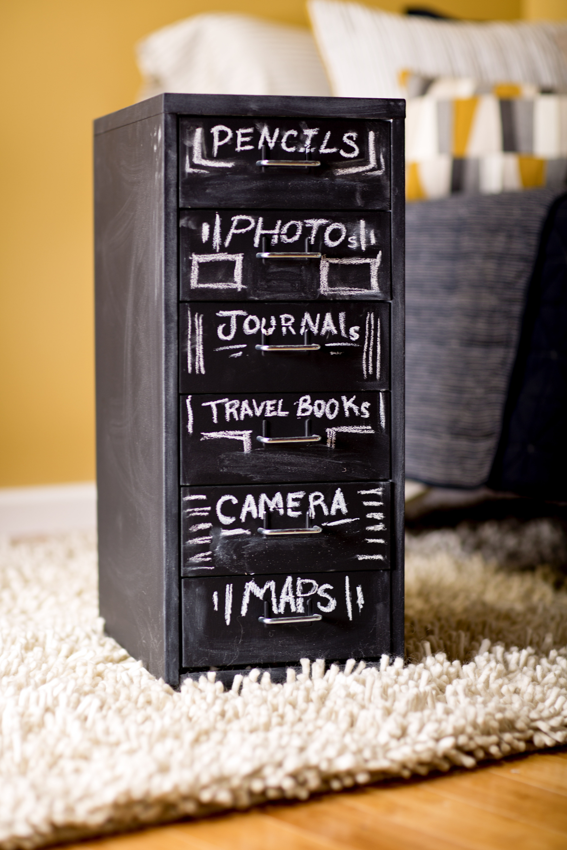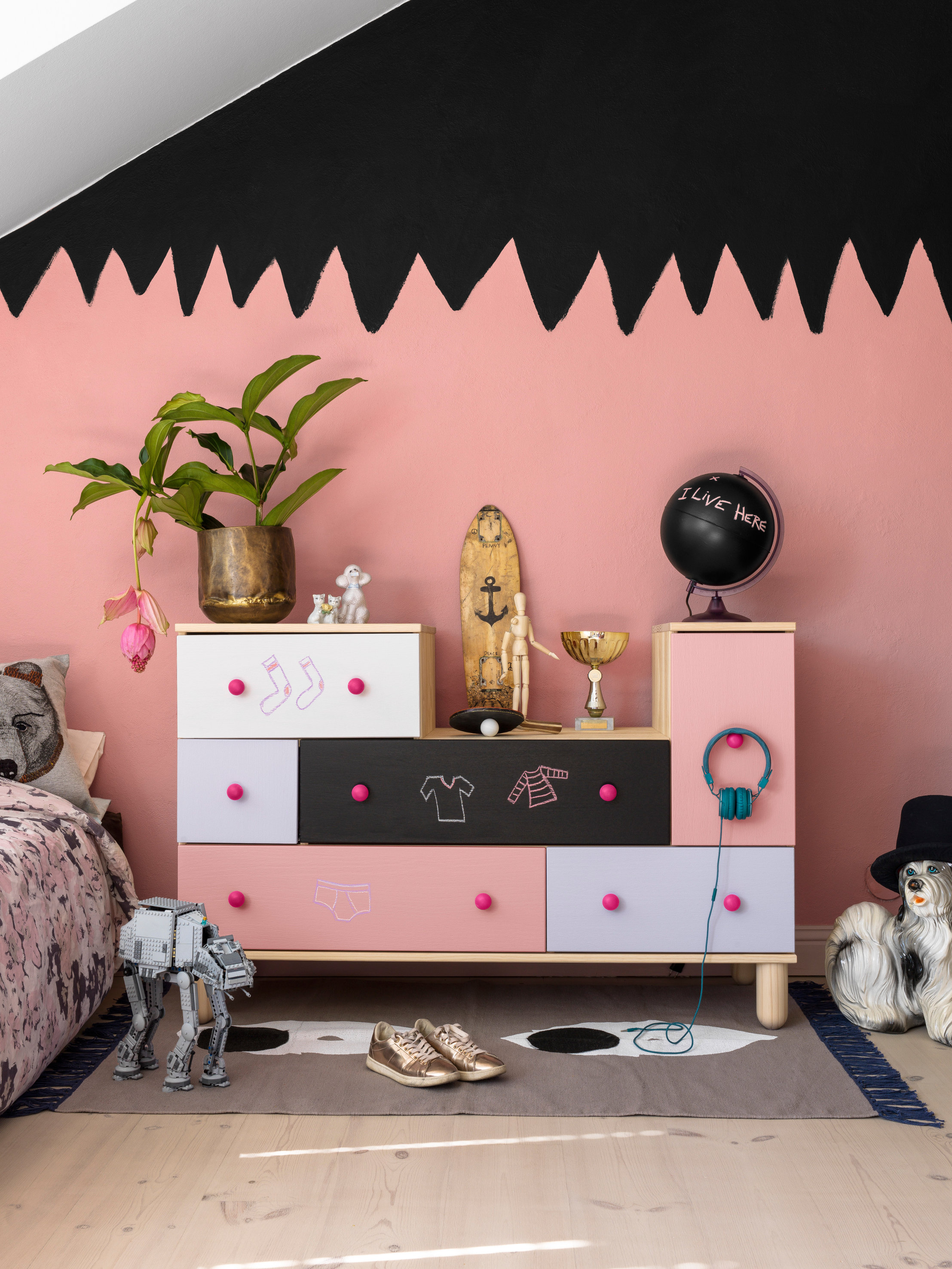 Hvorfor ikke male skuffene på kommoden i ulike farger? Én for sokker, en annen farge for truser, og en tredje på skuffen der t-skjortene skal ligge. Bruker du attpåtil en skoltavlemaling kan du og barnet sammen tegne bilder av det som skal inn i skuffen. Med et strøk magnetisk maling under overflaten kan du til og med sette opp bilder på skuffene.
