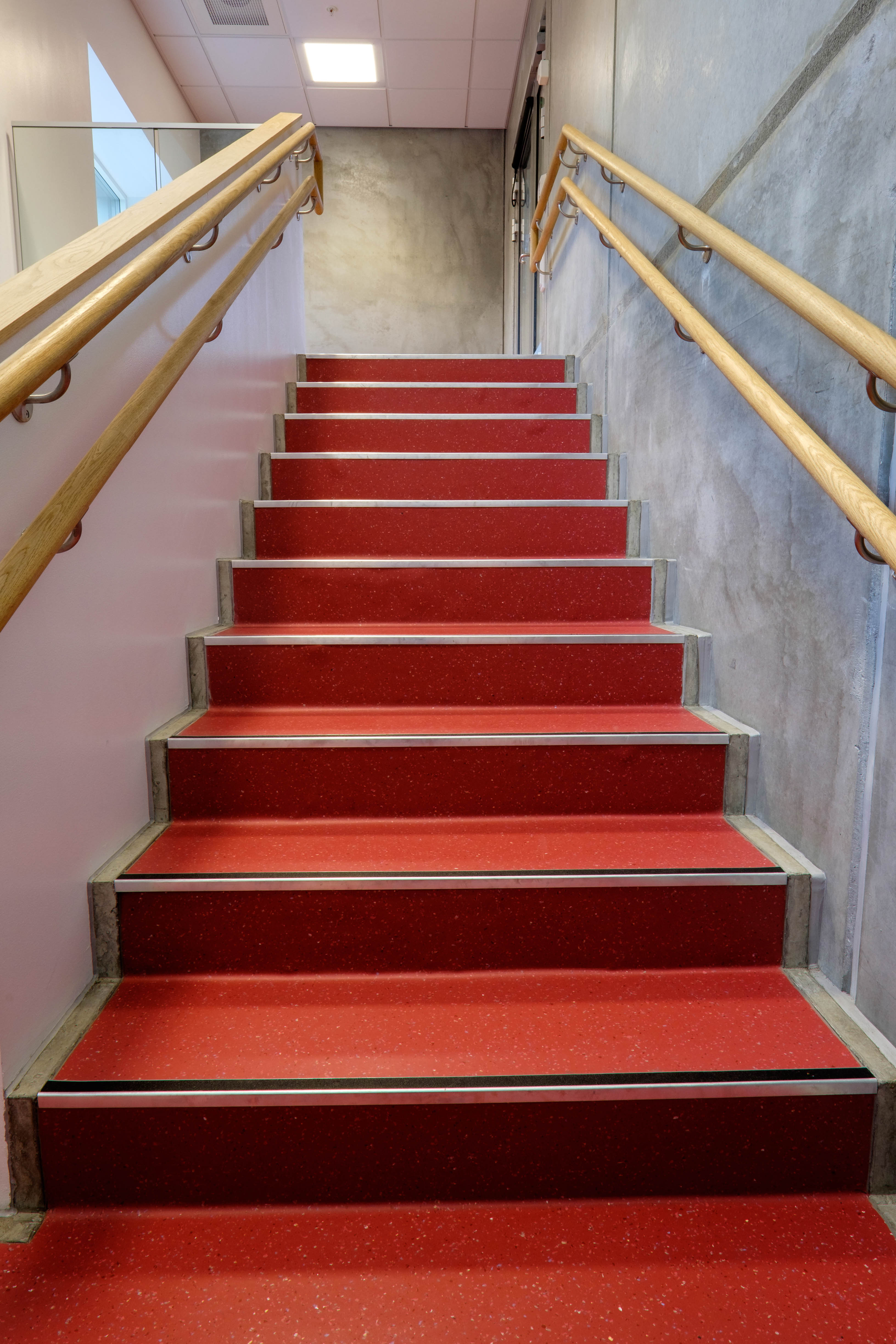 – Håndverksmessig har dette blitt et veldig fint prosjekt, sier Kjell Kringberg fra Polyflor. De har levert alt gulvbelegget til den nye skolen, hele 4260 kvadratmeter vinyl i 8 ulike farger. Utvalget av farger var avgjørende for at det ble Pearlazzo PUR, en 2 mm homogen vinyl. Den finnes i totalt 24 farger.