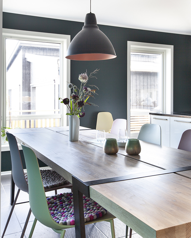 Kjøkkenet har store vinduer, og siden familien ønsket en varm og innbydende følelse i rommet, falt valget på denne mørkere nyansen. Et rom med så stort lysinnslipp tåler en mørk nyanse godt, uten at det gir en følelse av å bo i en hule.