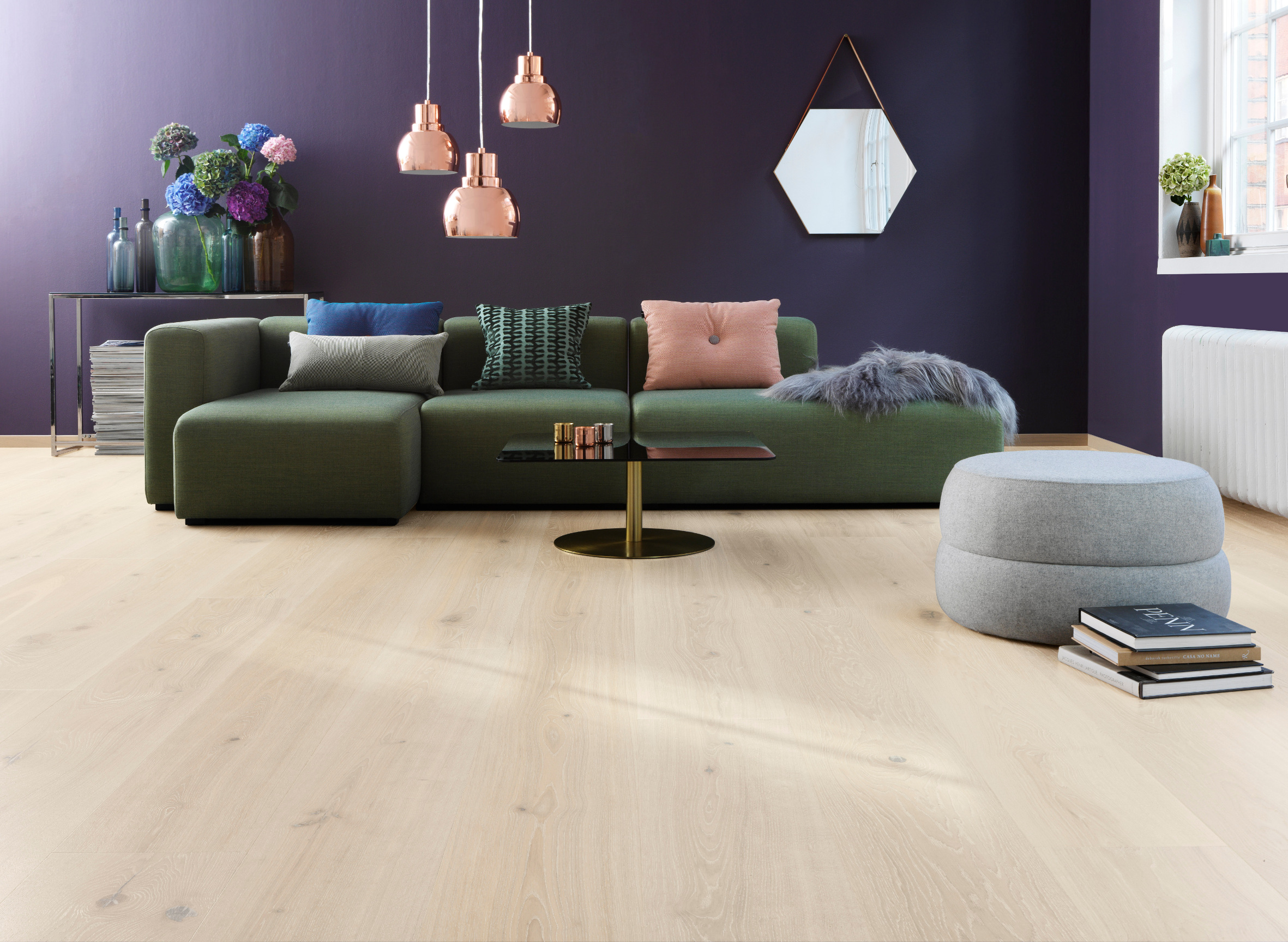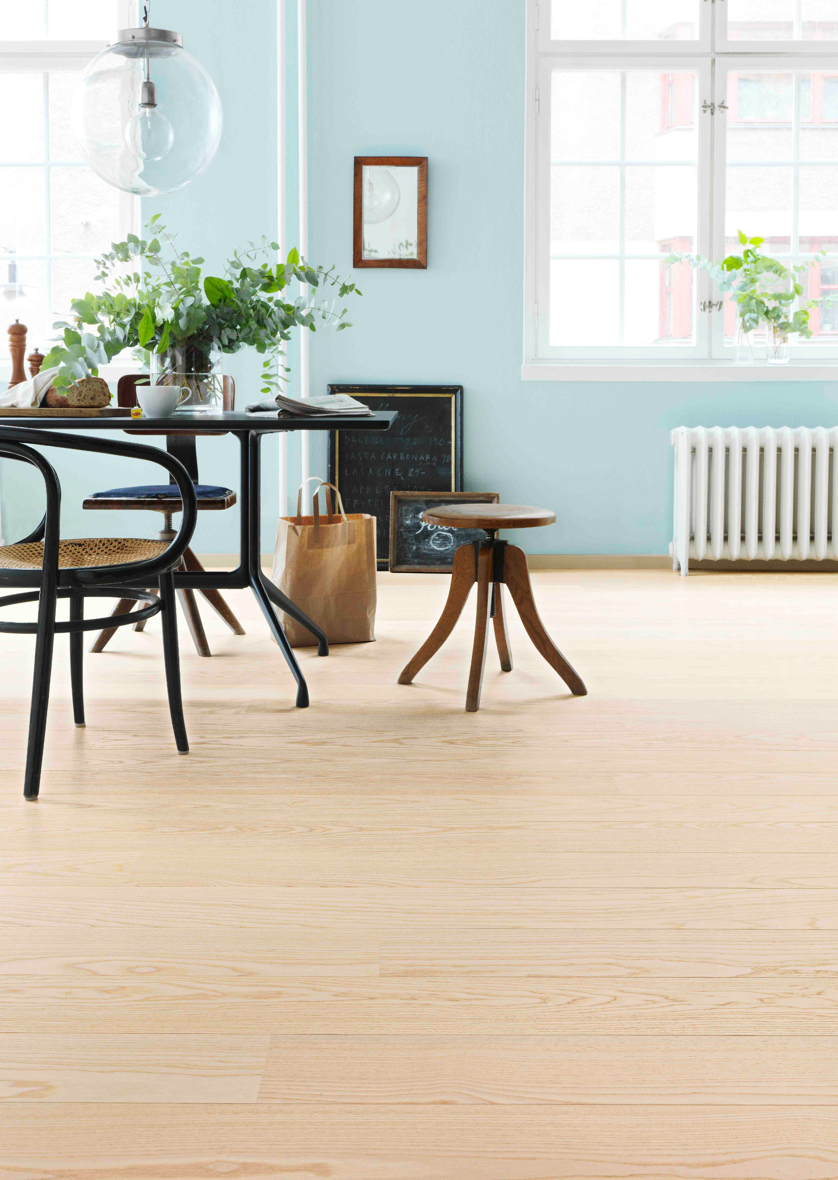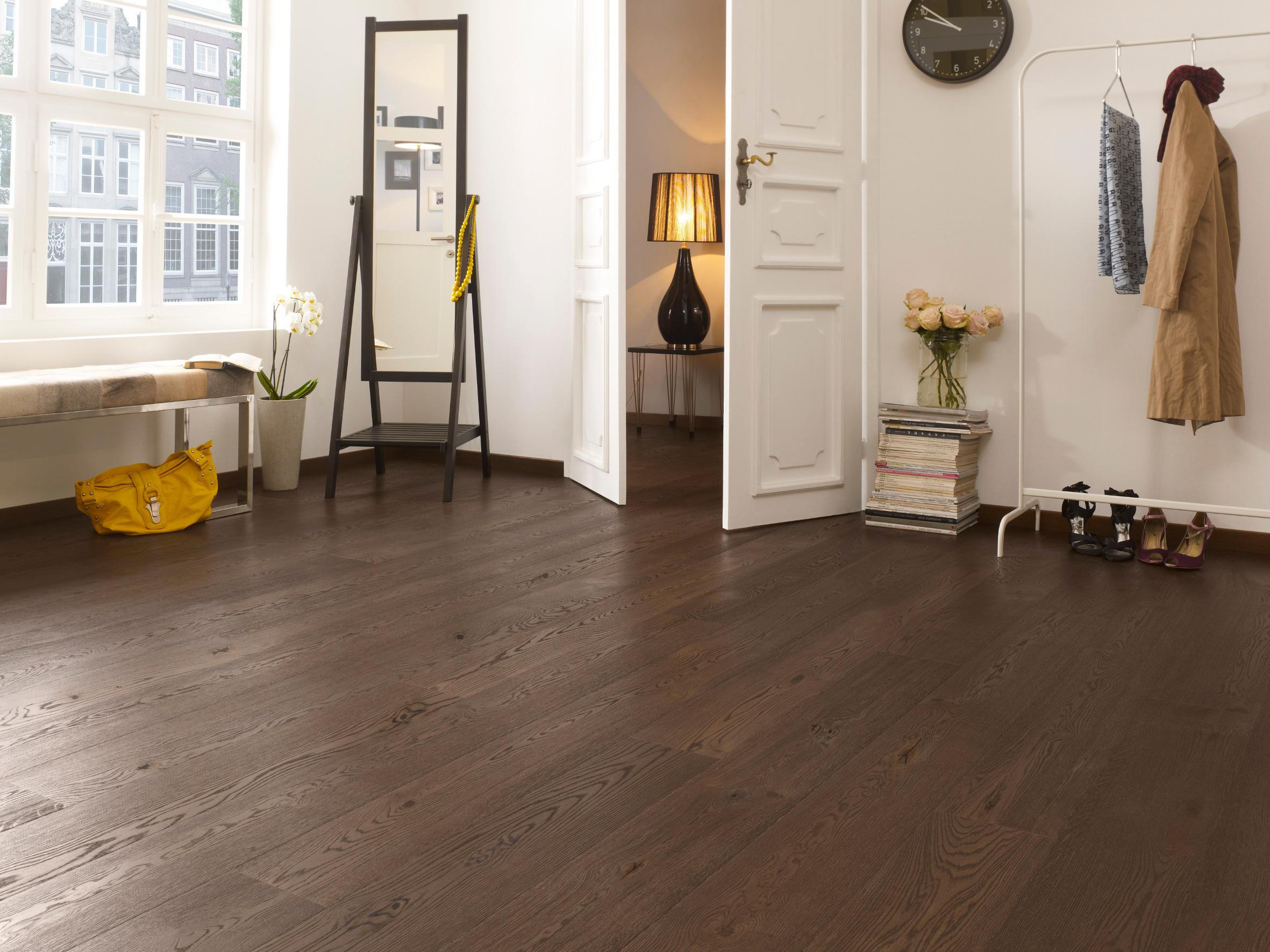 Dette er Tarketts mest eksklusive parkettgulv, med brede og ekstra lange eikeplanker. Det kommer i fire farger, i ulike brun- og gråtoner.