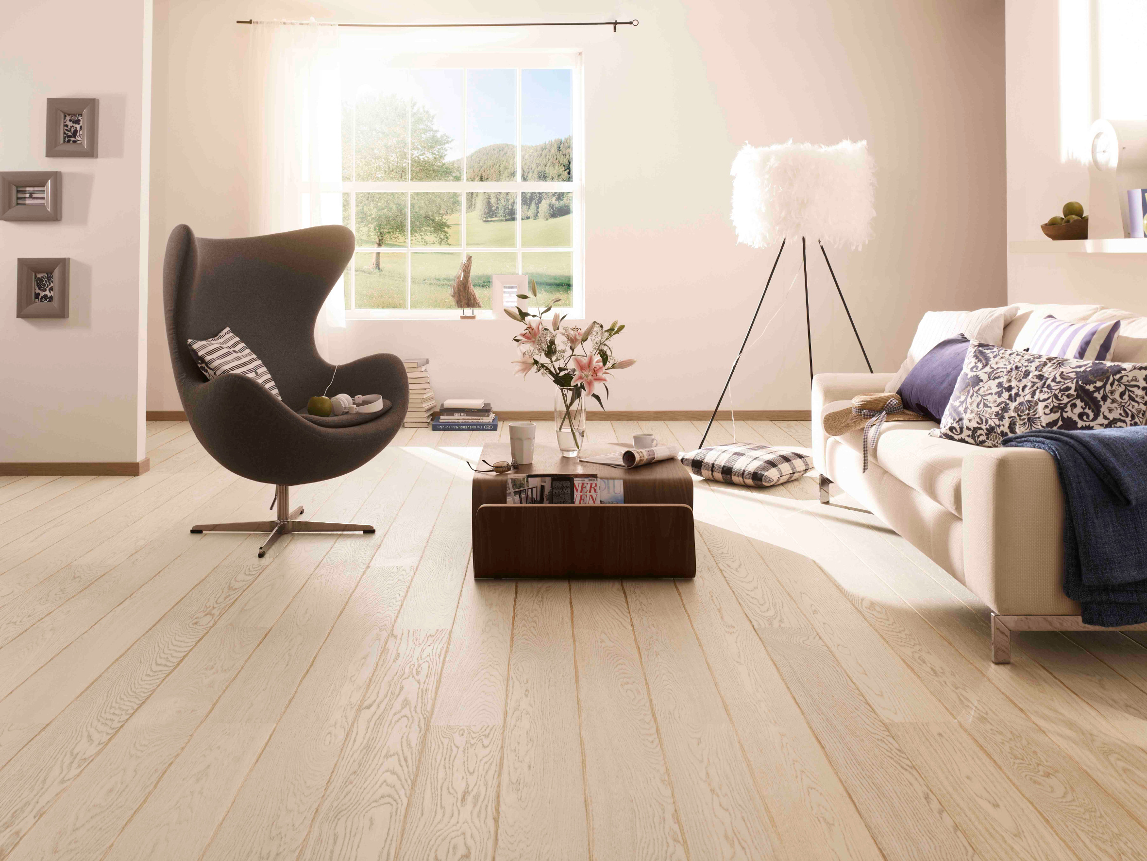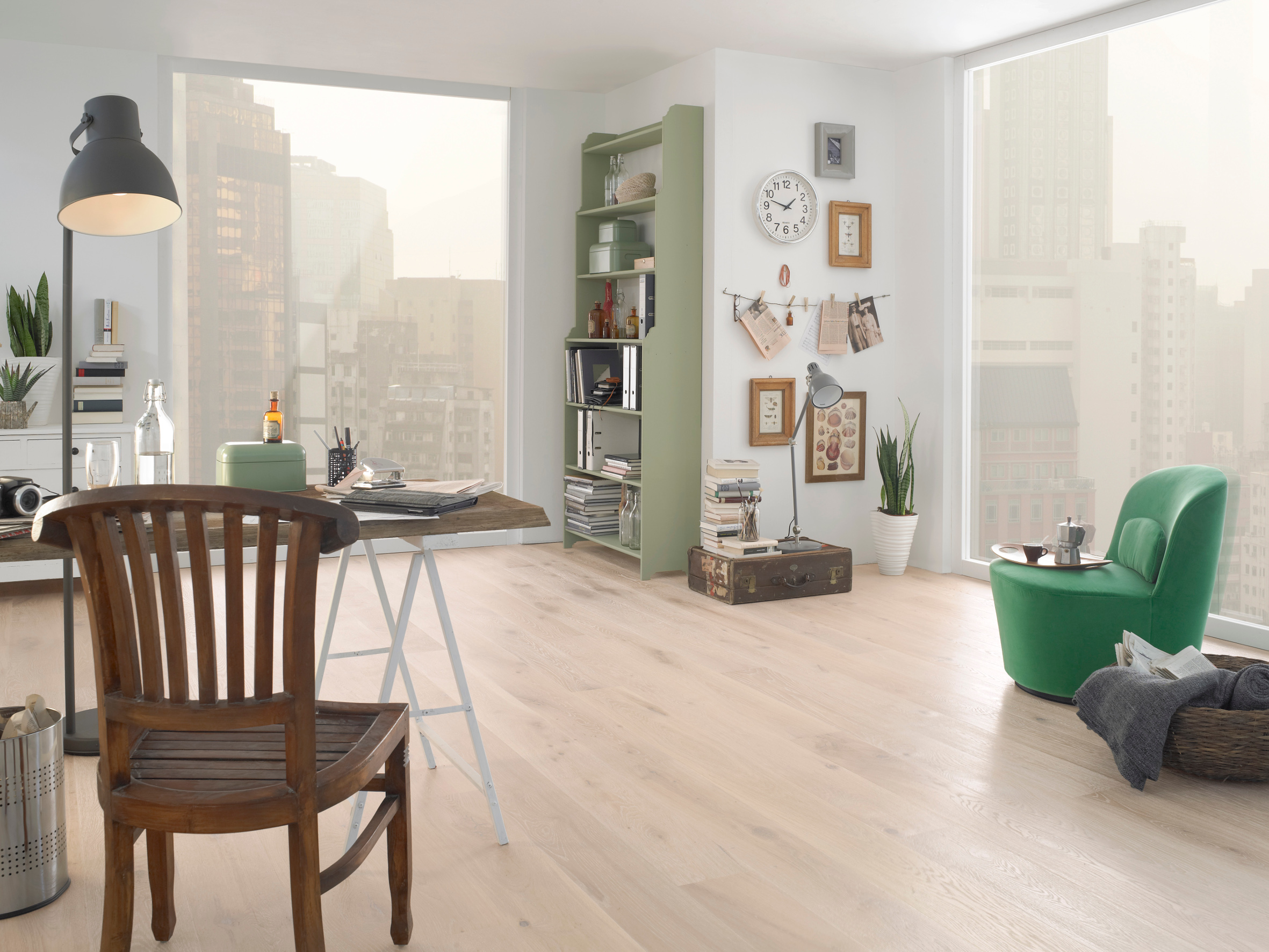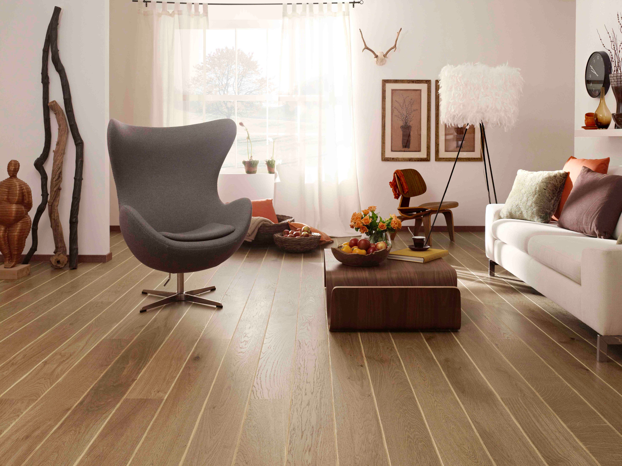 Dette er Tarketts mest eksklusive parkettgulv, med brede og ekstra lange eikeplanker. Det kommer i fire farger, i ulike brun- og gråtoner.