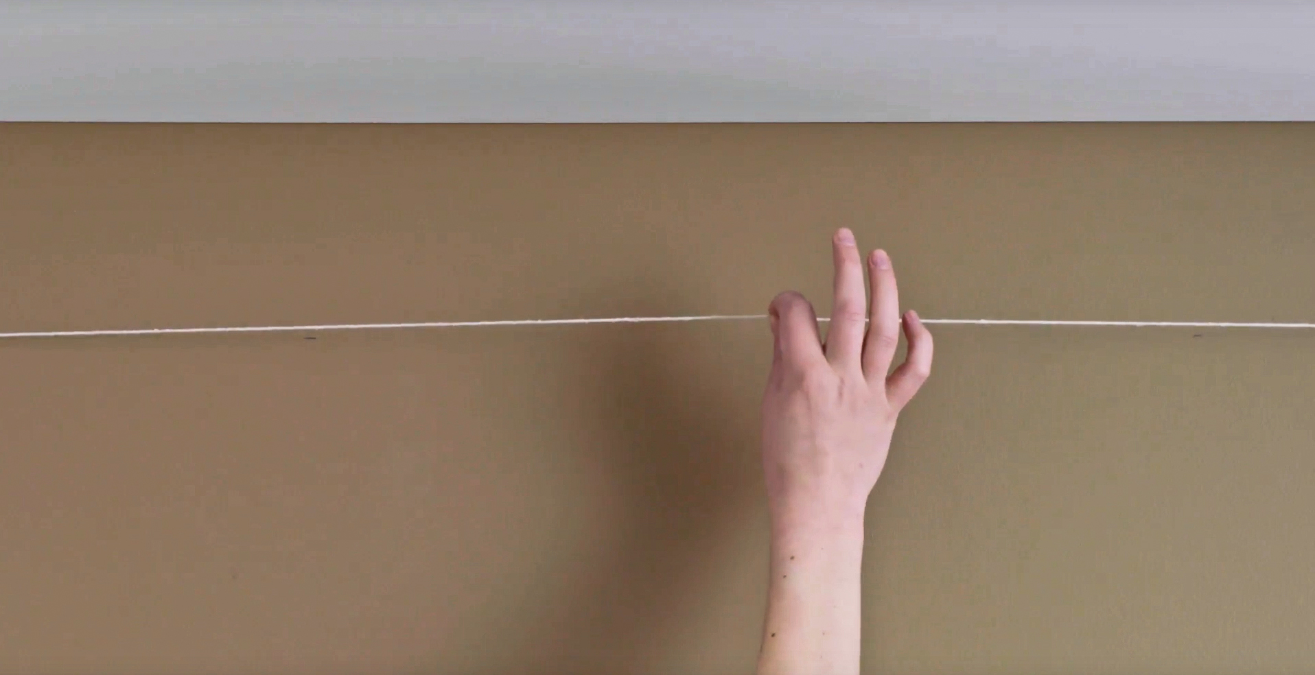 Når malingen er tørr, kan du måle opp hvor bred stripen skal være. Merk med blyant flere steder i den bredden du ønsker. Dra en lengde hyssing over et kritt, og strekk hyssingen langs veggen der du har merket. Fest hyssingen med maskeringstape i endenen, kontroller at den er rett, og trekk hyssingen bakover og slipp, slik at den etterlater seg en hvit stripe på veggen. Du kan også bruke laservater eller målbånd.