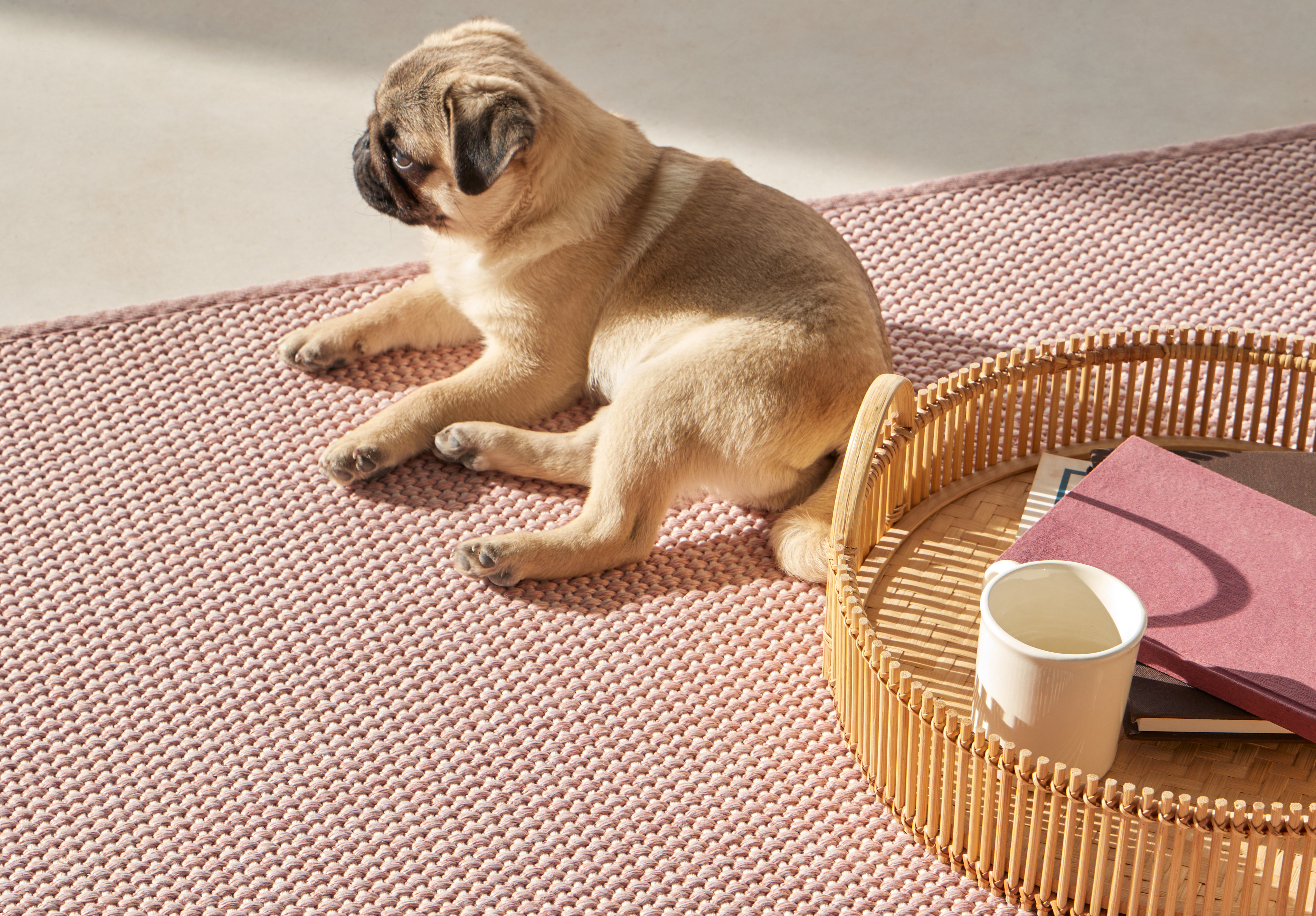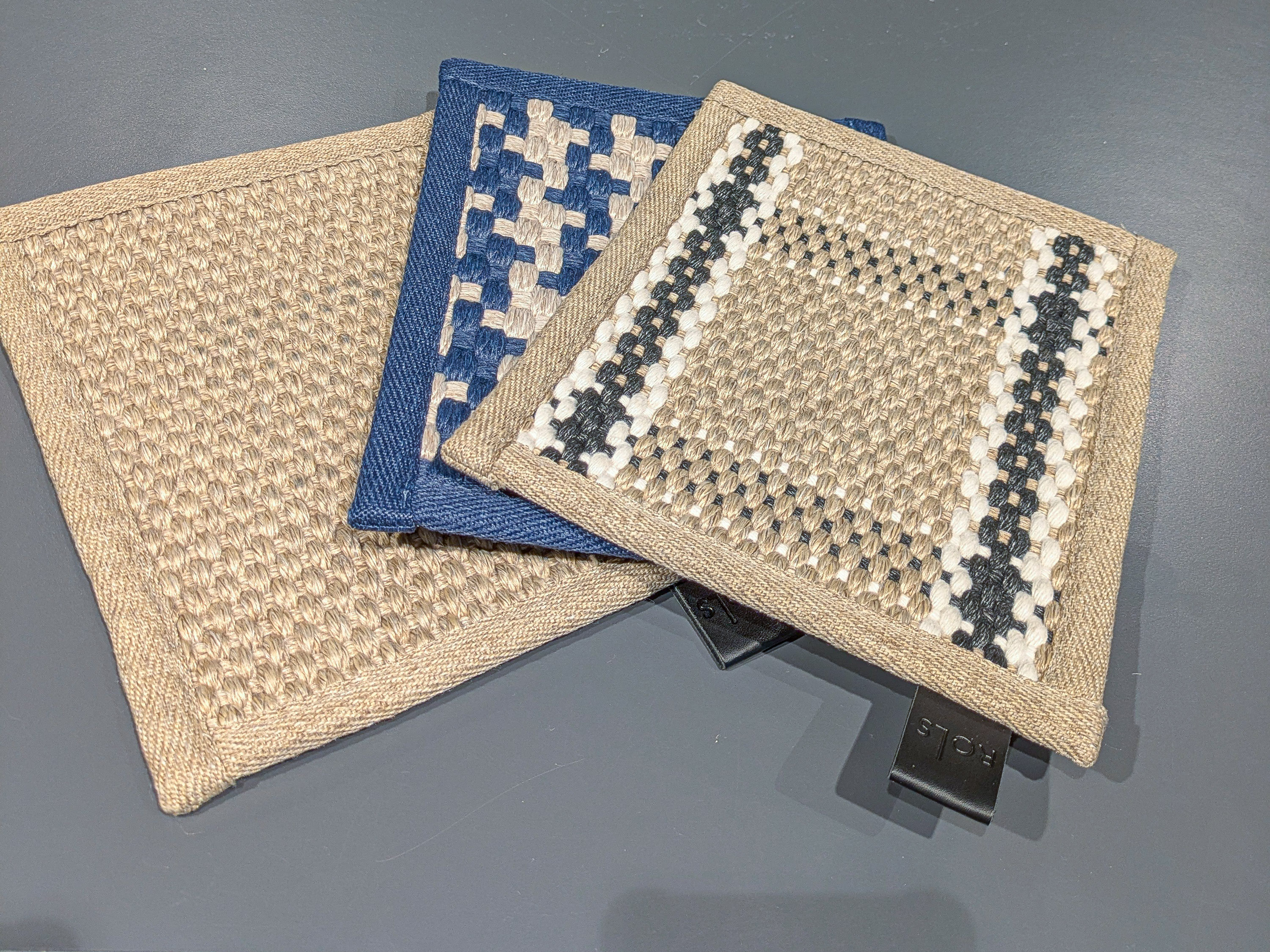 Hun viser frem heng etter heng med tekstilprøver: gardinstoffer som blender av solen, men slipper inn lys og fortsatt gir utsyn, vevde og trykte pyntetekstiler til gardiner, puter og duker og møbeltekstil med striper, blomster eller bouclé-effekt. Lettere og tyngre stoffer som både ser ut som og føles som et hvilket som helst interiør- eller møbeltekstil, og små prøver på tepper som skulle kunne ha vært sisal eller jute, men som er laget av syntetiske, robuste materialer.