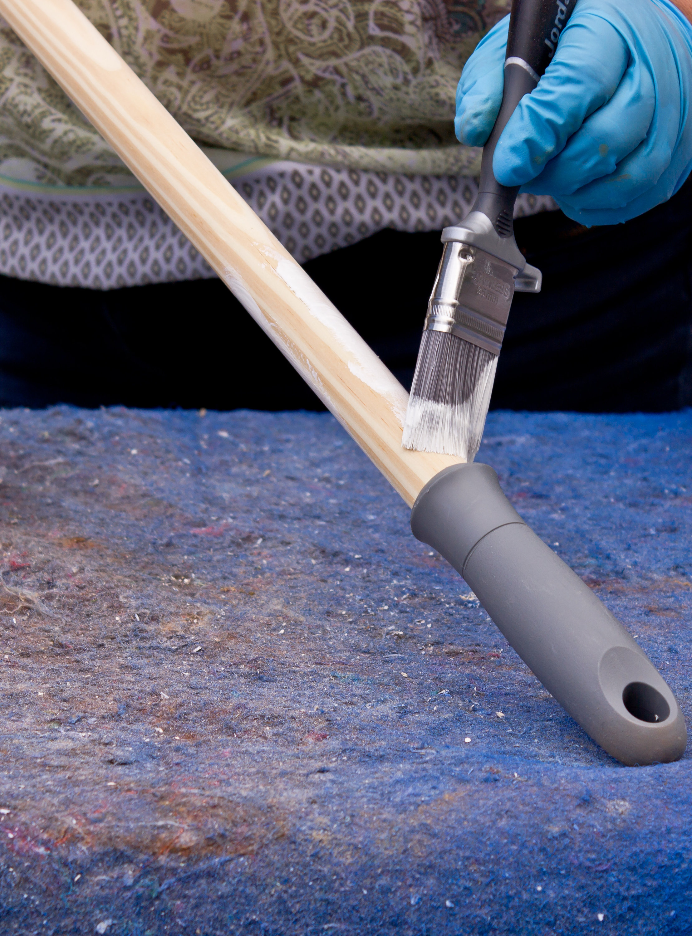 For å dekorere skaftet surret vi maskeringstape rundt det i et stripemønster. Vi brukte tapens bredde som avstandsmåler for å lage de hvite og blå stripene like brede. For å få skarpe kanter mellom de ulike fargene forseglet vi tapen med hvit bunnfarge.