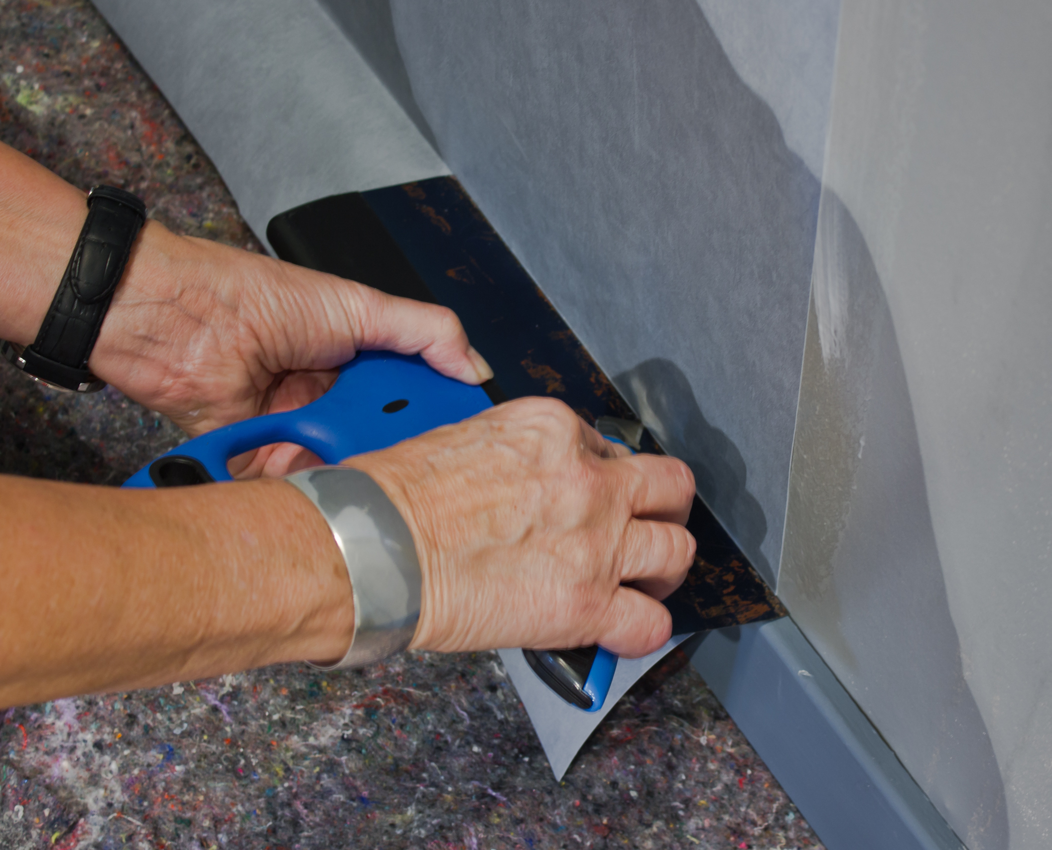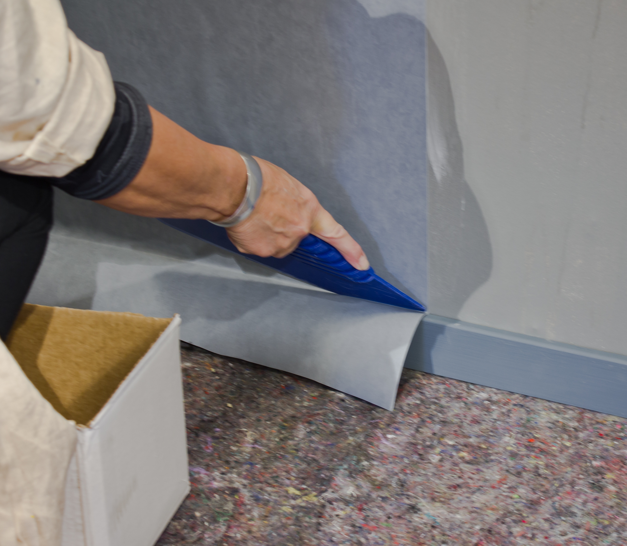 Renskjær: Så er tiden inne for å renskjære tapetet mot gulv- og taklist. Den operasjonen tar vi i to trinn. Her kommer den spisse enden på tapetsletteren til sin rett. Med den presses tapetet godt ned i hjørnet mot veggen. Vi jobber med faste bevegelser langs med listen slik at det blir en god brett på tapetet. Da er vi klar for trinn to: Selve kuttingen. Til det bruker vi en bred stålsparkel og sylskarp tapetkniv. Stålsparkelen legges ned mot listen og presses helt inn til veggen, mens kniven føres langs sparkelbladet og helt ut.