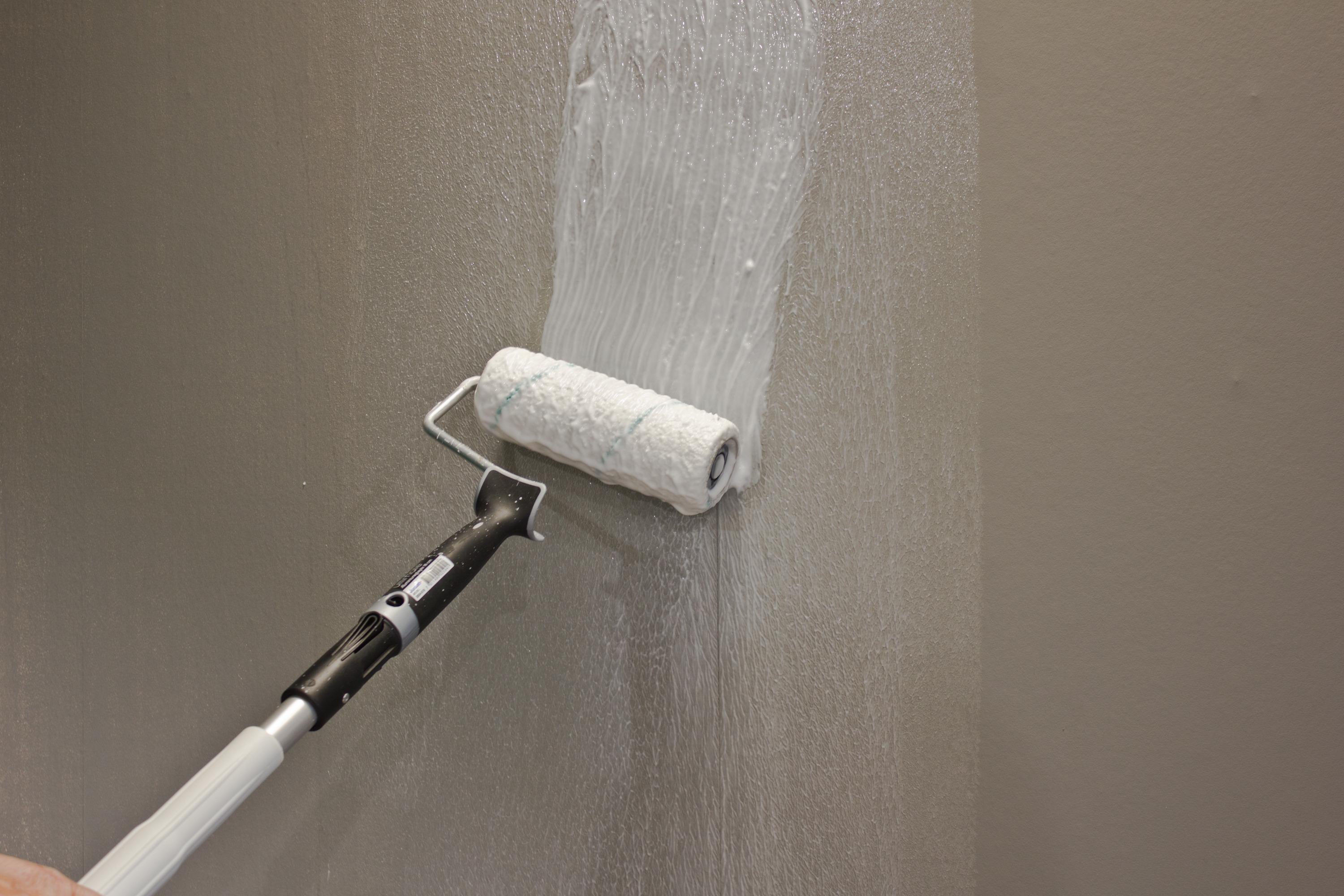 Ut med luften: Vi tuklet litt i starten, men det gjorde ingenting. Limet holdt seg fuktig og tapetet var sterkt, så det tålte fint at vi løsnet og justerte det et par ganger før vi fikk det på plass. For å få ut luftboblene fra baksiden brukes en tapetsletter i plast, vi stryker oppover, nedover og ut til sidene. Stryk fra midten og ut mot siden. Kommer det ut overflødig lim, vaskes det bort.