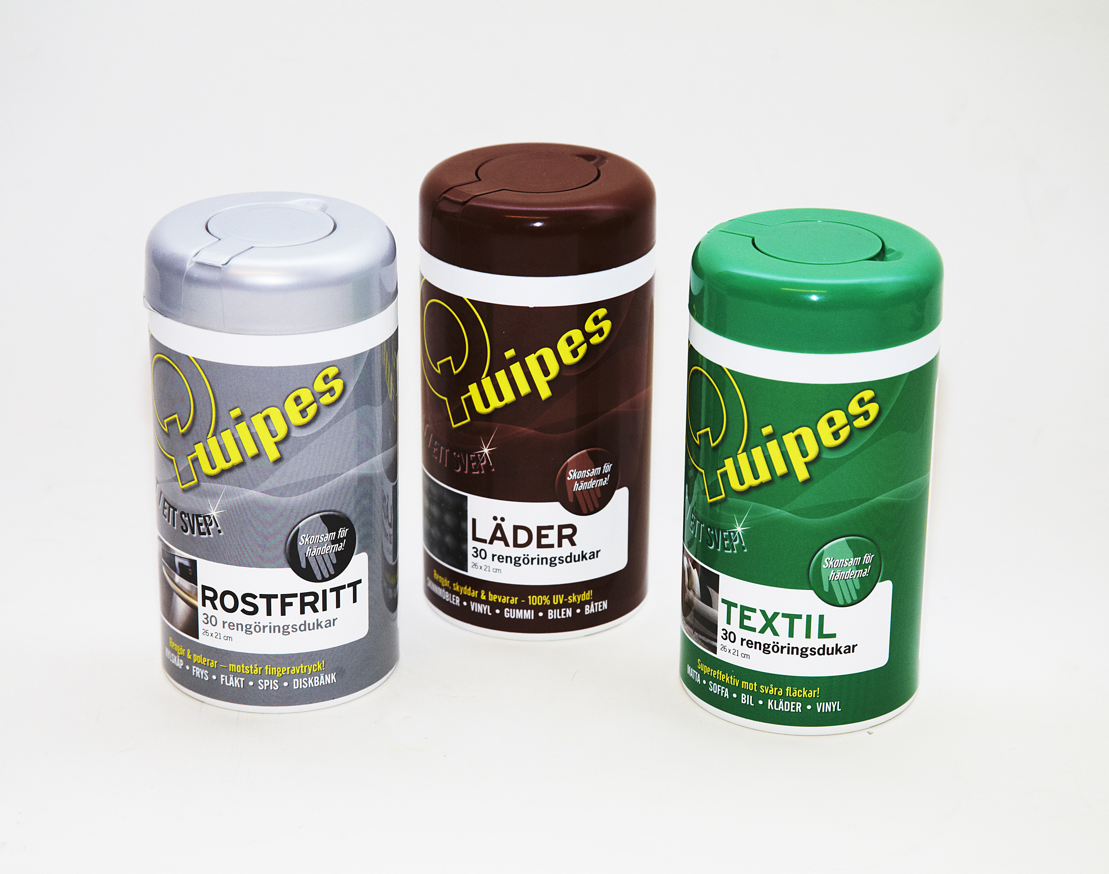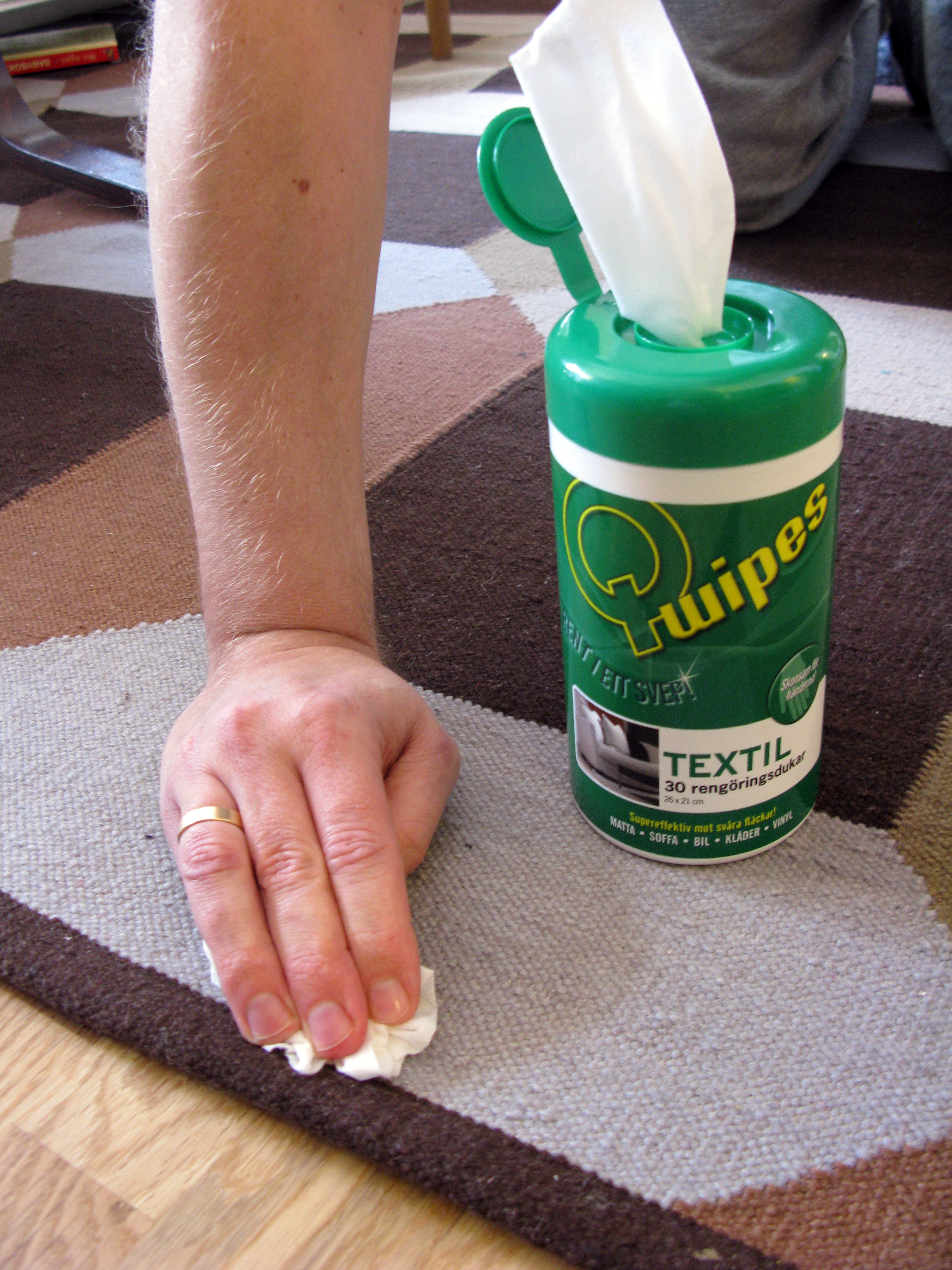 Q-wipes fjerner flekker av olje, fett, vin, kaffe og juice fra en rekke overflater.